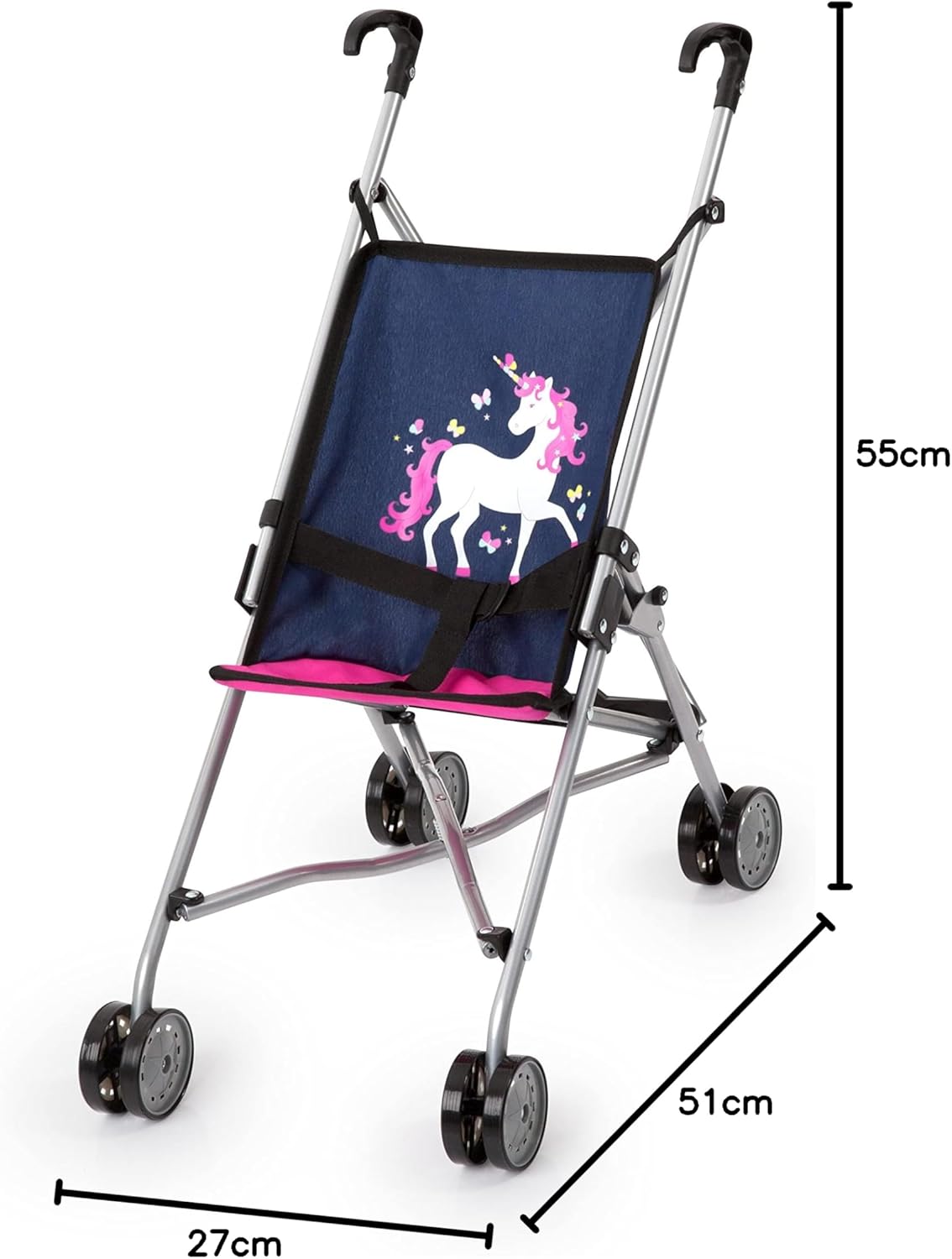 Questo moderno passeggino per bambole (Altezza: 55cm) è l'ideale per i piccoli che vogliono giocare a fare la mamma o il papà. Il passeggino per bambole può ospitare bambole fino a 46 cm di lunghezza. Con la cintura integrata è possibile assicurare le bambole o gli animali di peluche. Grazie alle doppie ruote lisce e alla pratica impugnatura, ogni passeggiata sarà un evento gioioso. La passeggino per bambole è molto facile da richiudere per il trasporto.