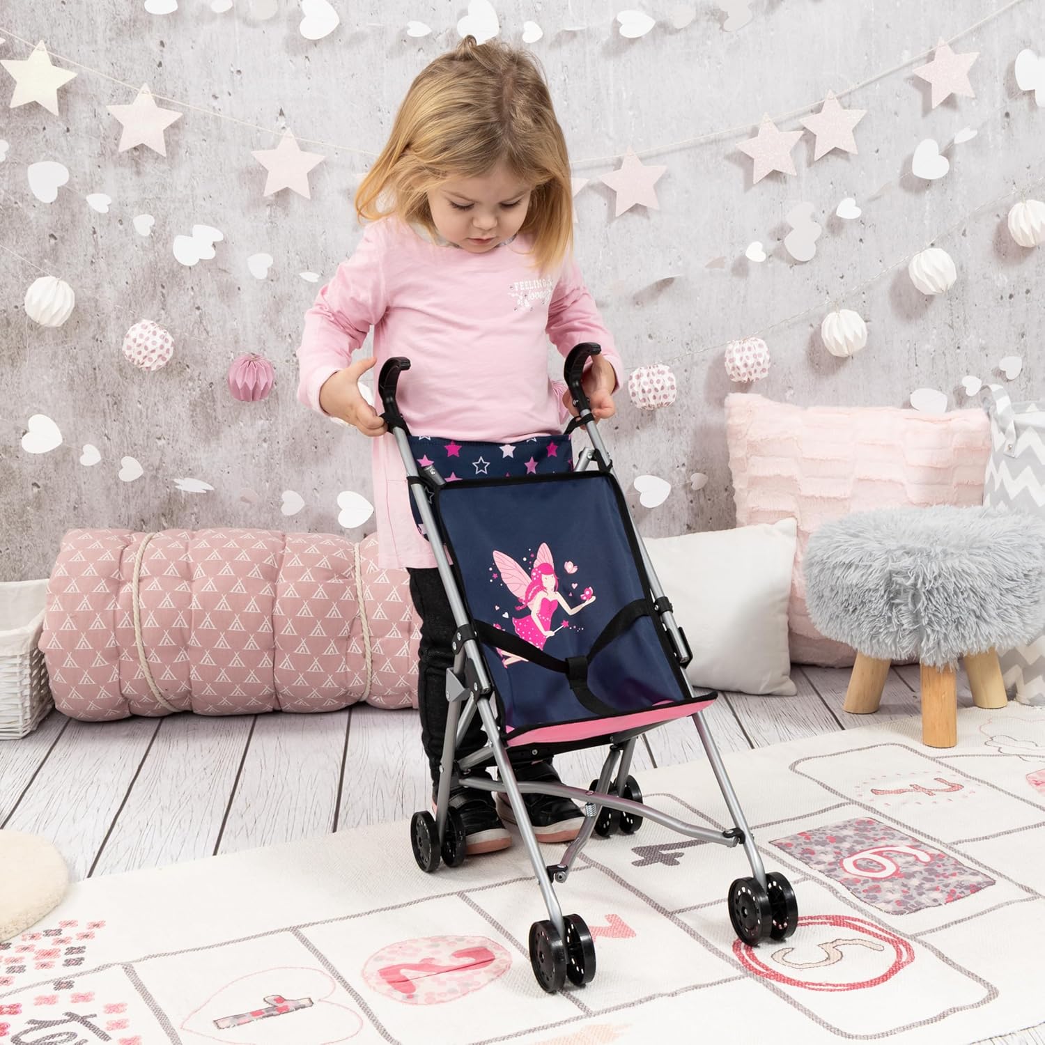 Il passeggino per bambole con borsa può ospitare bambole fino a 46 cm di lunghezza Con la cintura integrata è possibile assicurare le bambole o gli animali di peluche Grazie alle doppie ruote, ogni passeggiata sarà un evento gioioso Questo passeggino per bambole è molto facile da richiudere per il trasporto Altezza: 56cm (Dimensioni: 47cm x 27cm x 56cm)
