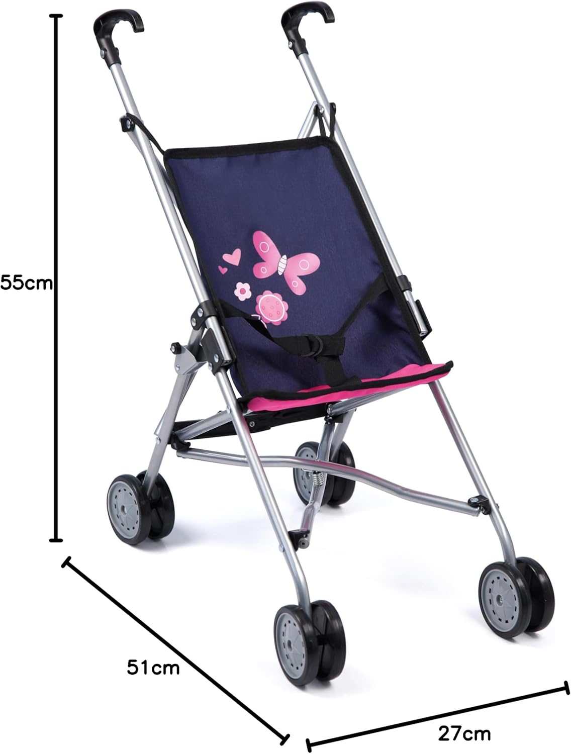 Questo moderno passeggino per bambole (Altezza: 55cm) è l'ideale per i piccoli che vogliono giocare a fare la mamma o il papà. Il passeggino per bambole può ospitare bambole fino a 46 cm di lunghezza. Con la cintura integrata è possibile assicurare le bambole o gli animali di peluche. Grazie alle doppie ruote lisce e alla pratica impugnatura, ogni passeggiata sarà un evento gioioso. La passeggino per bambole è molto facile da richiudere per il trasporto.