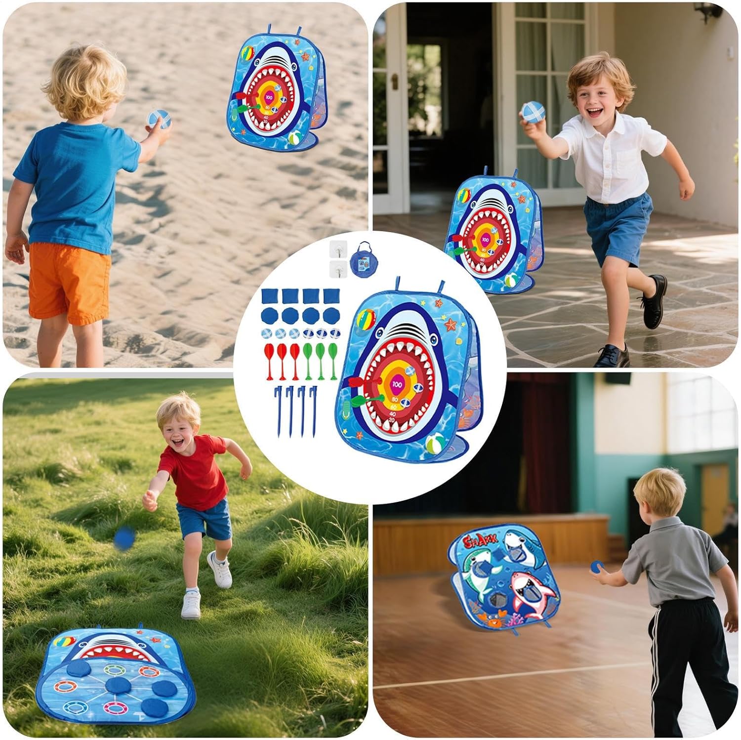 Gioco mobile: sia sul prato del giardino che in salotti, questo gioco di lancio garantisce una rapida prontezza e un cambio di scena senza interruzioni per partite o tornei sciolti Promozione delle abilità: migliora la coordinazione del corpo attraverso esercizi di lancio mirati, affina la precisione della pista di lancio e affina la percezione spaziale per lo sviluppo completo delle abilità Stabile e sicuro: la morbida superficie antiscivolo dei sacchetti e il robusto materiale resistente all'abrasione garantiscono un piacere sicuro, eliminano i problemi di lesioni in modo che i bambini di tutte le età possano partecipare senza sforzo Giocabilità migliorata: il gioco di lancio con istruzioni per immagini e un raffinato pacchetto di accessori favorisce il gioco cooperativo di più persone, offre varianti di gioco flessibili e abbastanza sacchi di sabbia per una maggiore dinamica e divertimento insieme. Design brillante: appositamente progettato per bambini in età prescolare dai 3 ai 5 anni con un motivo dinamico di squalo dai colori vivaci. Promuove l'esplorazione giocosa e la stimolazione sensoriale attraverso un design visivo accattivante.