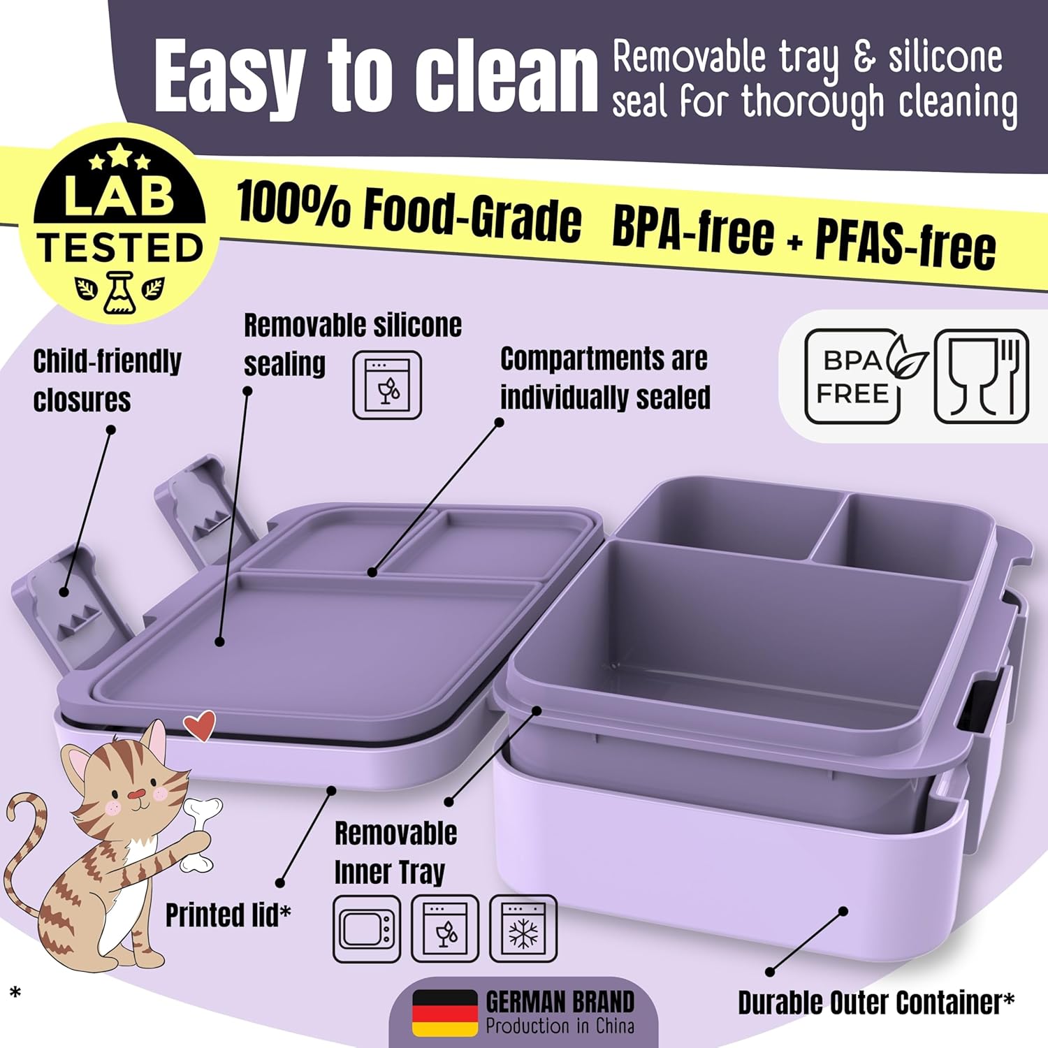 Leggero e compatto: questo pratico contenitore per bento ad alta capacità e peso leggero, perfetto per l'asilo, la scuola o in viaggio. A prova di perdite e flessibile: con una robusta guarnizione in silicone e un inserto resistente al microonde, tutto rimane al sicuro. Contenitore per salse extra per pasti versatili. Creativo e individuale: include 84 adesivi con lettere – genitori e bambini possono creare il contenitore per il pranzo come desiderato. Perfetto per ragazze e ragazzi Facile da pulire e sicuro: senza BPA, facile da pulire e da congelare. Realizzato in materiale alimentare e testato da un laboratorio indipendente. ️ Chiusure adatte ai bambini: le chiusure appositamente progettate rendono il Bento Box per bambini facile da aprire e chiudere, perfetto per l'uso a scuola, all'asilo o in viaggio Sostenibile ed elegante: il contenitore per il pranzo convince per il design unico disegnato a mano ed è la scelta ecologica ideale per l'uso quotidiano.
