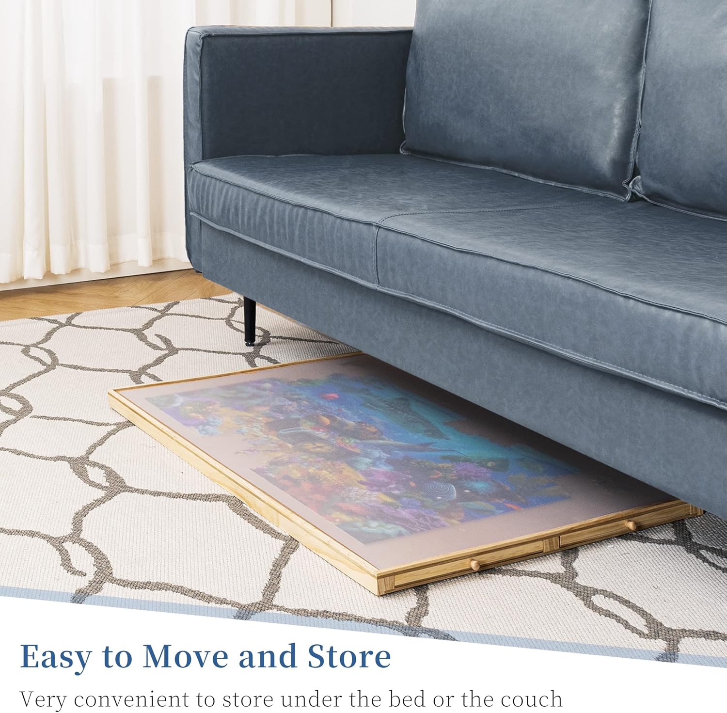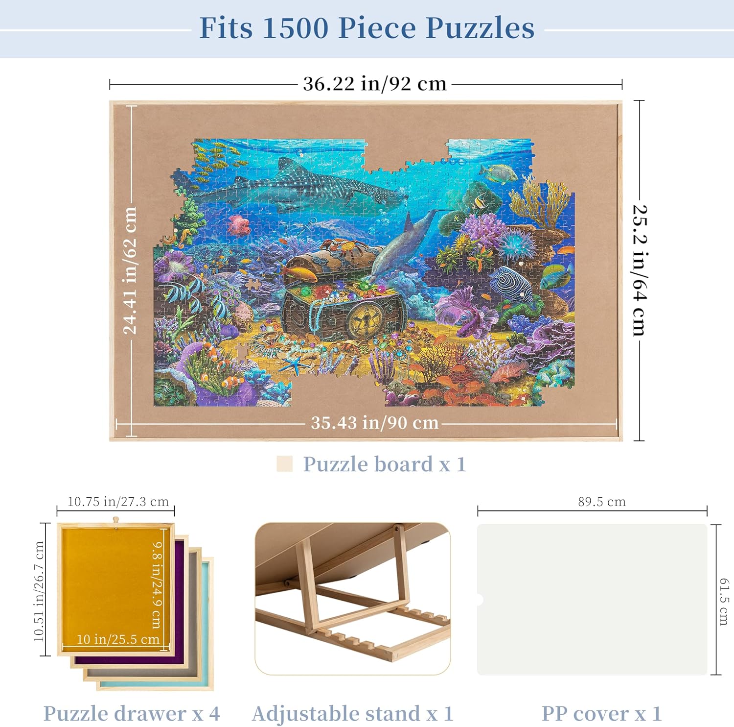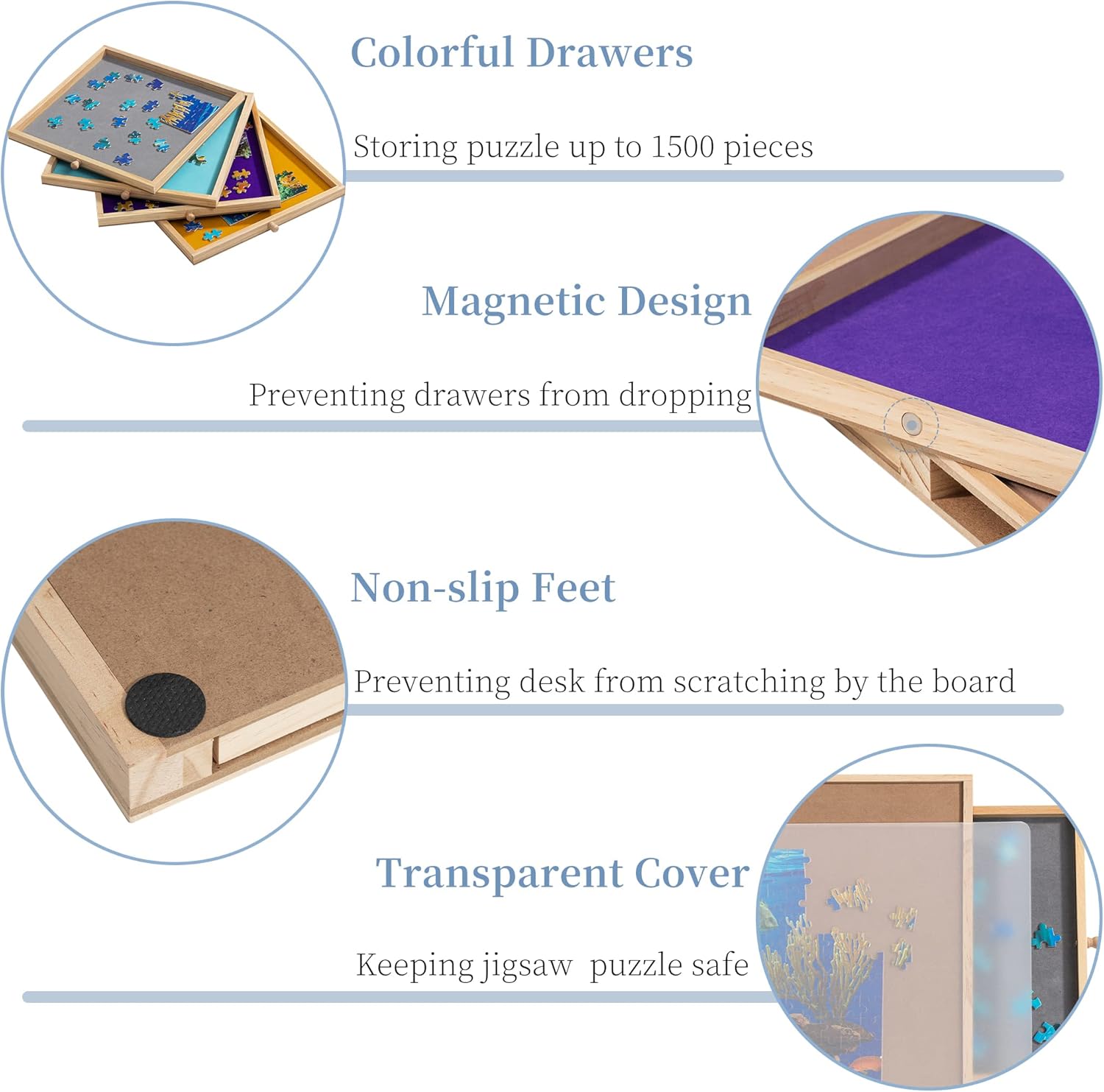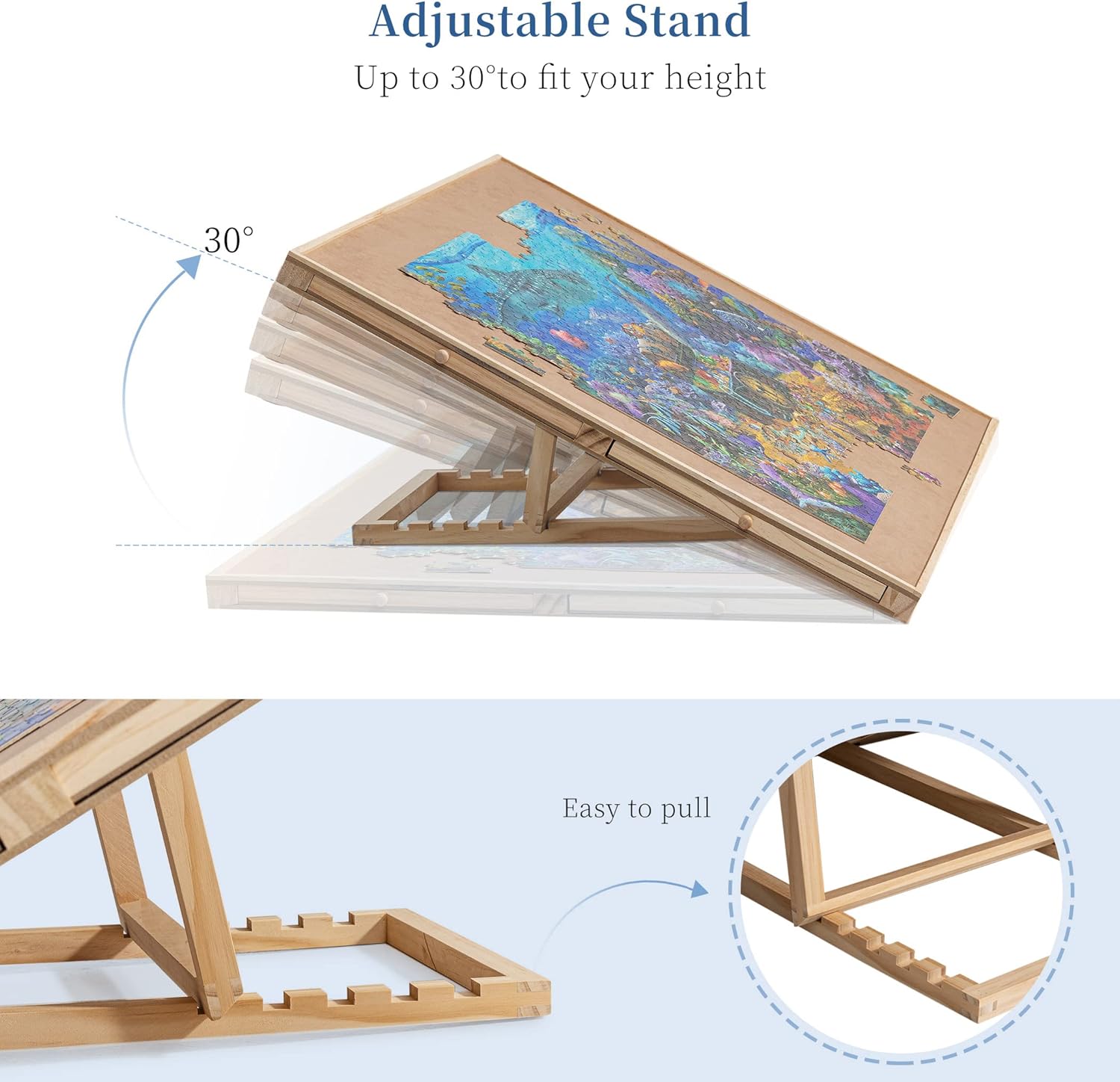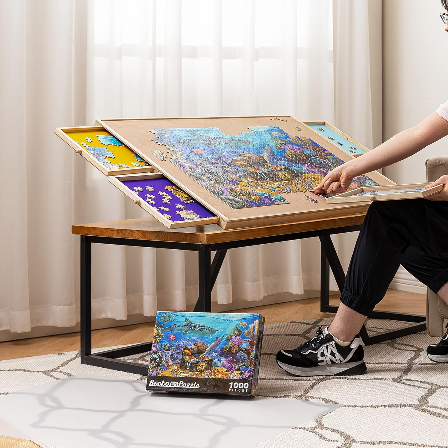 Supporto monopezzo - Sono disponibili 5 regolazioni di angolo, con un angolo di inclinazione massimo di 30°. Puoi sempre regolare la tabella dei puzzle al tuo preferito ed evitare torcicollo e mal di schiena. Goditi sempre il tuo puzzle divertente senza pressione! Vassoi colorati e copertura: 4 cassetti di colori non solo aiutano a ordinare i pezzi del puzzle, ma rendono anche facile riporre il tuo gioco di puzzle incompiuto. Ogni cassetto è dotato di un piccolo magnete per tenerli chiusi quando non in uso e impedire che i pezzi di puzzle cadano e mancano. Una copertura in PP è anche racchiusa per proteggere i tuoi puzzle da polvere, macchie o animali domestici cattivi. Facile da trasportare e riporre: potresti divertirti ovunque tu voglia, poiché è abbastanza leggero da essere spostato senza sforzo. Ogni volta che hai bisogno di spazio extra o vuoi cenare, copri il piano del tavolo con il coperchio in PP, chiudi i cassetti e metti il tavolo dei puzzle sotto il divano o il letto. Lo stoccaggio sicuro e salvaspazio può essere raggiunto in pochi secondi. Tavolo puzzle da 1500 PC – Con un'area utilizzabile di 35,43 × 62 cm, applicabile alla maggior parte dei giochi di puzzle da 1500 pezzi. Rivestito in morbida flanella per aumentare l'attrito e per evitare che i pezzi del puzzle cadano. Robusto e durevole: lavorato in legno di pino naturale e MDF, robusto e durevole. Viene fornito con un cuscinetto antiscivolo sul retro per mantenere stabile il tavolo dei puzzle mentre ti godi il divertimento dei puzzle e anche per evitare che il piano del tavolo si graffi.