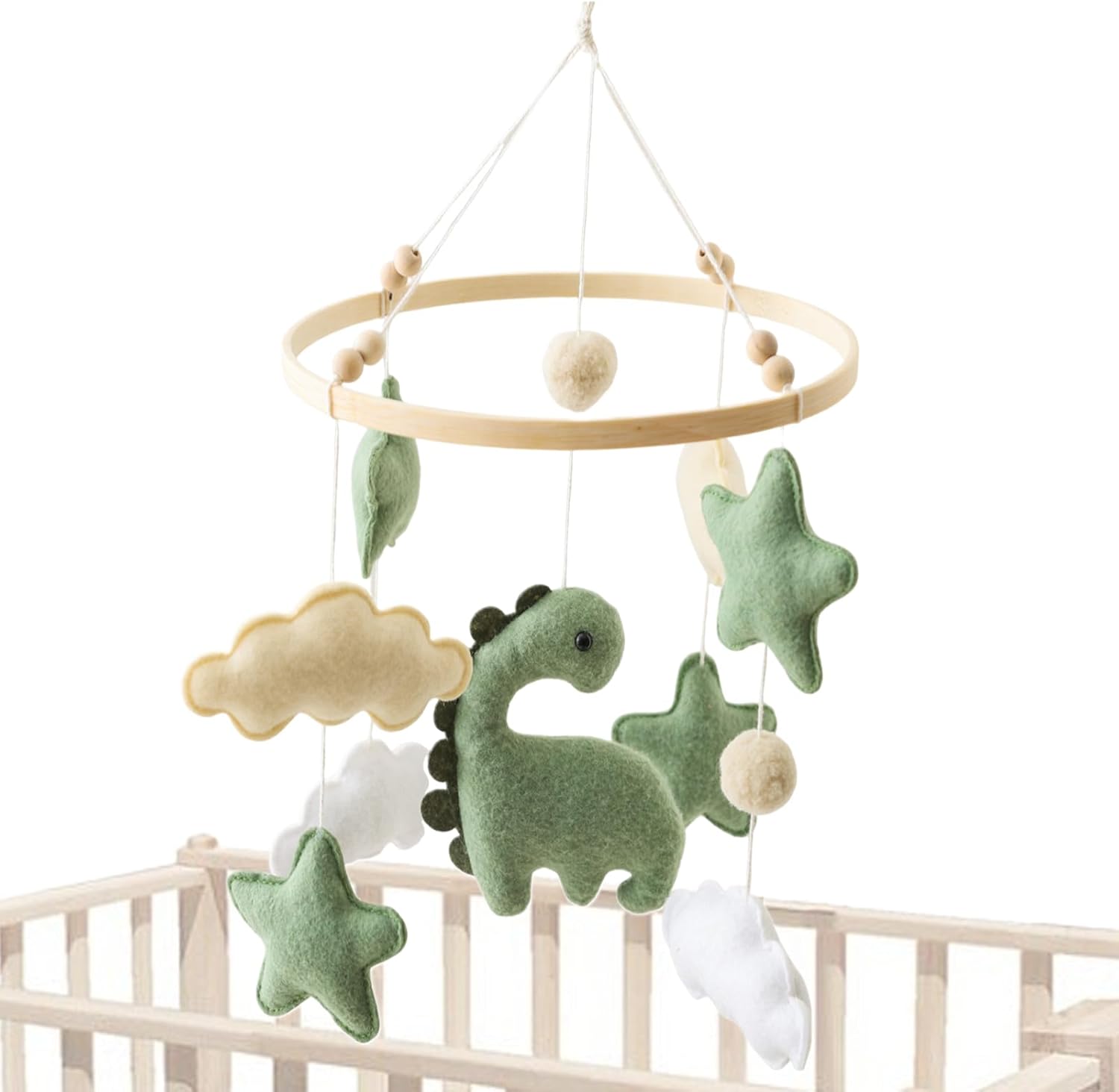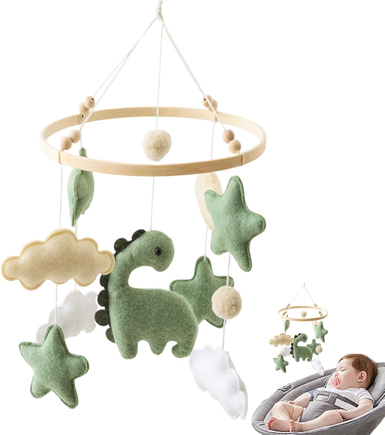 Nutrire serenità con stile: la culla girevole mobile adorna la culla del tuo bambino con un delizioso cellulare a forma di nuvole, legno naturale e morbido tessuto di cotone nei colori rilassanti del beige, e verde chiaro, con dinosauri amichevoli e stelle per un'atmosfera accogliente e rilassante Incoraggia l'apprendimento attivo: appendere la gioia mobile per i bambini nell'incantevole mix di colori e texture con il cellulare della bambina per la culla. Migliorare lo sviluppo cognitivo stimolando le capacità di tracciamento visivo e incoraggiando il riconoscimento del colore, accendere la curiosità tattile e supportare l'impegno multiplo sensoriale Scelta verde per bambini: Baby Mobile con campana realizzata con materiali ecologici, questo cellulare da ragazza integra cotone traspirante, infilato in fibra naturale e un telaio in legno sicuro per una soluzione di sdraiatura sostenibile e rilassante Vicinanza vicina: mobile letto per bambini con comodo cordino in cotone per regolazioni in altezza, questo cellulare cattura l'attenzione del bambino con la vicinanza agli occhi massimizzando lo spazio della culla. Goditi una portata verticale di 15,7 pollici e un tratto orizzontale da 9 pollici Miglioramento dell'esplorazione sensoriale: la culla musicale mobile realizzata con nuvole di cotone lisce e palline di cotone feltro, ornate con un affascinante motivo di dinosauro, questo cellulare da ragazza aumenta la scoperta tattile, sviluppa la capacità di differenziazione delle texture durante la veglia e contrasta le trame per l'impegno arricchente