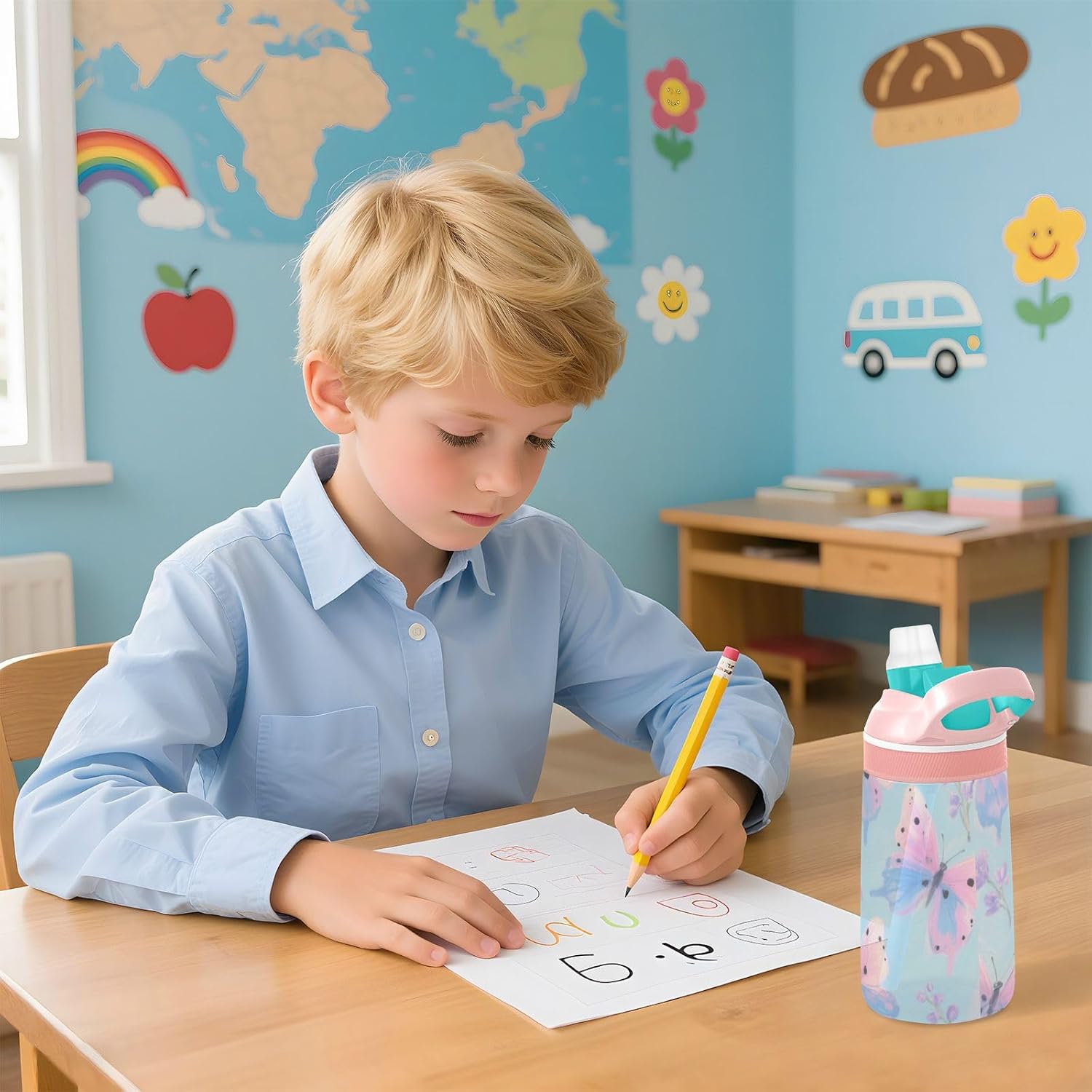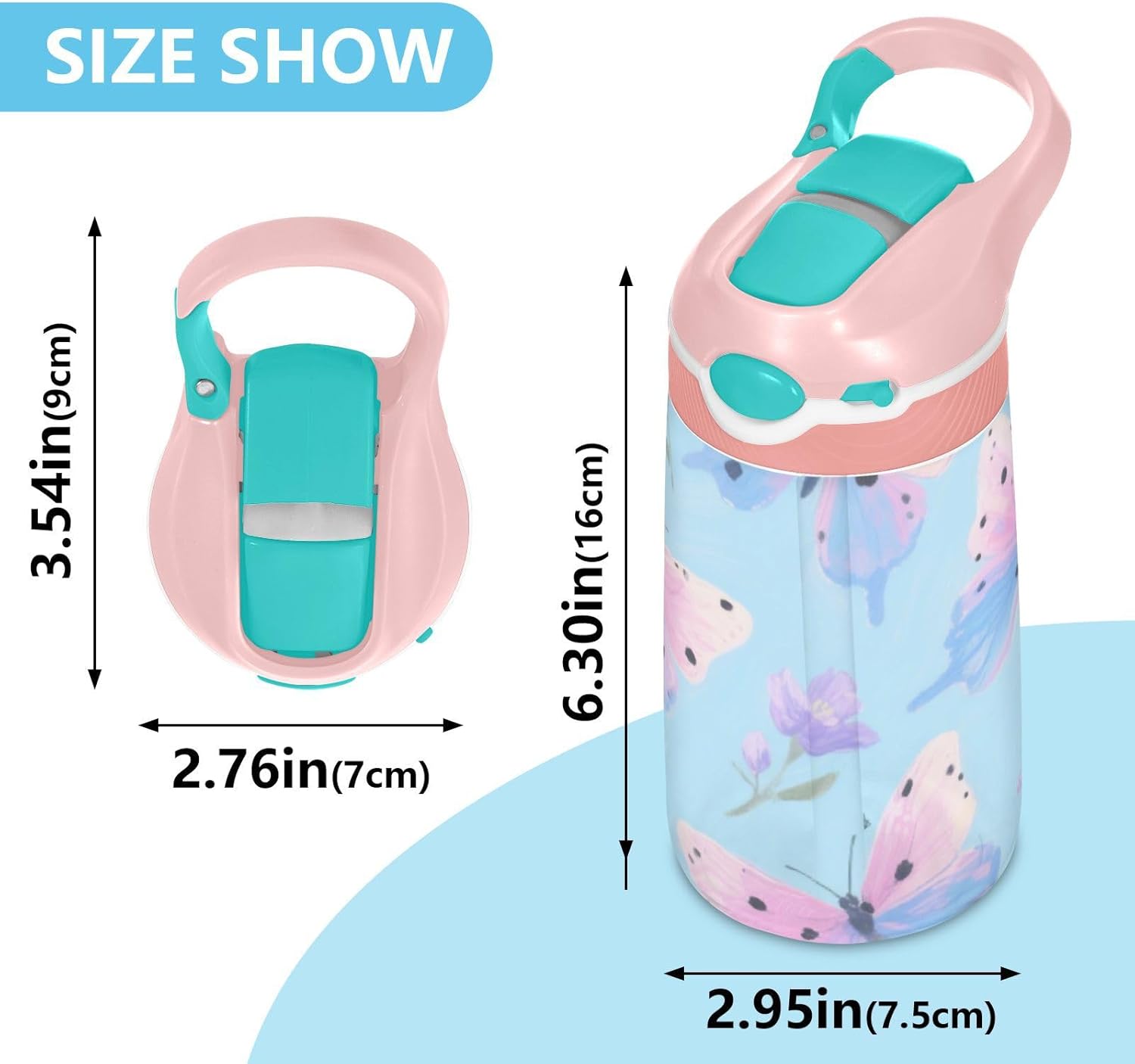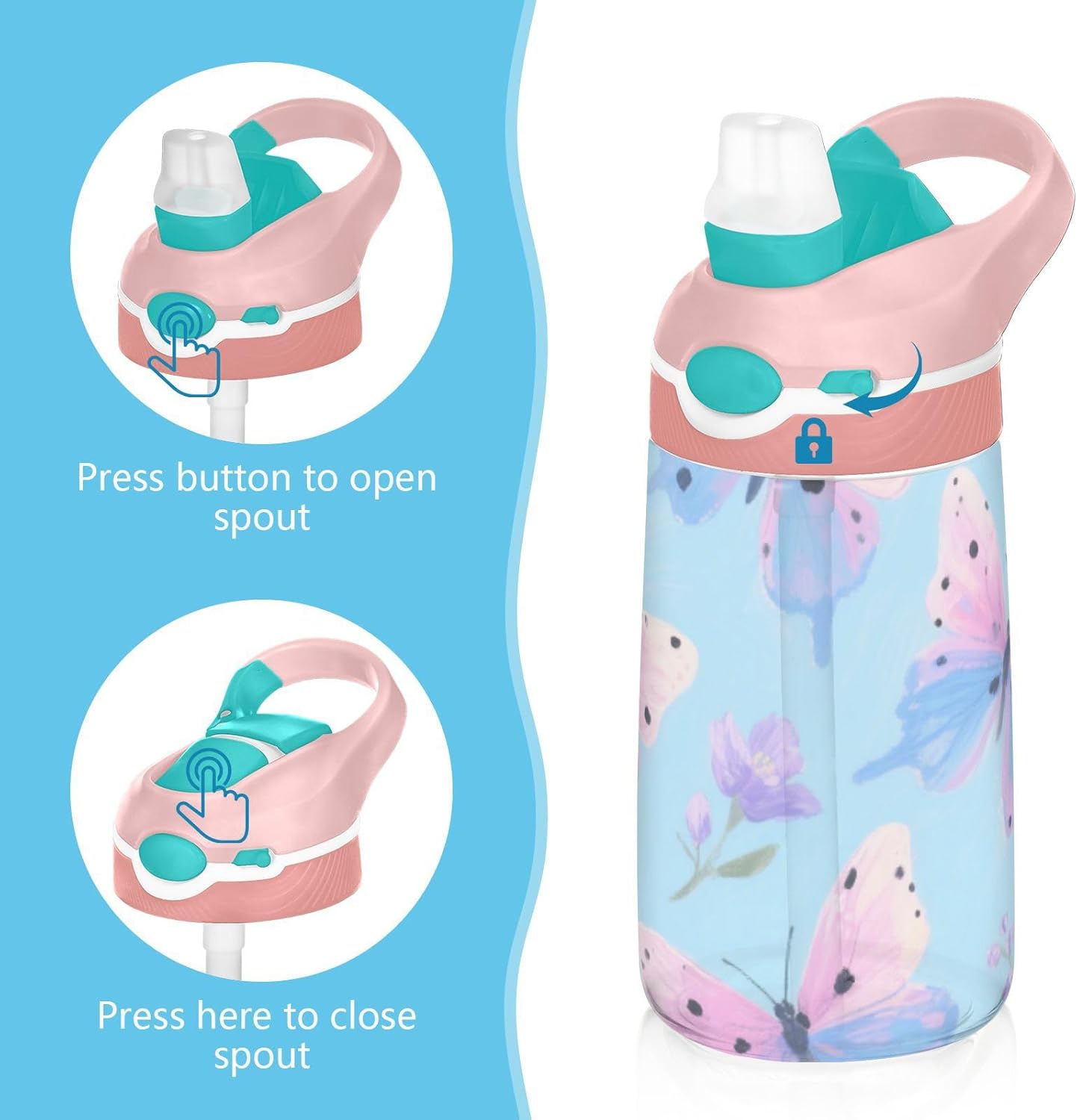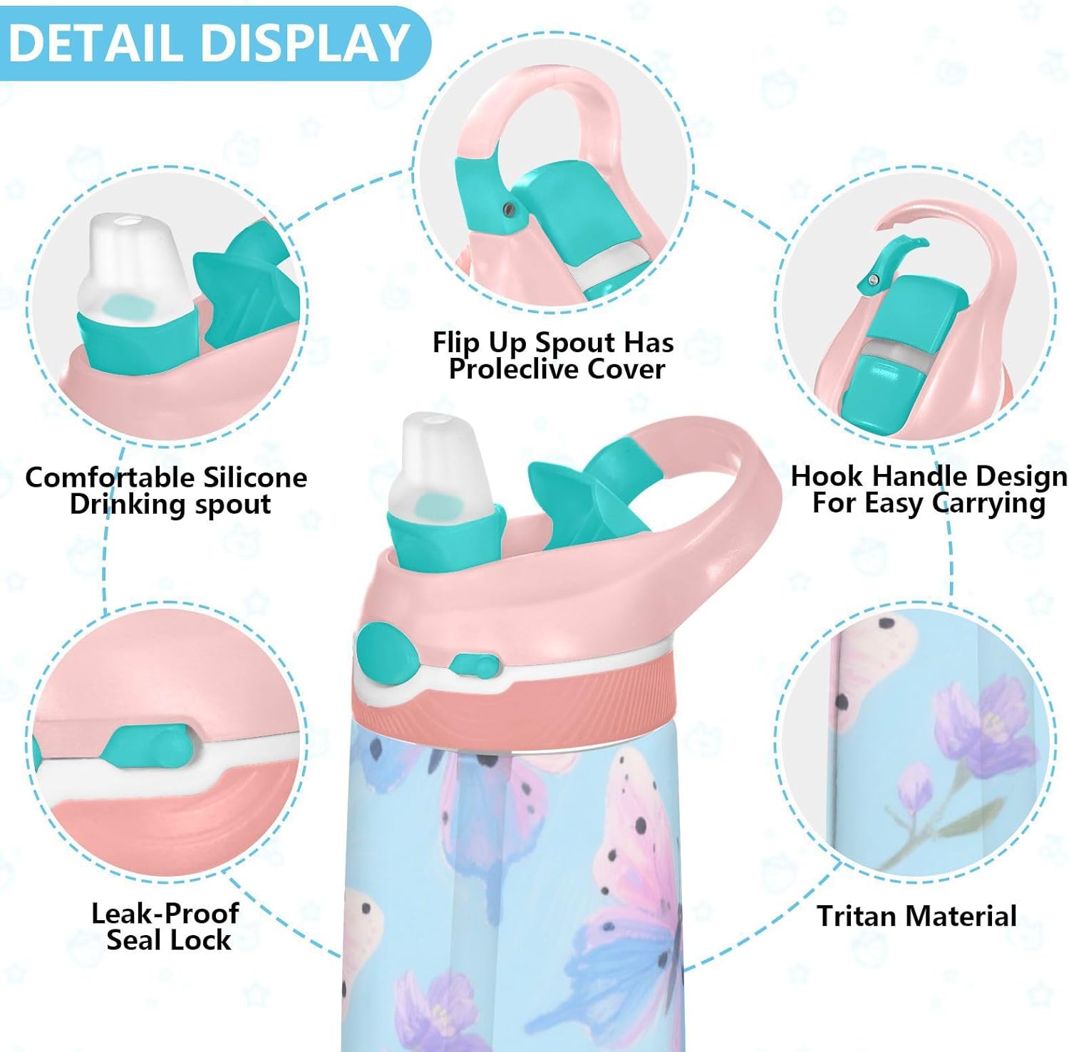 Materiali: questa borraccia sportiva da 480 ml (16 cm di lunghezza, 7,5 cm di larghezza) combina tritan e silicone alimentare. per la pratica sportiva o i giorni scolastici, è sicuro per i bambini da usare tutti i giorni. Non adatto a bambini di età inferiore ai 3 anni! Design portatile: l'ampio manico e il gancio per coperchio rendono la borraccia per bambini facile da trasportare. I bambini possono appenderlo alle loro borse, evitando il fastidio di cadere durante la ricreazione o i viaggi in autobus. Funzionamento amichevole: il becco d'anatra si adatta bene, con una copertura antipolvere. L'interruttore a pulsante della borraccia consente l'uso con una sola mano, in modo che i bambini possano idratarsi senza mettere giù i loro giocattoli o attrezzi sportivi. Blocco per evitare fuoriuscite: il blocco del pulsante della bottiglia d'acqua impedisce al becco d'anatra di fuoriuscire per errore. Niente più fuoriuscite negli zaini, mantenendo il pranzo e i libri asciutti. Facile da pulire: tutte le parti della borraccia possono essere smontate per evitare l'accumulo di sporco. Pulire con detergente neutro e acqua calda.