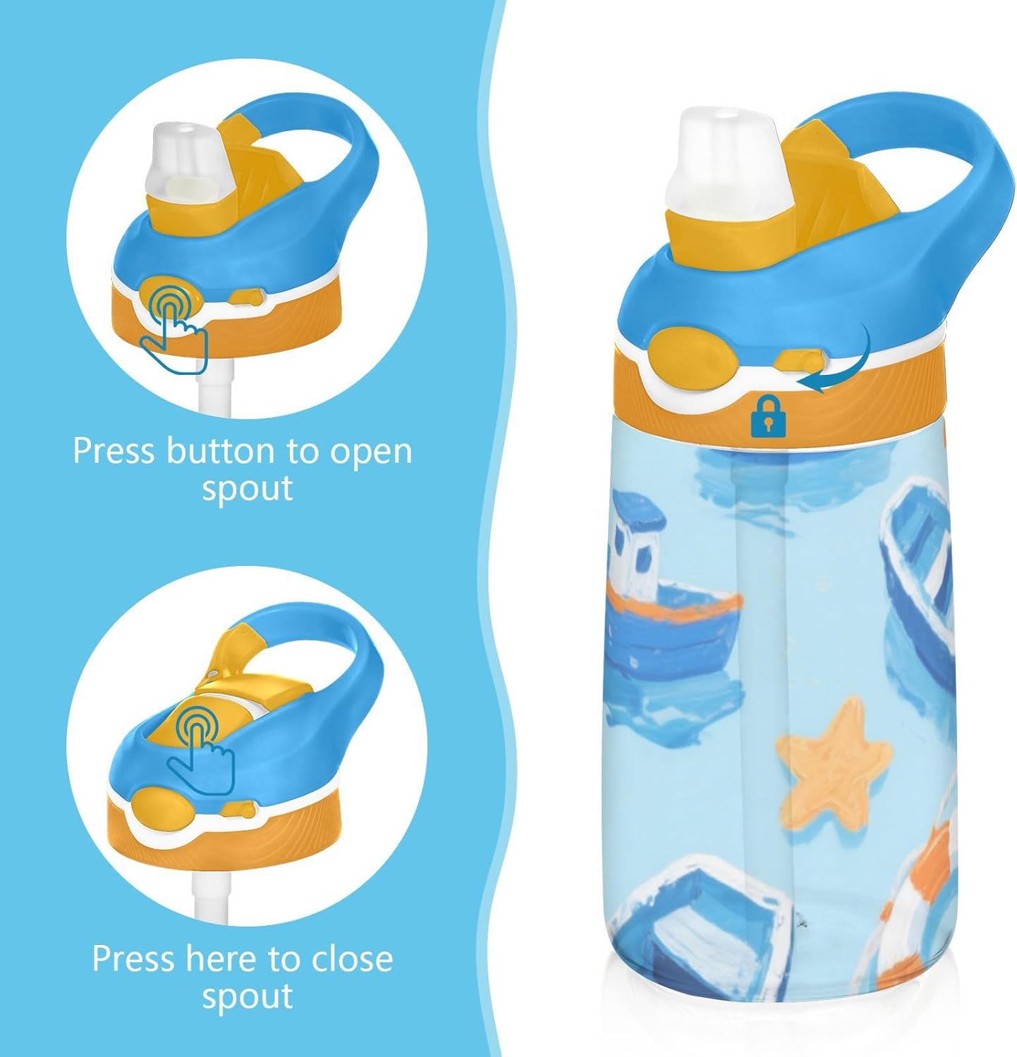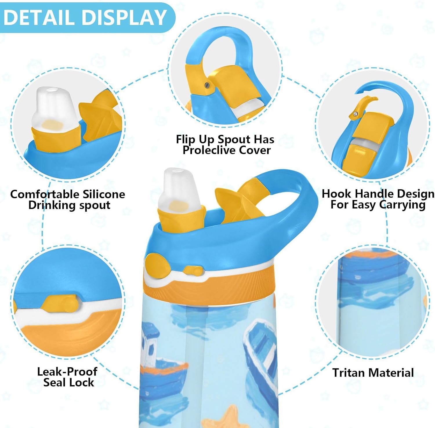 Materiale: questa borraccia per bambini da 16 x 7,5 cm con capacità di 480 ml è realizzata in tritan e silicone alimentare. Perfetto per le giornate scolastiche o per lo sport, è privo di elementi nocivi, affrontando le preoccupazioni dei genitori sui materiali non sicuri. Non adatto a bambini di età inferiore ai 3 anni! Comoda da trasportare: con un ampio manico per mani piccole e un gancio sul coperchio, la borraccia per bambini può essere appesa agli zaini. I bambini non faranno fatica a trasportarla durante le gite sul campo o le attività dopo la scuola. Uso senza problemi con una sola mano: il design a becco d'anatra si adatta alle bocche dei bambini, con una copertura antipolvere. L'interruttore a pulsante delle borracce sportive è facile da usare con una sola mano, anche quando giocano o corrono. Blocco per evitare fuoriuscite: il blocco del pulsante della bottiglia d'acqua impedisce al becco d'anatra di fuoriuscire per errore. Niente più fuoriuscite negli zaini, mantenendo il pranzo e i libri asciutti. Facile da pulire: tutte le parti della borraccia sono rimovibili per una pulizia accurata senza sporcare. Usa un detergente neutro e acqua calda: semplice per i genitori mantenere la pulizia per l'uso quotidiano.