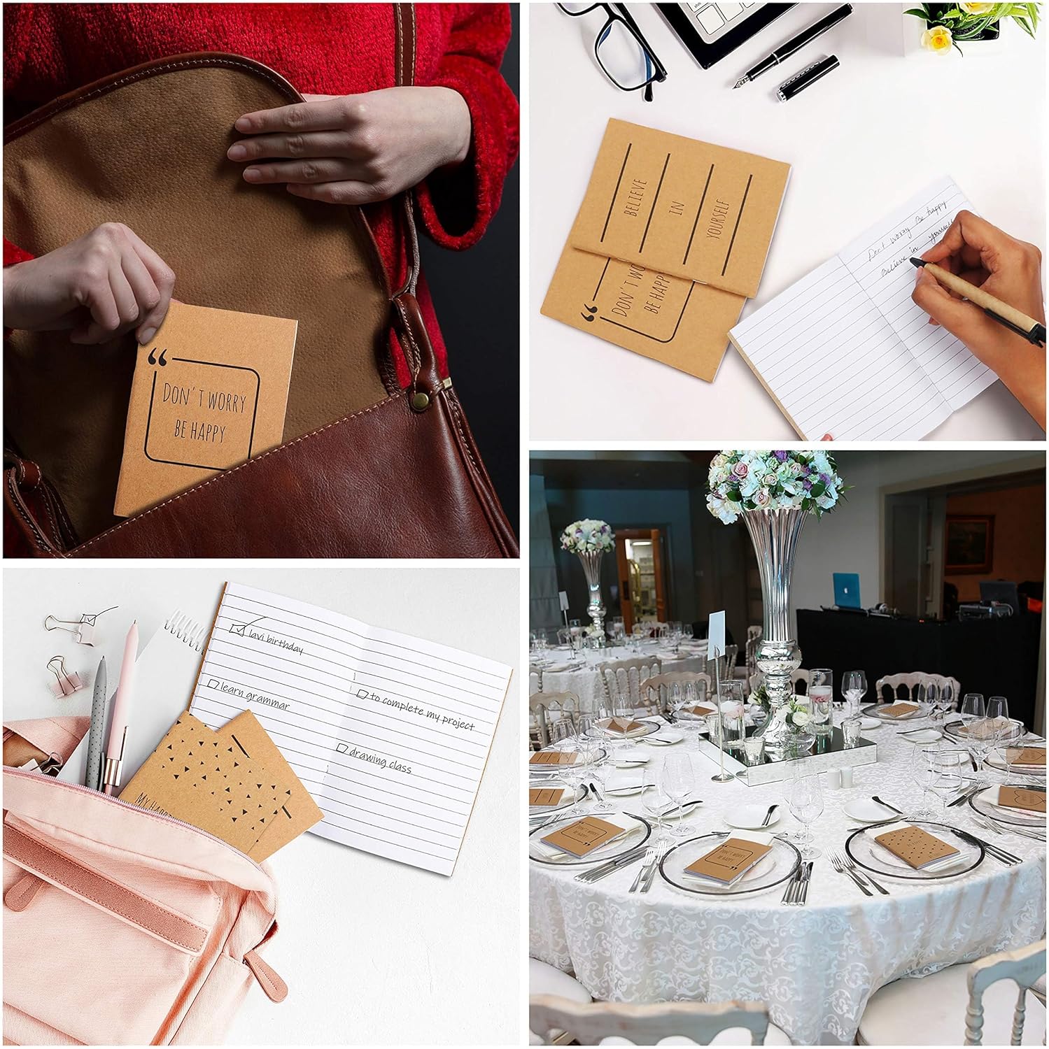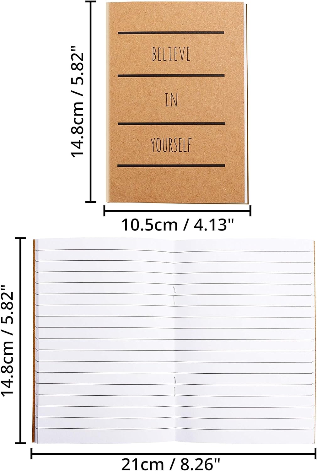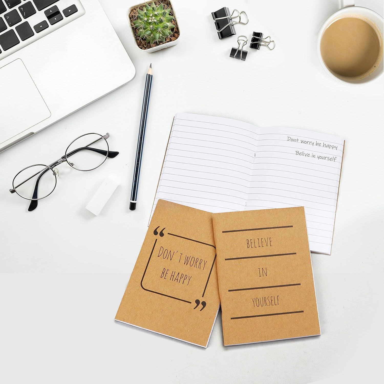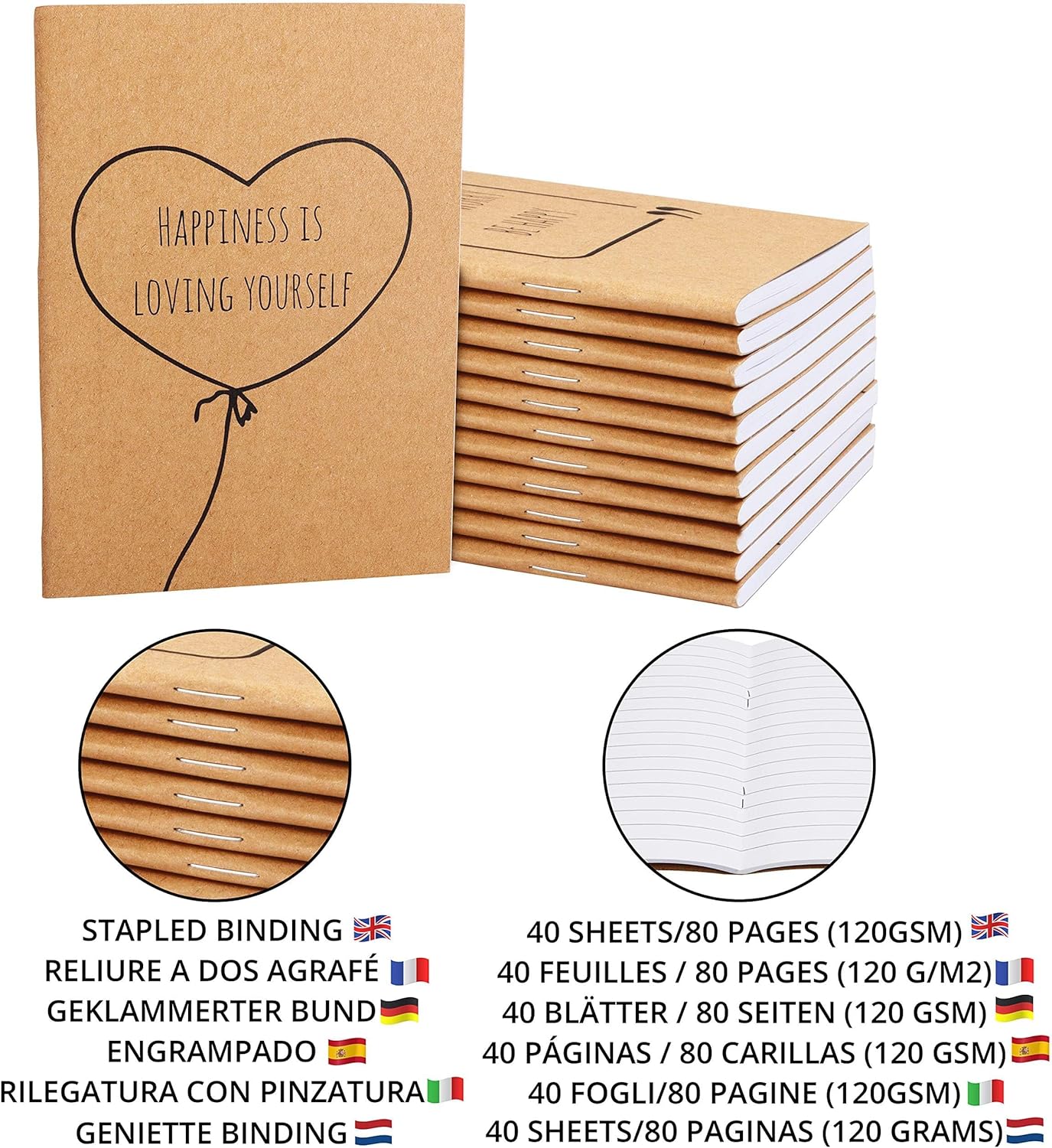 SET DI 12 QUADERNI: Questo set contiene 12 quaderni in formato A6. Misurano tutti 10,5 x 14,8 cm e contengono 40 fogli o 80 pagine a righe. La nostra carta è di 120 g/m2. Ogni taccuino è rilegato con punti metallici per mantenere le pagine in posizione. La copertina è realizzata in cartoncino kraft marrone e presenta citazioni ispiratrici. CITAZIONI MOTIVAVENTI: Il nostro pacchetto presenta 6 graziosi quaderni a righe con 2 disegni per ogni disegno. Le citazioni motivazionali in inglese ti ispireranno. Troverai frasi come "guarda sempre il lato positivo", "sii coraggioso, sii felice, sii te stesso", "credi in te stesso", "la felicità è amare te stesso", "non preoccuparti, sii felice" e "il mio diario della felicità". I loro modelli si adattano sia agli uomini che alle donne o agli adulti. MULTIFUNZIONALE: questo quaderno a righe non è progettato per scrivere. Grazie alle sue graffette si apre completamente e offre un comfort di scrittura ottimale. La carta riciclabile e di alta qualità può essere utilizzata con penna, matita, pennarello o matita colorata. PERFETTI PER TUTTE LE OCCASIONI: questi quaderni da viaggio possono essere utilizzati ovunque e occupano poco spazio. Sono ottimi anche per prendere appunti in ufficio. A casa, usali per la lista della spesa e per pianificare i pasti. Regala questi quaderni Kraft come regalo per Natale e un compleanno. Portatile: usa questo taccuino per pianificare i tuoi viaggi e le liste di cose da fare o come diario di viaggio. Le sue dimensioni e il suo peso lo rendono ideale da portare in borsa.