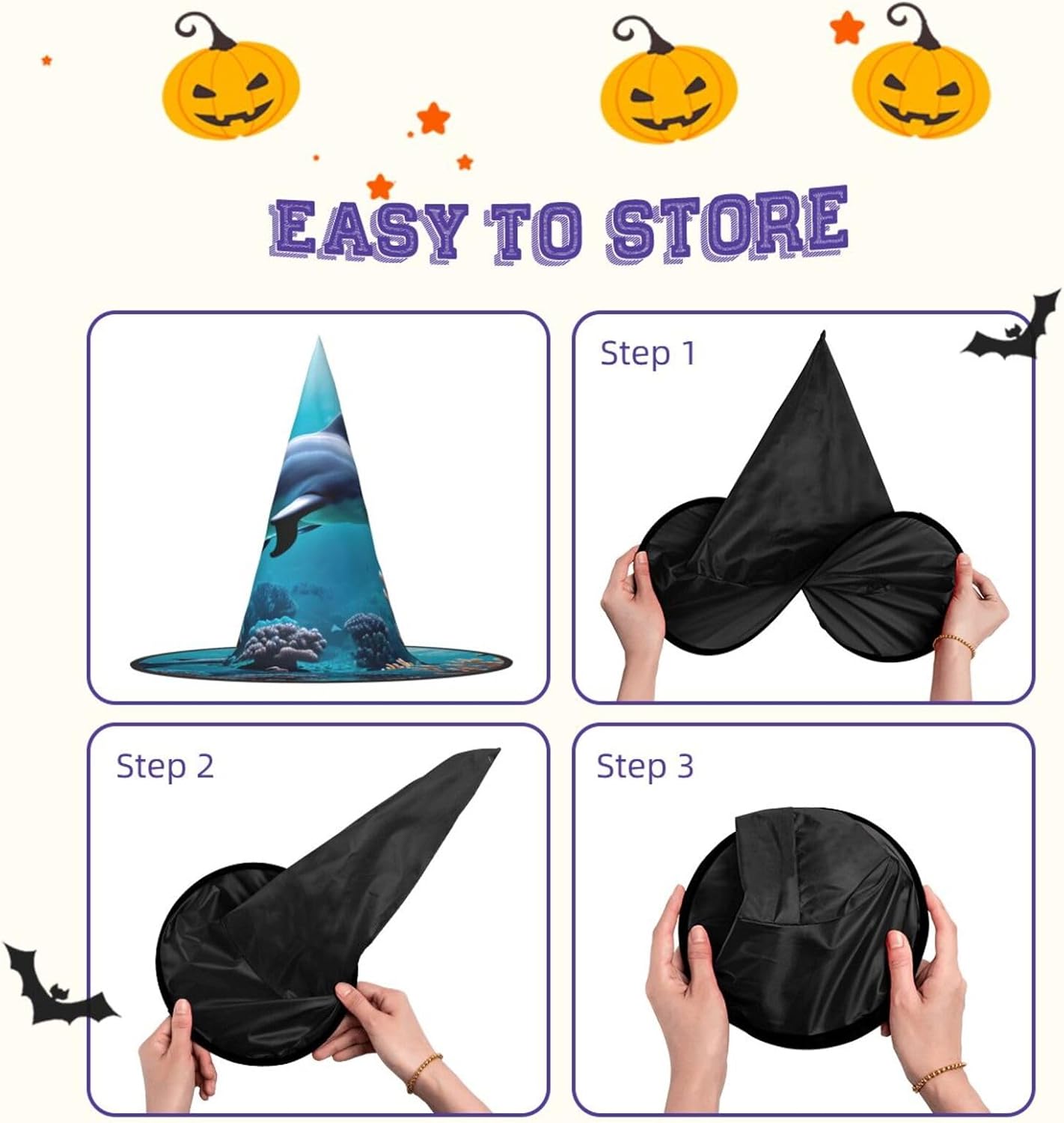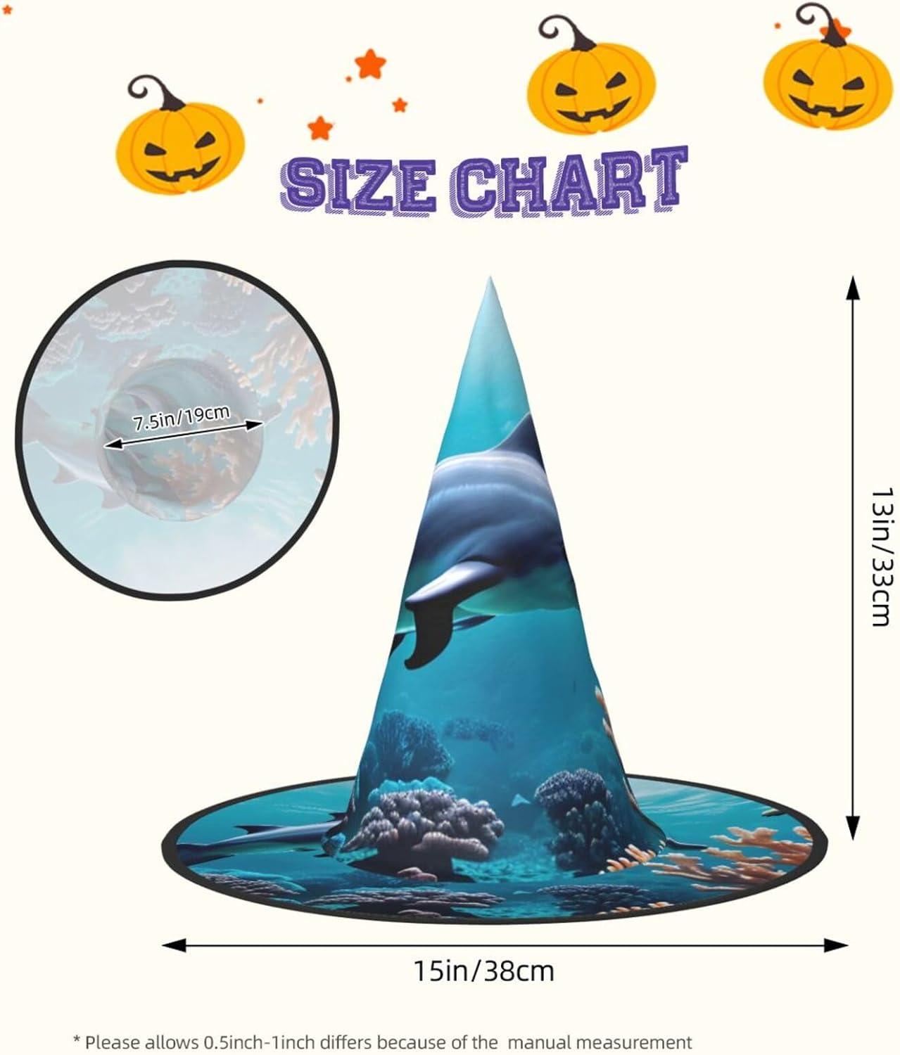 Realizzati in tessuto Oxford di qualità superiore, i nostri bellissimi cappelli con stampa di corallo e delfini del mondo sottomarino garantiscono durata e longevità. Il design unico consente di ridurre al minimo la parte superiore del cappello e i bordi di essere attorcigliati e piegati, rendendo i cappelli salvaspazio e facilmente portatili. Ogni bellissimo cappello con stampa di corallo con delfini subacquei è di dimensioni generose per adattarsi alla maggior parte delle persone ed è leggero per un uso confortevole. Si prega di leggere la tabella delle taglie prima di effettuare l'ordine. Il design versatile dei nostri bellissimi cappelli da strega di Halloween con stampa di delfini del mondo sottomarino li rende perfetti per varie occasioni. Sono lavabili in lavatrice e ad asciugatura rapida per una facile manutenzione.
