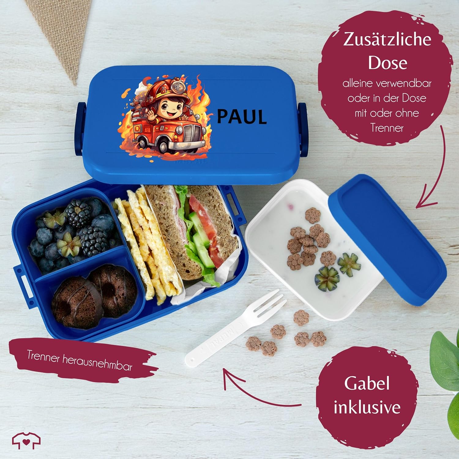 ✔️ GRANDE QUALITÀ IN UN LOOK DA POMPIERE: L'idea regalo perfetta per i futuri vigili del fuoco Inserti per Bento e forchetta per snack: Il contenitore per il pranzo Bento ha due diversi inserti per Bento che consentono di separare cibo e snack. Grazie alla pratica forchetta snack, mangiare in viaggio è particolarmente semplice e soprattutto igienico. Questo rende il bento box ideale come compagno durante le vacanze scolastiche o quando hai fame, non importa se sei in viaggio, a scuola o all'asilo. Spazio sufficiente: questo fantastico contenitore per il pranzo con stampa offre spazio sufficiente per un massimo di quattro panini o altri piccoli snack, come verdure tritate o frutti di bosco. Questo lo rende ideale per un pasto abbondante ed equilibrato durante le vacanze scolastiche o all'asilo. Grazie alla fantastica stampa a motivi potrete regalare ai vostri piccoli un regalo davvero speciale! Lavabile in lavastoviglie: la pulizia della bento box può essere facilmente eseguita in lavastoviglie. Anche il materiale della lattina stampata è privo di BPA. Ciò significa che il contenitore per il pranzo è privo di sostanze chimiche nocive. Ciò significa che puoi goderti lo spuntino della pausa senza preoccupazioni e nulla ostacola un utilizzo sano e sicuro. Ideale per la scuola e l'asilo: il contenitore per il pranzo Bento con una bellissima stampa è ideale per il pranzo a scuola o all'asilo. La lattina è compatta e facile da trasportare. I vari inserti bento permettono inoltre al tuo bambino di gustare un pasto vario e sano.