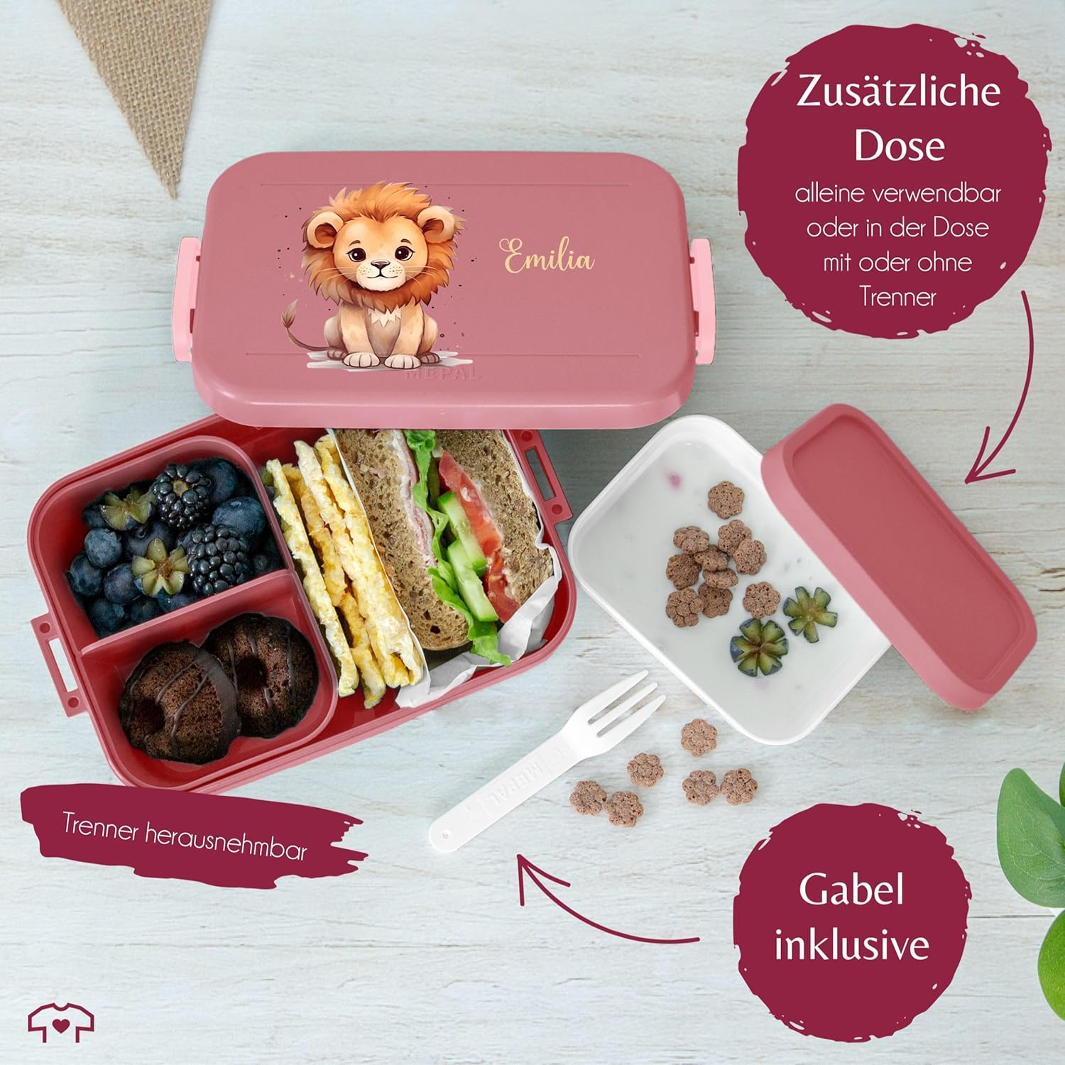 Il motivo giusto per gli appassionati di leoni: i nonni e i genitori portano gioia agli appassionati di leoni da molto tempo con questo fantastico motivo. Il design carino è perfetto per tutti e stai facendo la scelta giusta se stavi cercando un "portapranzo rosa". Quindi prendilo subito! Motivo animali dello zoo: il tema del leone è molto popolare tra molte persone e stai cercando contenitori per il pranzo abbinati. Hai cercato “portapranzo rosa personalizzato”? Questo simpatico motivo è il regalo perfetto e farà sicuramente brillare i fan dei leoni e i bambini. La grafica accattivante attira l'attenzione in ogni occasione. Perfetto per ogni occasione: vuoi regalare un regalo davvero speciale questa volta? Oppure stai cercando un "piccolo contenitore per il pranzo"? Sorprendi i tuoi piccoli con il regalo giusto per questo evento e rendili felici con il nostro motivo. REGALO LEONE: fantastico motivo con leone e nome desiderato per i bambini Inserti per bento e forchetta per snack: il contenitore per il pranzo Bento ha due diversi inserti per bento che consentono di separare cibo e snack. Grazie alla pratica forchetta snack, mangiare in viaggio è particolarmente semplice e soprattutto igienico. Questo rende il bento box ideale come compagno durante le vacanze scolastiche o quando hai fame, non importa se sei in viaggio, a scuola o all'asilo.