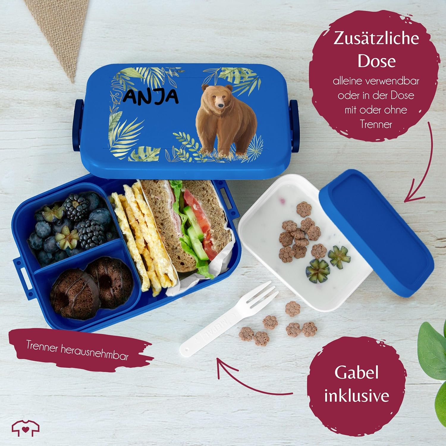 | Enthaltene Komponenten | Bento-Einsätze, Brotdose, Snack-Gabel |