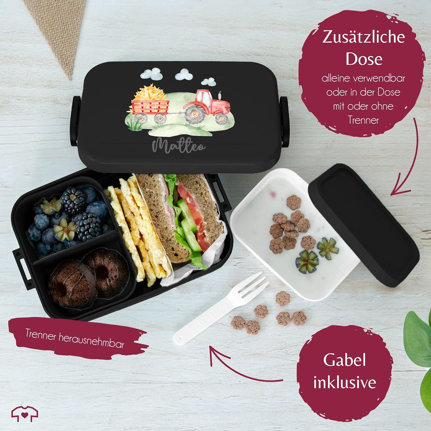 | Enthaltene Komponenten | Bento-Einsätze, Brotdose, Snack-Gabel |