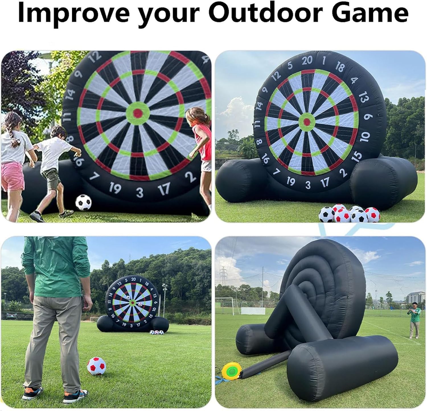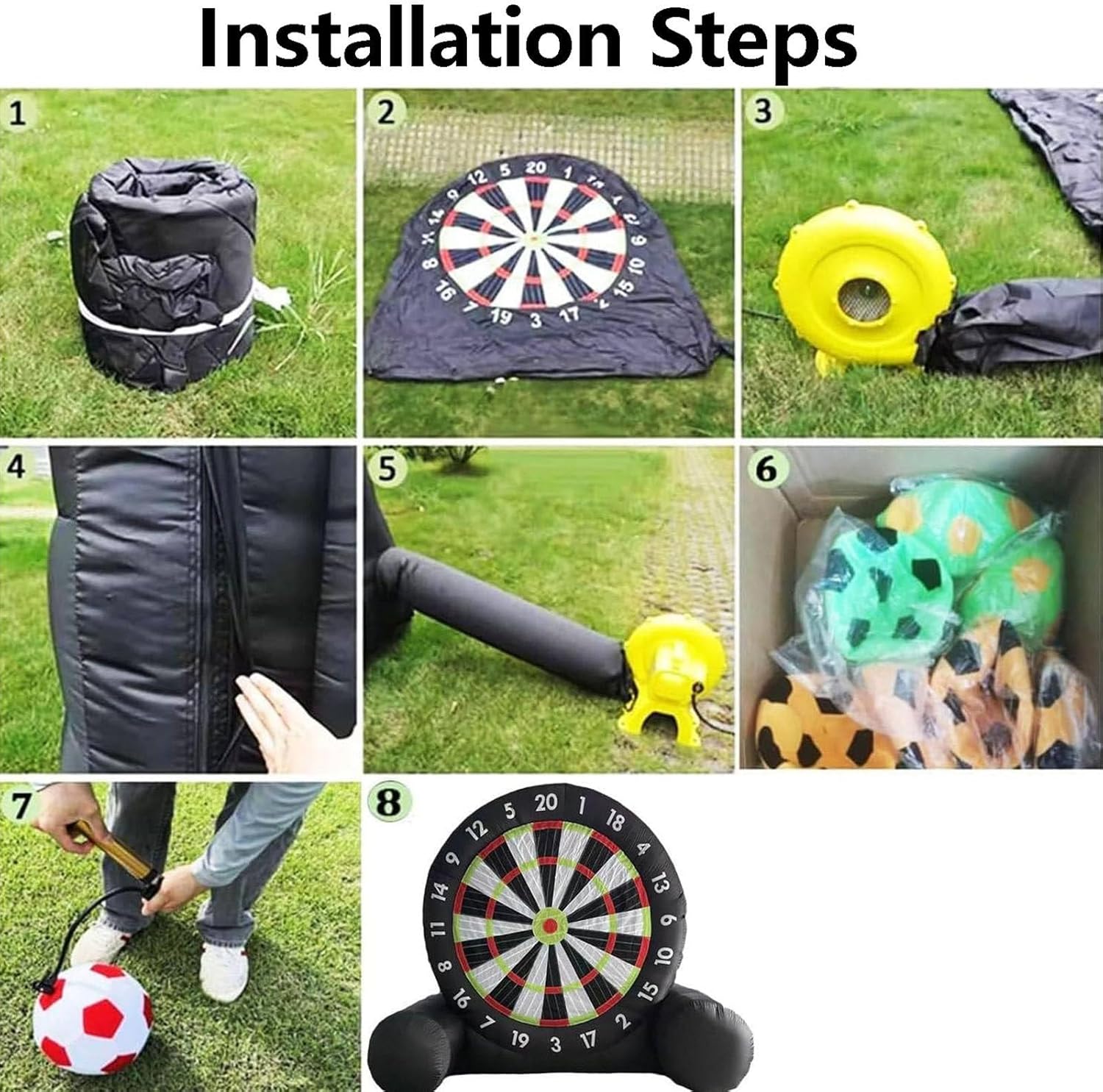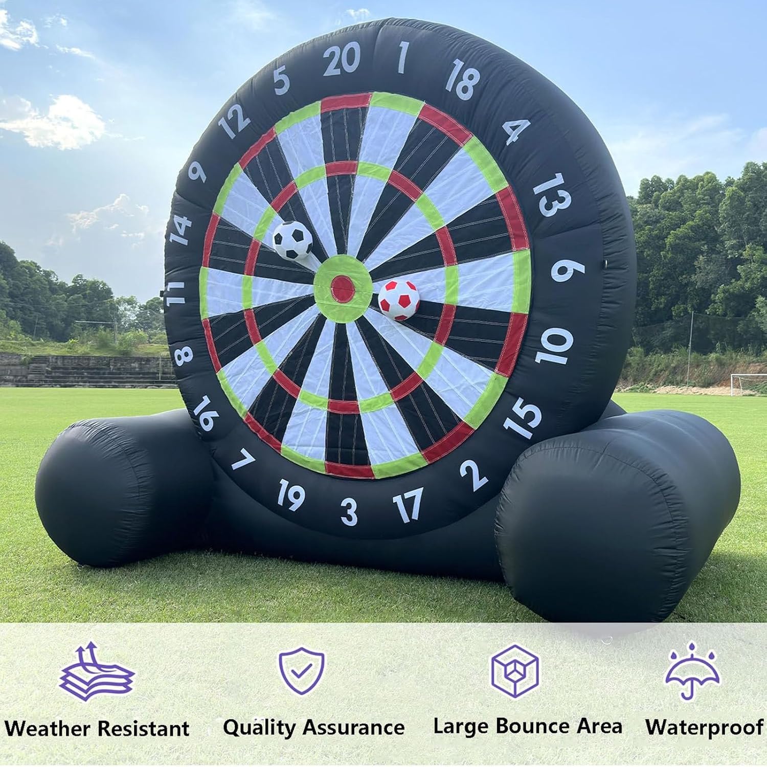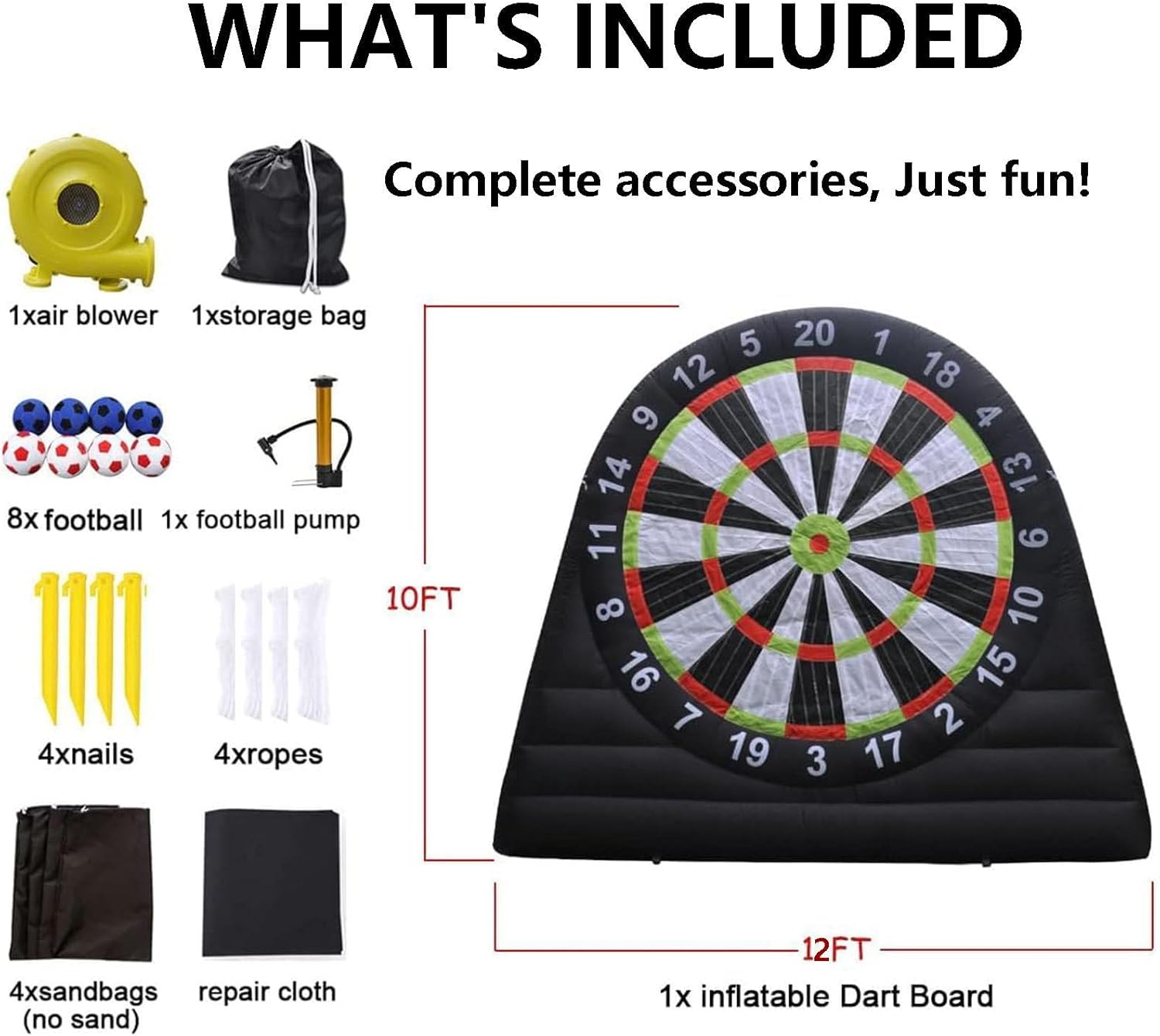 【Più resistente e più stabile】: il nostro bersaglio gonfiabile per freccette da calcio misura 10 piedi * 10 piedi (larghezza x altezza); il bersaglio gonfiabile per freccette è realizzato in tessuto Oxford 210d, antistatico e più resistente all'usura. Tutti i giunti delle freccette da calcio sono doppiamente cuciti e la superficie del bersaglio autoriparante ha una forte aderenza, che può essere facilmente smontata senza danneggiare la palla. 【Installazione rapida, facile da riporre】: le freccette gonfiabili da calcio sono facili da installare e richiedono solo 2 minuti o meno. Assicurarsi di chiudere la cerniera prima di gonfiarle. Le freccette da calcio sono facili da gonfiare e sgonfiare e possono essere piegate in piccoli pezzi dopo lo sgonfiaggio, il che è comodo per lo spostamento e lo stoccaggio. Tuttavia, ricordarsi di evitare oggetti appuntiti nelle vicinanze prima dello spostamento e di sollevarle per evitarne l'u 【Design unico e interessante】: Contiene 8 palloni da calcio in feltro. Le freccette sono l'ultimo sport che combina calcio e freccette. Il bersaglio per freccette da calcio di grandi dimensioni è adatto a bambini e adulti; tutte le superfici del bersaglio sono gonfiabili e autoadesive; puoi calciare il pallone da calcio peloso verso l'enorme bersaglio in velcro, il che è molto semplice e divertente. Puoi registrare i punteggi o creare le tue partite. 【Applicazione】: per gli appassionati di calcio e rugby, nonché per società di noleggio, scuole, vacanze al mare, campi estivi, eventi aziendali, gruppi comunitari, feste in giardino e per godersi uno stile di vita attivo con amici e familiari e promuovere il lavoro di squadra. 【Accessori completi】: Pallone da calcio x8, soffiatore x1, pompa dell'aria x1, picchetti x8, corde x4, sacchi di sabbia x4.