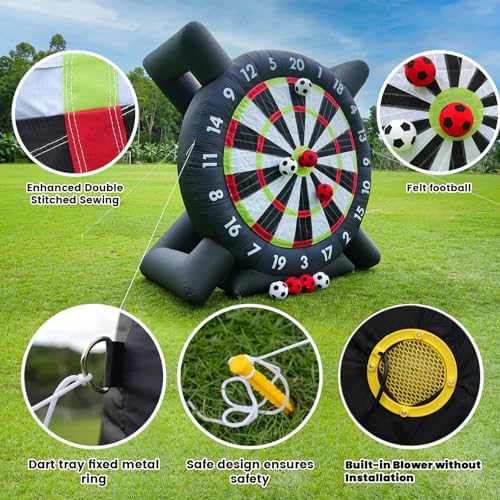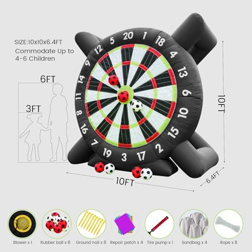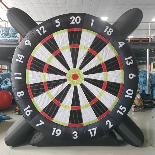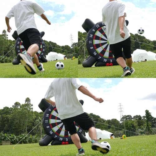 Specifiche di prodotto: Misurando 12* 10* 6.5Ft, questo calcio gonfiabile dardo bordo offre ampie dimensioni per il massimo divertimento. Il pacchetto include: 1 soffiatore, 8 palloni gonfiabili, 1 kit di riparazione, corda e picchetti necessari. Materiale durevole: realizzato in tessuto Oxford di alta qualità, noto per le sue proprietà leggere e robuste. Vanta capacità impermeabili e una durata eccezionale, arricchita da una tecnica di cucitura a doppio ago e quattro fili per una maggiore durata. Emozionante esperienza di calcio: il bersaglio per freccette da calcio combina l'emozione del calcio e delle freccette in un gioco unico. Caratterizzato da una superficie autoadesiva, il nostro bersaglio gonfiabile assicura che le freccette appositamente progettate aderiscano ogni volta che lanciate. Mostra le tue abilità e competi per superare i tuoi avversari. Facile installazione: basta disimballare il prodotto e attaccarlo al soffiatore per gonfiarlo senza sforzo, che richiede circa tre minuti. Una volta gonfiato, utilizzare la corda e i picchetti inclusi per una maggiore stabilità, rendendolo perfetto per feste, feste all'aperto ed eventi promozionali. Uso versatile: ideale per gli appassionati di calcio, questo bersaglio gonfiabile è perfetto per servizi di noleggio, feste, club, parchi, intrattenimento all'aperto, riunioni in giardino e varie funzioni aziendali. Se non sei completamente soddisfatto del tuo acquisto, ti preghiamo di contattarci per una soluzione soddisfacente al 100%.