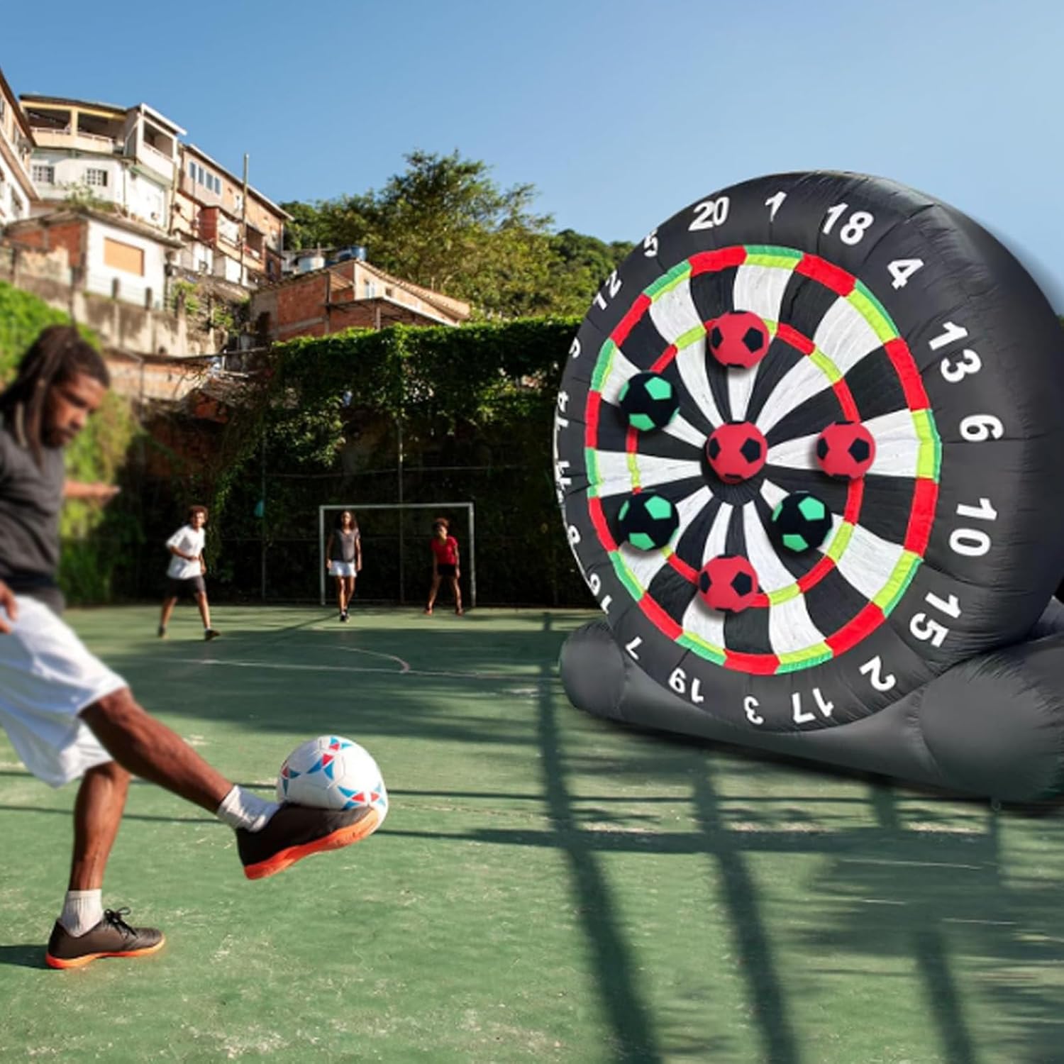 ● Gioco di freccette gigante: il bersaglio gonfiabile per freccette da calcio è un'attività fantastica per i singoli che vogliono affinare le proprie abilità o per le squadre di giocatori che competono per il punteggio migliore. Che si tratti di sfidare le rivalità familiari o di creare team sul posto di lavoro, questo divertimento offre ore di divertimento in cortili, palestre, scuole, festival comunitari o parcheggi aziendali. ● Materiali eccellenti: il nostro bersaglio gonfiabile gigante per freccette è dotato di una struttura solida, realizzata in tessuto Oxford nero 210D di alta qualità con tecnologia a doppia cucitura all'avanguardia, resistente al freddo, al calore, agli strappi, antistatico e a tenuta stagna. Non è solo un gioco: è un'esperienza emozionante di alta qualità che porterà le tue avventure di lancio delle freccette a nuovi livelli. ● Bersaglio per freccette extra adesivo: il bersaglio per freccette adotta un design super adesivo, che può far sì che ogni pallone da calcio venga colpito in modo costante, proprio come le freccette che si attaccano al bersaglio. I giochi gonfiabili da esterno aumenteranno il divertimento e la sfida nel raggiungere l'obiettivo, in modo che i giocatori abbiano un maggiore senso di realizzazione. ● Cosa puoi ottenere: Bersaglio per freccette: 9,84 piedi x 9,18 piedi / 12,46 piedi x 10,17 piedi. L'attrezzatura include: 1 soffiatore da 350 W, 8 palloni da calcio, 1 pompa manuale, 1 telo di riparazione, 4 corde, 4 picchetti. Scegli il gioco sportivo con bersaglio per freccette per un'esperienza straordinaria e imbattibile. Lascia che i bei momenti scorrano. ● Installazione rapida: il pallone da calcio gonfiabile per freccette è facile e comodo da installare. Basta collegare il soffiatore, gonfiare e chiudere la cerniera. Sei pronto a giocare in pochi minuti. Il bersaglio per freccette da calcio è facile da gonfiare e sgonfiare, ripiegabile in un piccolo pezzo dopo lo sgonfiaggio per spostarlo e riporlo facilmente. Tuttavia, ricorda di evitare oggetti appuntiti nelle vicinanze e di sollevarli prima di spostarlo per prevenirne l'usura.
