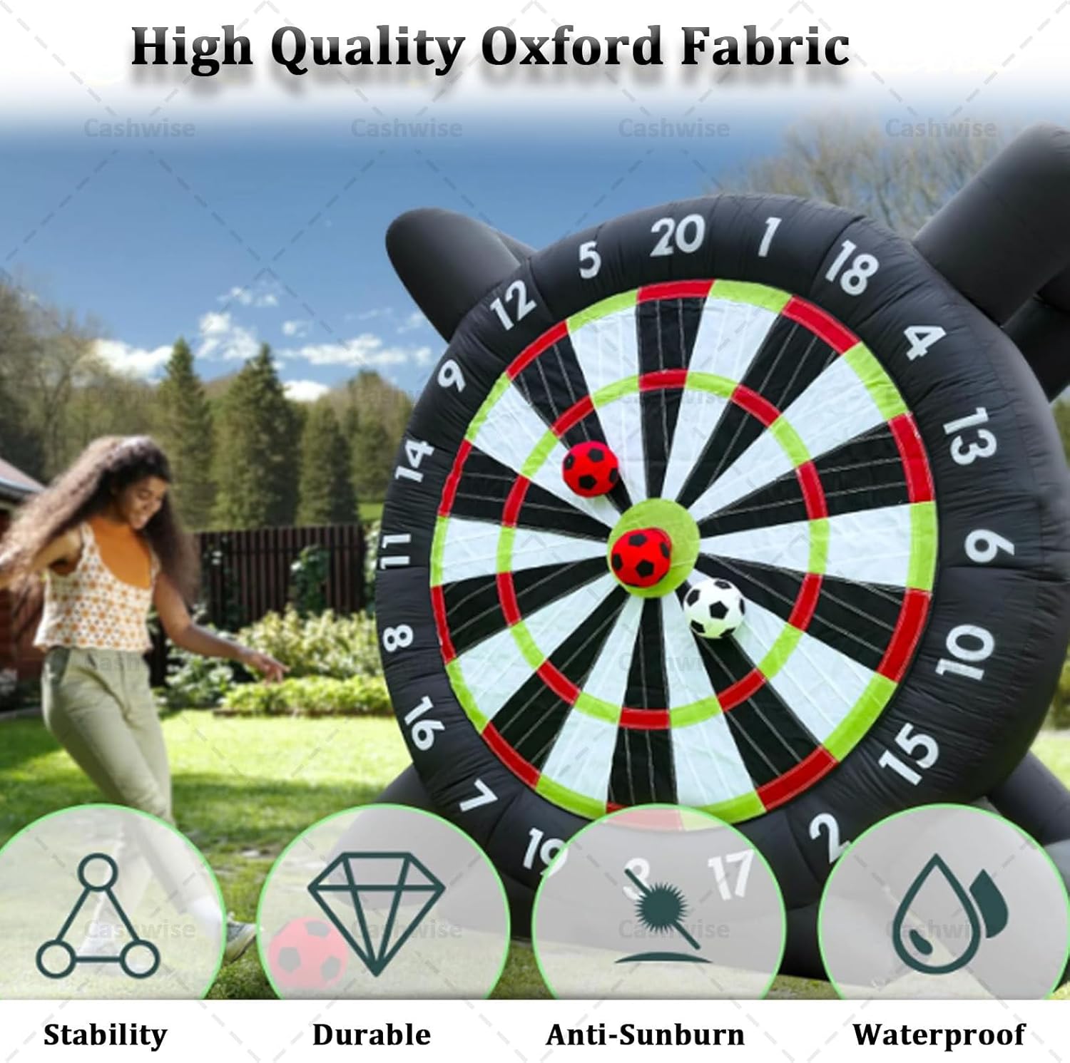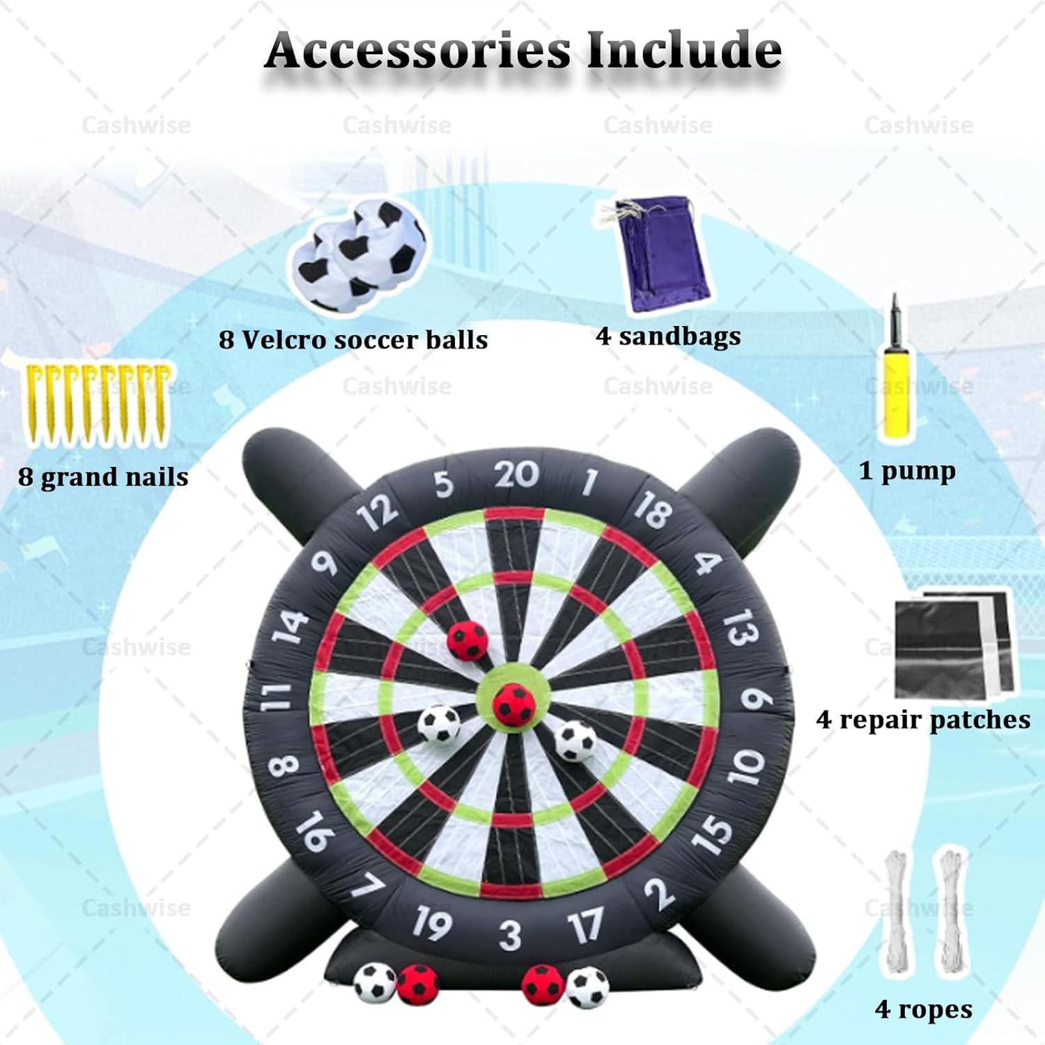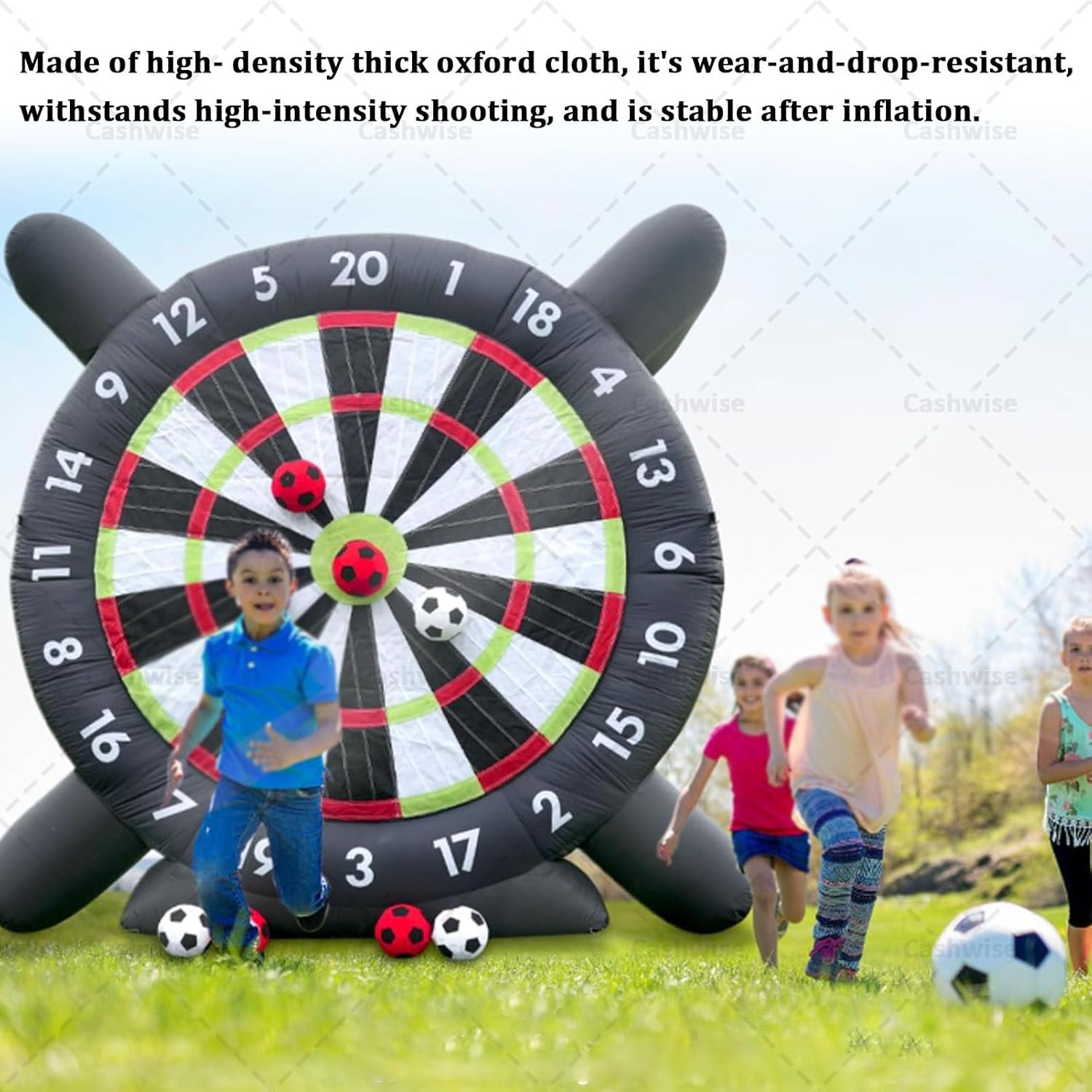 ● Gioco di freccette gigante: il bersaglio gonfiabile per freccette da calcio è un'attività fantastica per i singoli che vogliono affinare le proprie abilità o per le squadre di giocatori che competono per il punteggio migliore. Che si tratti di sfidare le rivalità familiari o di creare team sul posto di lavoro, questo divertimento offre ore di divertimento in cortili, palestre, scuole, festival comunitari o parcheggi aziendali. ● Materiali eccellenti: il nostro bersaglio gonfiabile gigante per freccette è dotato di una struttura solida, realizzata in tessuto Oxford nero 210D di alta qualità con tecnologia a doppia cucitura all'avanguardia, resistente al freddo, al calore, agli strappi, antistatico e a tenuta stagna. Non è solo un gioco: è un'esperienza emozionante di alta qualità che porterà le tue avventure di lancio delle freccette a nuovi livelli. ● Bersaglio per freccette extra adesivo: il bersaglio per freccette adotta un design super adesivo, che può far sì che ogni pallone da calcio venga colpito in modo costante, proprio come le freccette che si attaccano al bersaglio. I giochi gonfiabili da esterno aumenteranno il divertimento e la sfida nel raggiungere l'obiettivo, in modo che i giocatori abbiano un maggiore senso di realizzazione. ● Puoi ottenere: Bersaglio per freccette: 10 piedi x 10 piedi / 13,12 piedi x 13,12 piedi L'attrezzatura include: 1 soffiatore da 350 W, 8 palloni da calcio, 1 pompa manuale, 1 panno per riparazioni, 4 corde, 4 chiodi da terra. Scegli il gioco sportivo con bersaglio per freccette per un'esperienza straordinaria e imbattibile. Lascia che i bei momenti scorrano ● Installazione rapida: il pallone da calcio gonfiabile per freccette è facile e comodo da installare. Basta collegare il soffiatore, gonfiare e chiudere la cerniera. Sei pronto a giocare in pochi minuti. Il bersaglio per freccette da calcio è facile da gonfiare e sgonfiare, ripiegabile in un piccolo pezzo dopo lo sgonfiaggio per spostarlo e riporlo facilmente. Tuttavia, ricorda di evitare oggetti appuntiti nelle vicinanze e di sollevarli prima di spostarlo per prevenirne l'usura.