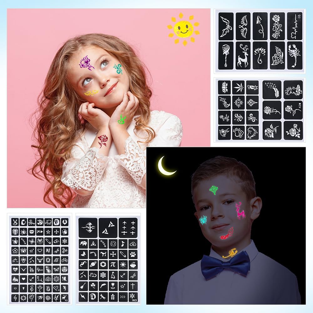 🎁【Kit per Tatuaggi per Bambine】Bestauty kit per tatuaggi per bambini contiene 36 colori glitter, 6 glitter fluorescenti, 12 glitter, 130 stencil per tatuaggi, 215 adesivi strass, 3 adesivi per modelli, 2 colle, 5 pennelli e una bella scatola. Per far divertire ogni bambino con il fai-da-te! 🎄【Sicuro e Non-tossico】Bestauty Kids Tattoo Kit utilizza materiali testati per essere sicuri e non tossici, che non danneggiano la pelle sensibile dei bambini. I genitori possono sentirsi liberi di creare i loro tatuaggi temporanei preferiti con i loro bambini! 🎄【Facile da usare e da rimuovere】Bestauty kit per tatuaggi temporanei è molto facile da usare: prima si posiziona lo stencil del tatuaggio e si applica la colla, quando la colla diventa trasparente, si stacca l'adesivo e si applicano i glitter con un pennello piccolo, poi si usa un pennello grande per spazzare via i glitter in eccesso. I tatuaggi glitterati successivi possono essere facilmente rimossi con uno struccante o con acqua e sapone. 🎄【Molteplici usi】I tatuaggi glitterati possono essere applicati su viso, collo e gambe, ecc, oltre che su unghie e cosmetici. Si possono usare anche per ombretti, artigianato, cosmetici, imballaggi, inviti, biglietti d'auguri e altro ancora. Nel frattempo possono farvi brillare alla festa! 🎄【Preferito per le feste】 I kit per tatuaggi glitterati non sono solo adatti al gioco quotidiano, ma anche perfetti per feste per bambini, Natale, Pasqua e altre occasioni speciali. I bambini possono dare pieno sfogo alla loro creatività e vestirsi come desiderano!