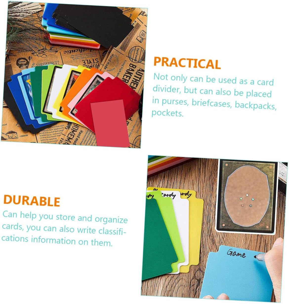 Divisori per schede: questi divisori in plastica possono aiutarti a organizzare le tue carte e renderle più facili da trovare. Separatore di carte per carta: le dimensioni compatte non occuperanno molto spazio ed è leggero e comodo da trasportare. Separatore di carte collezionabili: la sezione dell'etichetta può essere scritta con pennarelli, facilitando la ricerca della carta che stai cercando. Divisori in vinile: realizzati in materiale plastico di alta qualità, il divisore per carte è durevole e pratico per un uso prolungato. Divisori per carte da gioco: la sezione delle etichette può essere scritta con pennarelli, facilitando la ricerca della carta che stai cercando.