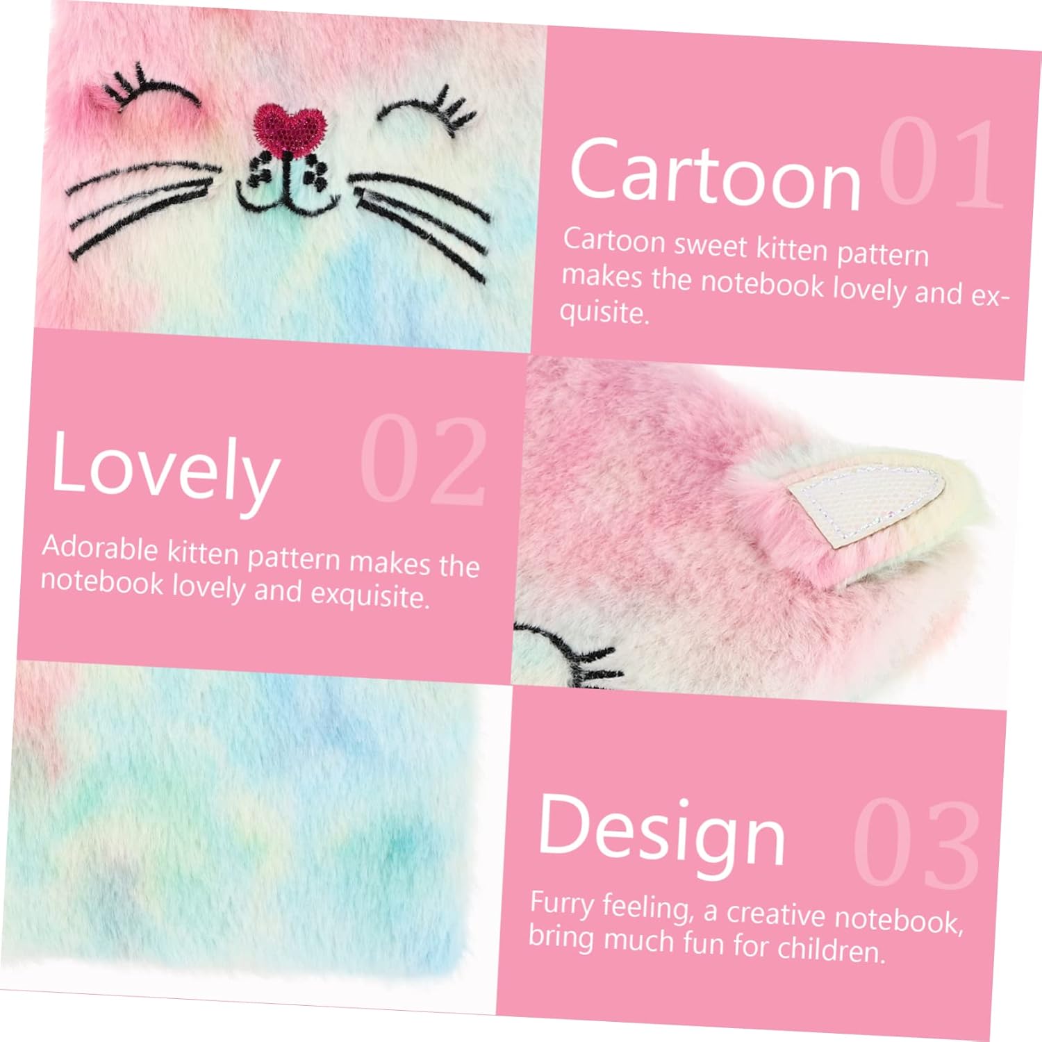 Blocco note per bambini: ti aiuta a tenere appunti per progetti, attività e obiettivi importanti in un unico posto, il prodotto è di pregevole fattura, blocco note in peluche Quaderno per studenti: questo è un quaderno alla moda che è ottimo da usare come diario, quaderno di schizzi, quaderno da viaggio, diario, quaderno di composizione ecc., diario di scrittura Quaderno con gattini dei cartoni animati: progettato in dimensioni leggere per , è comodo per la casa, l'ufficio, la scuola e i viaggi, diario di peluche per ragazze Diario del diario: puoi utilizzare questo taccuino per registrare le routine quotidiane, fare piani giornalieri, creare manuali, scrivere diari, appunti di viaggio, ecc., album di peluche Taccuino in peluche: il motivo a forma di gattino dolce dei cartoni animati rende il taccuino adorabile e squisito, taccuino per bambini