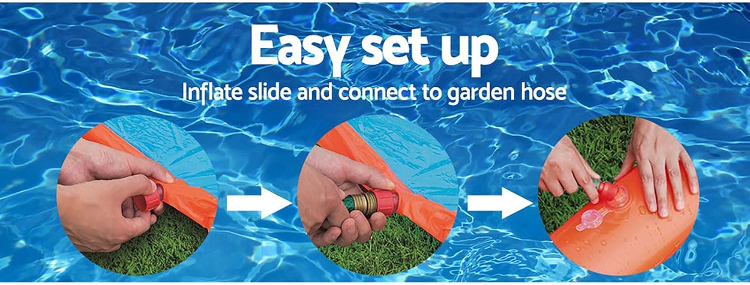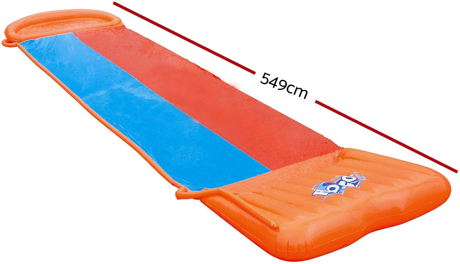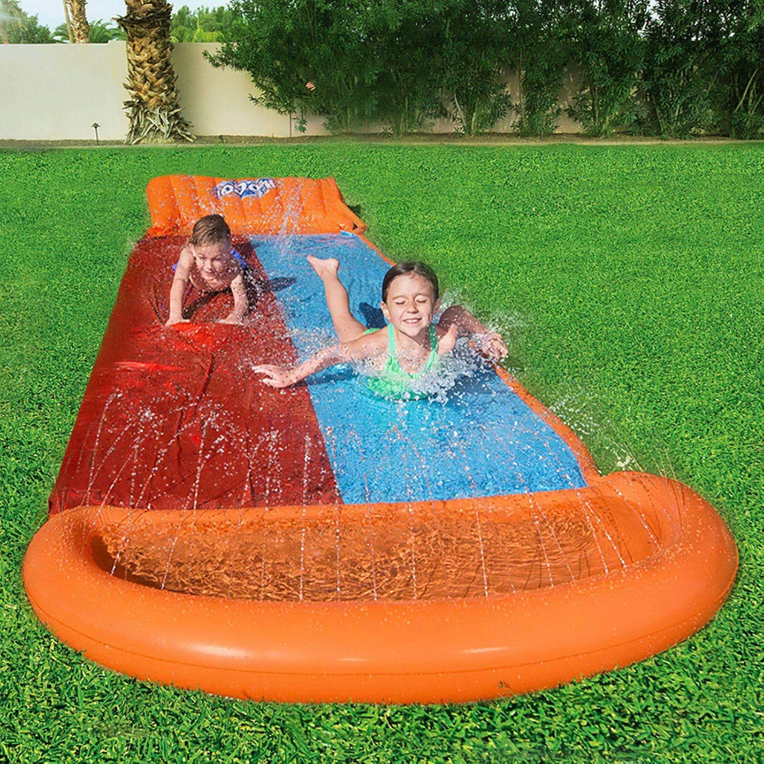 Dimensioni: 5.49 m di lunghezza Questo scivolo a due corsie termina con una piccola piscina Basta collegare un tubo da giardino Facile da installare Contenuto: 1 scivolo d'acqua, 1 toppa di riparazione