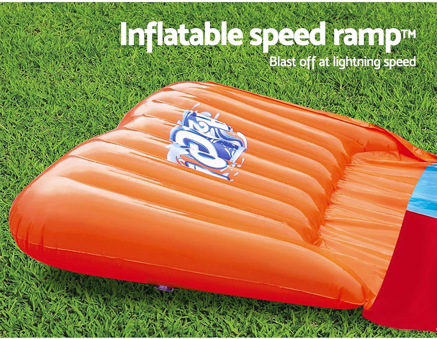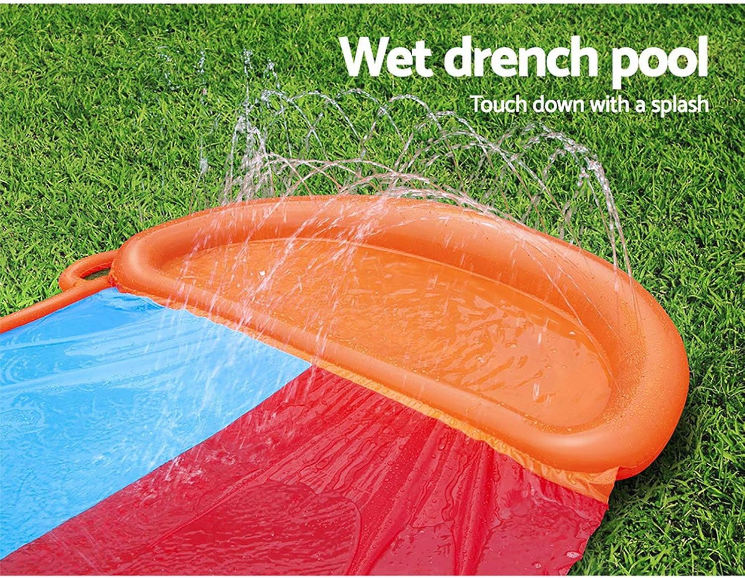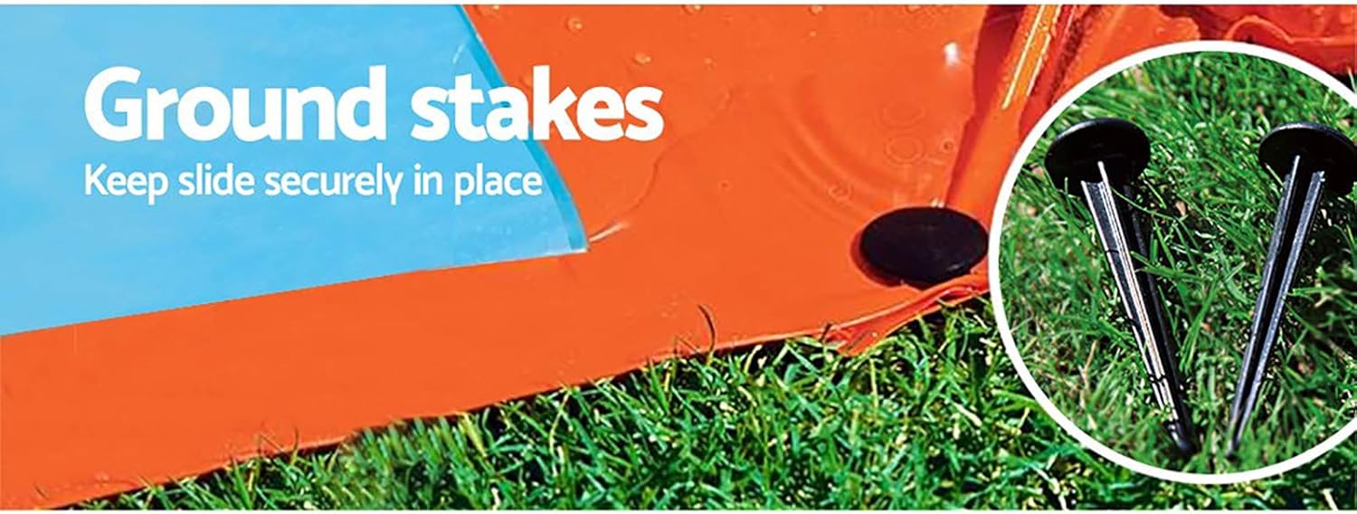 Dimensioni: 5.49 m di lunghezza Questo scivolo a due corsie termina con una piccola piscina Basta collegare un tubo da giardino Facile da installare Contenuto: 1 scivolo d'acqua, 1 toppa di riparazione
