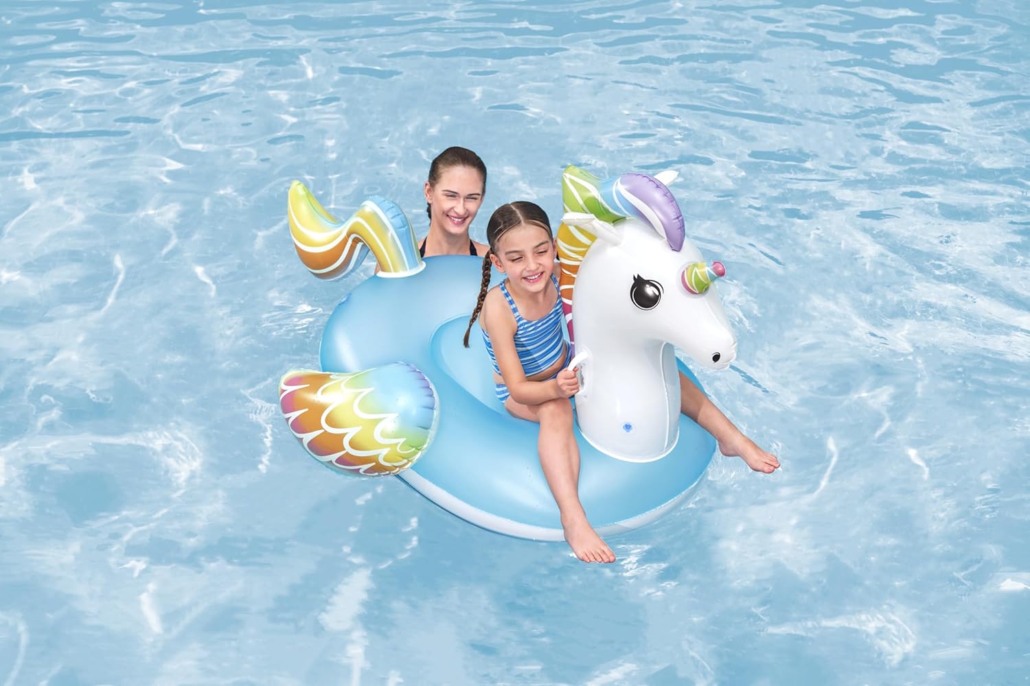 Perfetto per bambini dai 3 anni in su Unicorno arcobaleno colorato con stampa brillante Le robuste maniglie facilitano l'installazione o il trasporto della boa Facile da gonfiare, sgonfiare e riporre