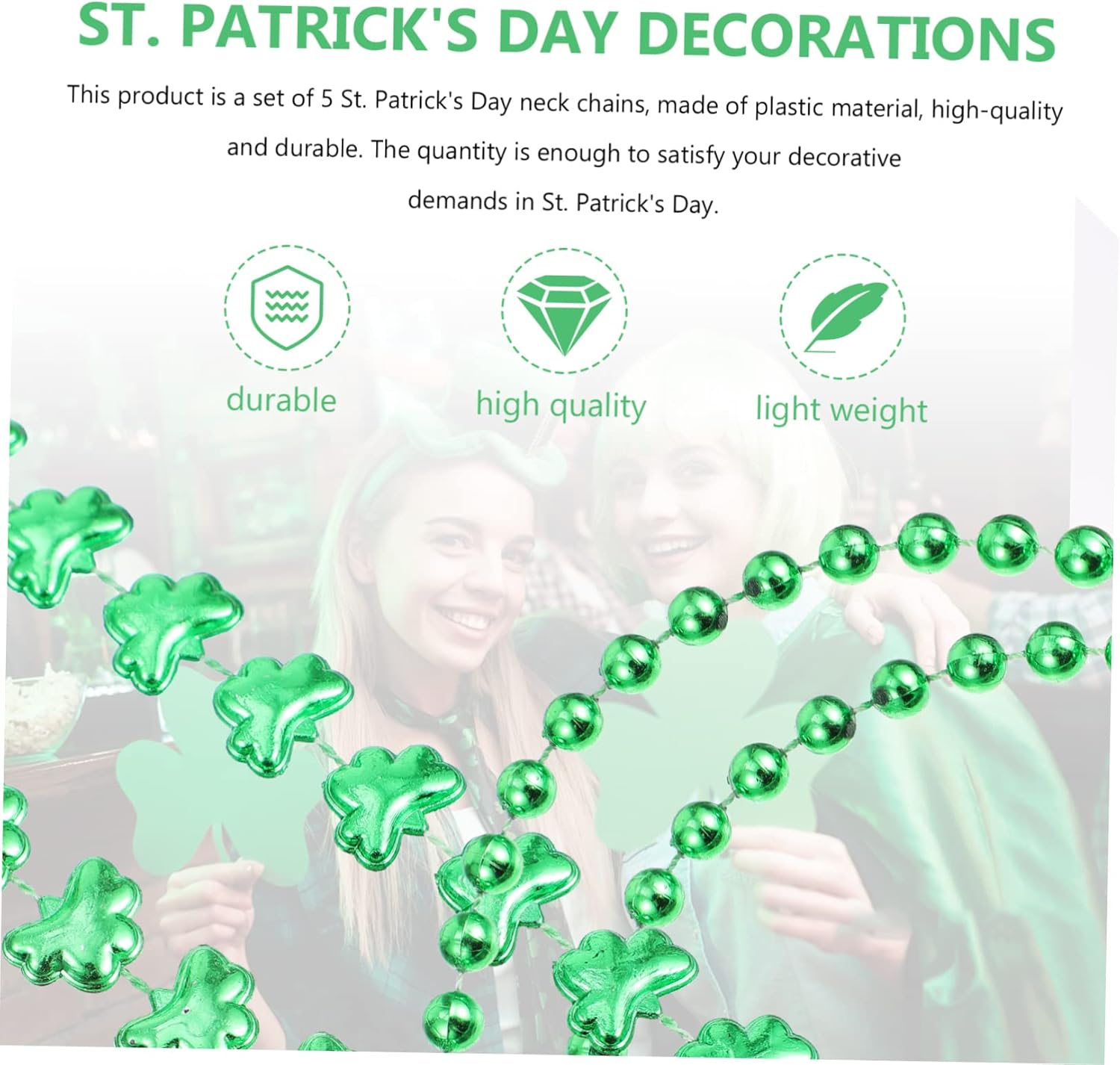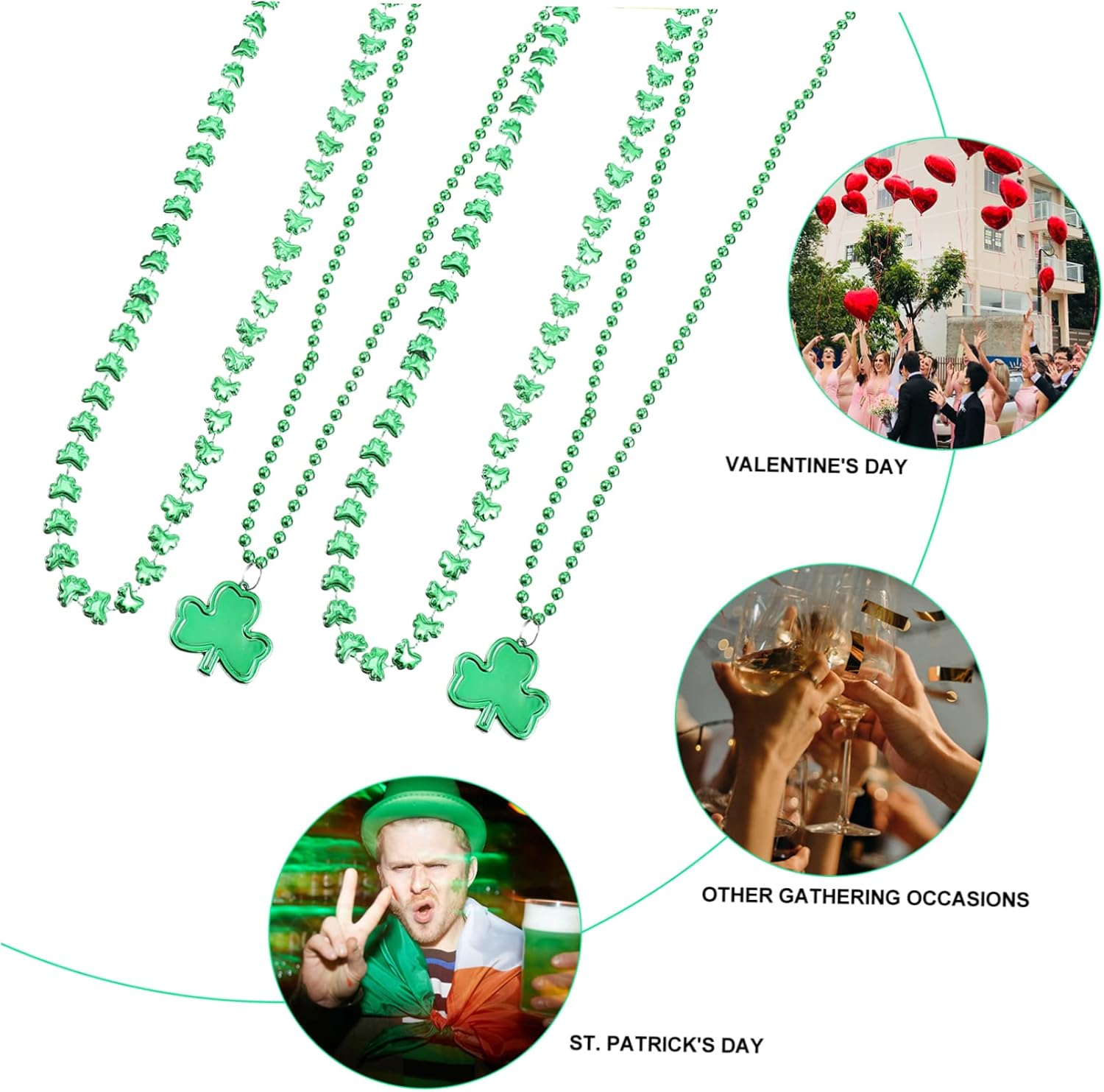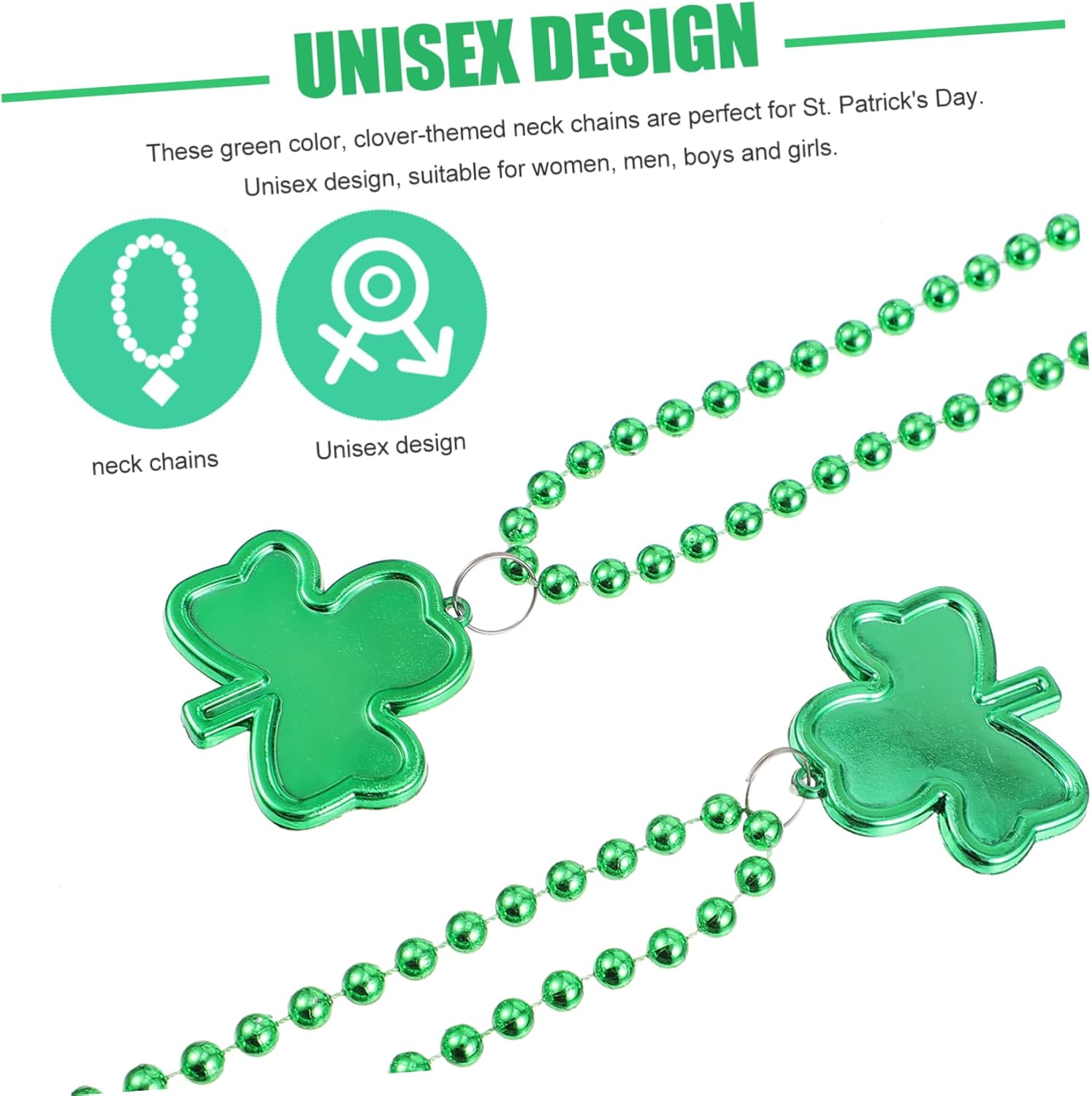 dei pacchetti 8 x Collana Caratteristiche - Materiale: decorazione in plastica per feste. - : Catena per Festival. - Dimensioni: 0,44,00X4,00X0,30 cm/17,29X1,57X0,12 pollici Decorazione del collo. - Realizzato in materiale plastico, può essere utilizzato con come collana per il di San Patrizio. - Collana decorativa leggera e compatta, facile da indossare e riporre. - Le dimensioni generali adattano a tutte le persone, abbinano bene ai ciondoli creativi per il collo dei costumi di San Patrizio. - Elementi classici del trifoglio, per il ciondolo con perline decorative per il di San Patrizio. - Set di collane per festival, ideale per i membri che partecipano alle celebrazioni di San Patrizio, alle feste in , alle sfilate, agli spettacoli teatrali e ad altre attività. Descrizione della merce Collana con trifoglio Il ciondolo St.Beads per decorazioni di intrattenimento e feste. Collana di San Patrizio Il set di collane di San Patrizio può mostrare il tuo stile. Collana creativa per festival Questo accessorio accattivante attirerà sicuramente molte attenzioni e lodi alle tue feste, sfilate ed eventi. Decorazione per festival Realizzata in plastica, resistente e robusta