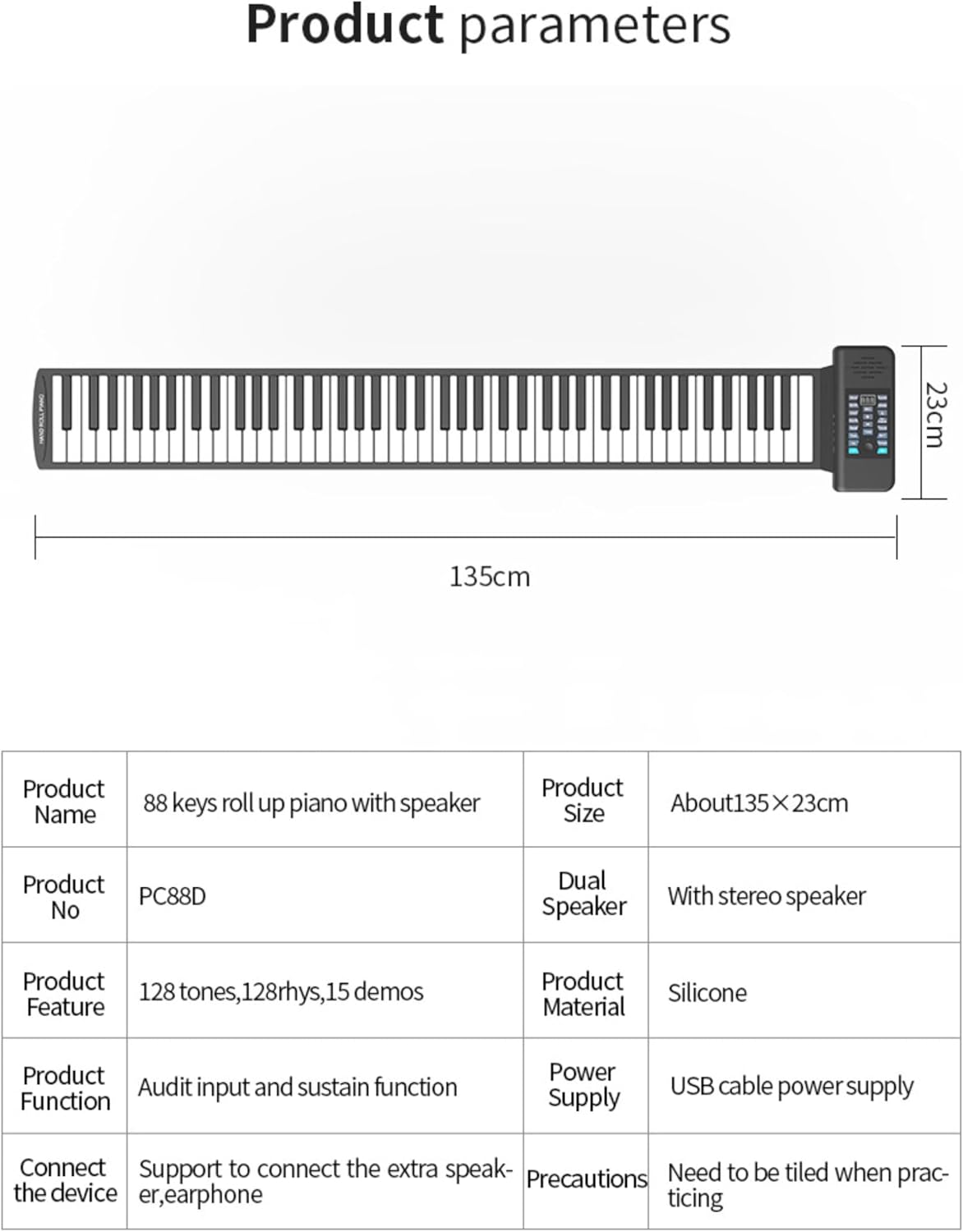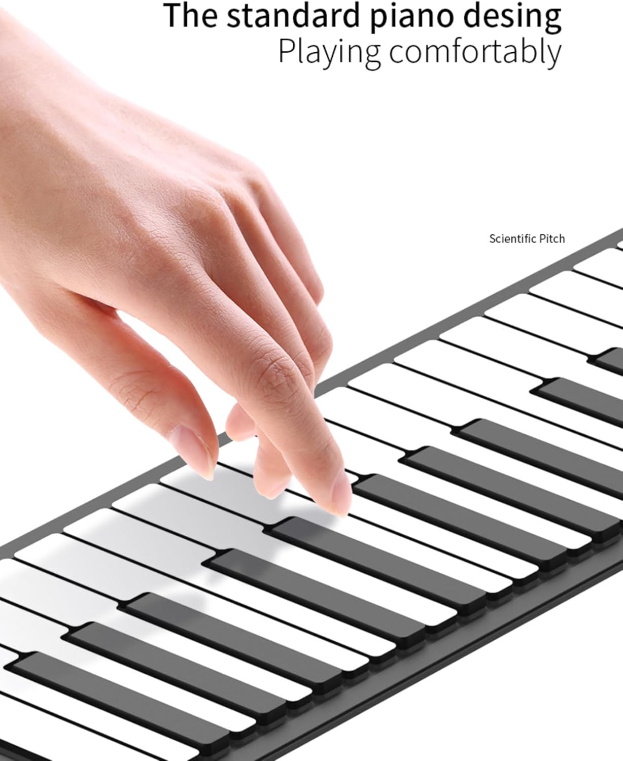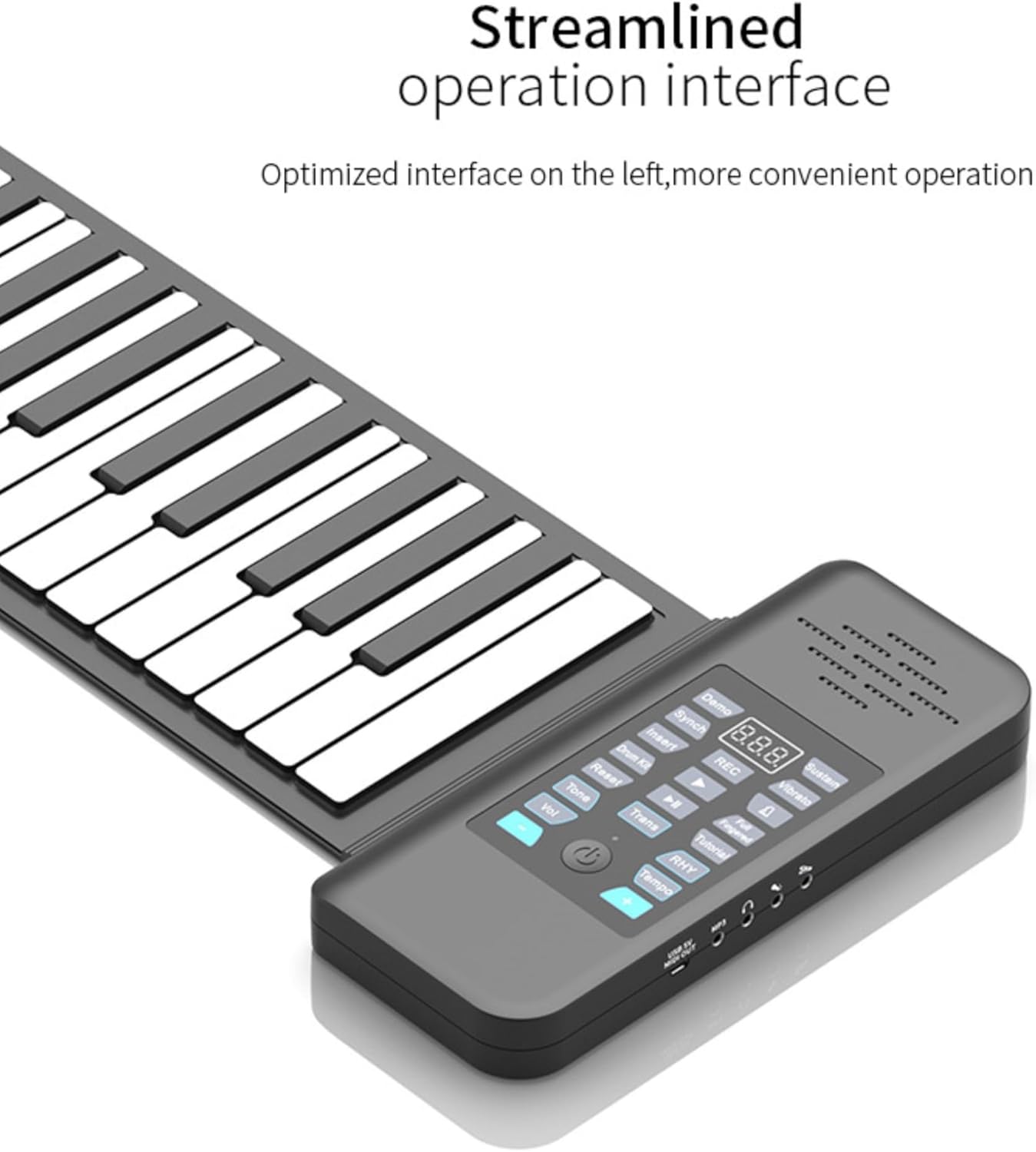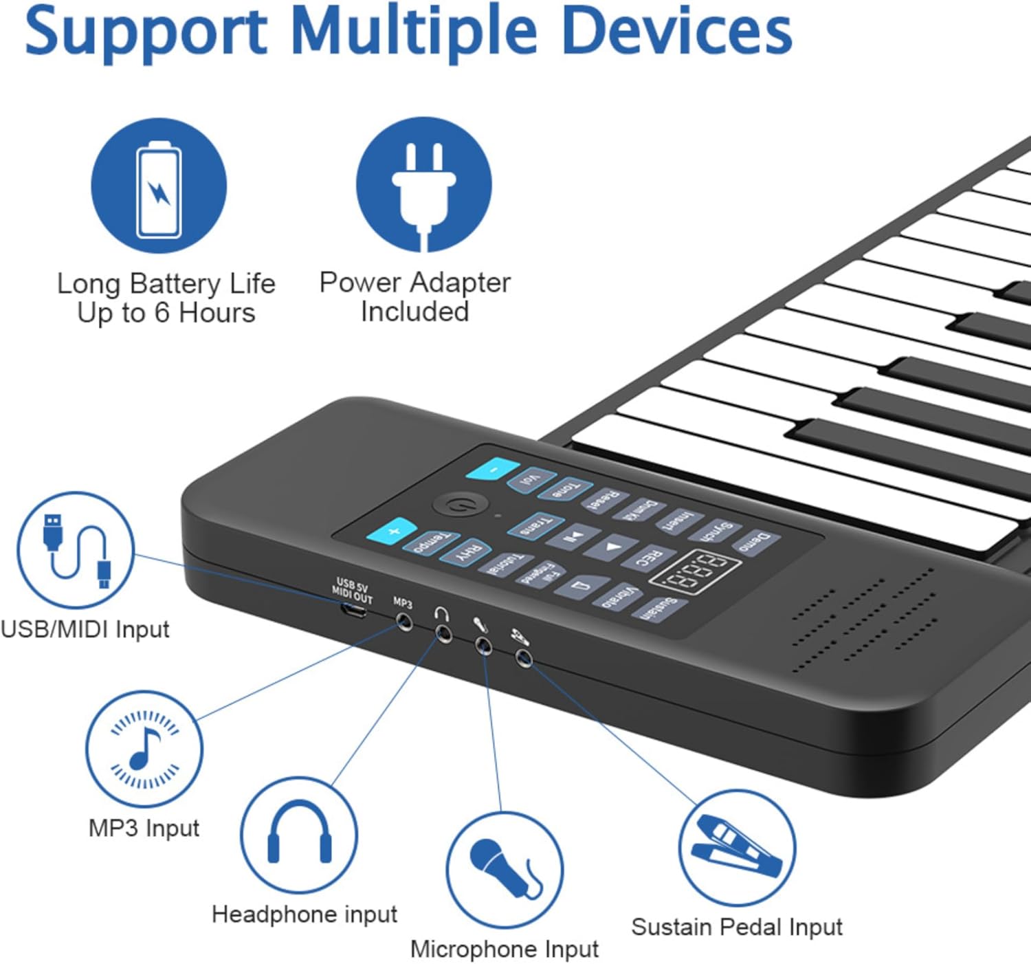 【Uso universale】: pianoforte avvolgibile portatile per tutte le età; con pianoforte standard a 88 tasti (A1-C9); con funzione Bluetooth MIDI per connessione APP. 【Impostazioni multiple】: pianoforte digitale avvolgibile con 128 toni, 128 ritmi, 14 brani demo con connessione Bluetooth. 【Multifunzione】: Piano elettrico portatile con, editing, riproduzione, sostegno, vibrato, lezioni, accordi, ecc. 【Facile da usare】: Piano portatile con display digitale a LED; gioco indipendente con il tuo altoparlante; supporta audio o cuffie esterni; è disponibile un pedale di sostegno esterno. 【Alimentazione】: il piano digitale può essere alimentato da una batteria al litio ricaricabile, un alimentatore esterno da 5 V CC o un alimentatore di ricarica mobile. Il supporto dell'uscita MIDI può essere utilizzato con la connessione a computer o tablet.