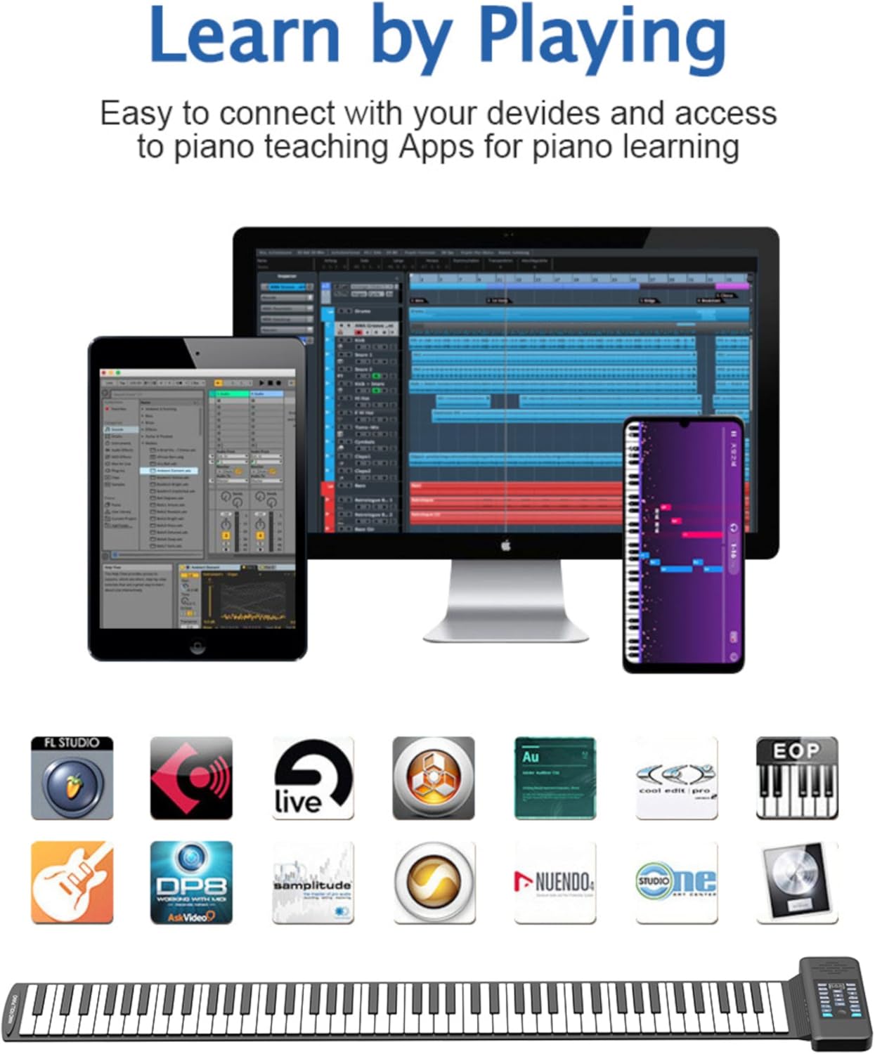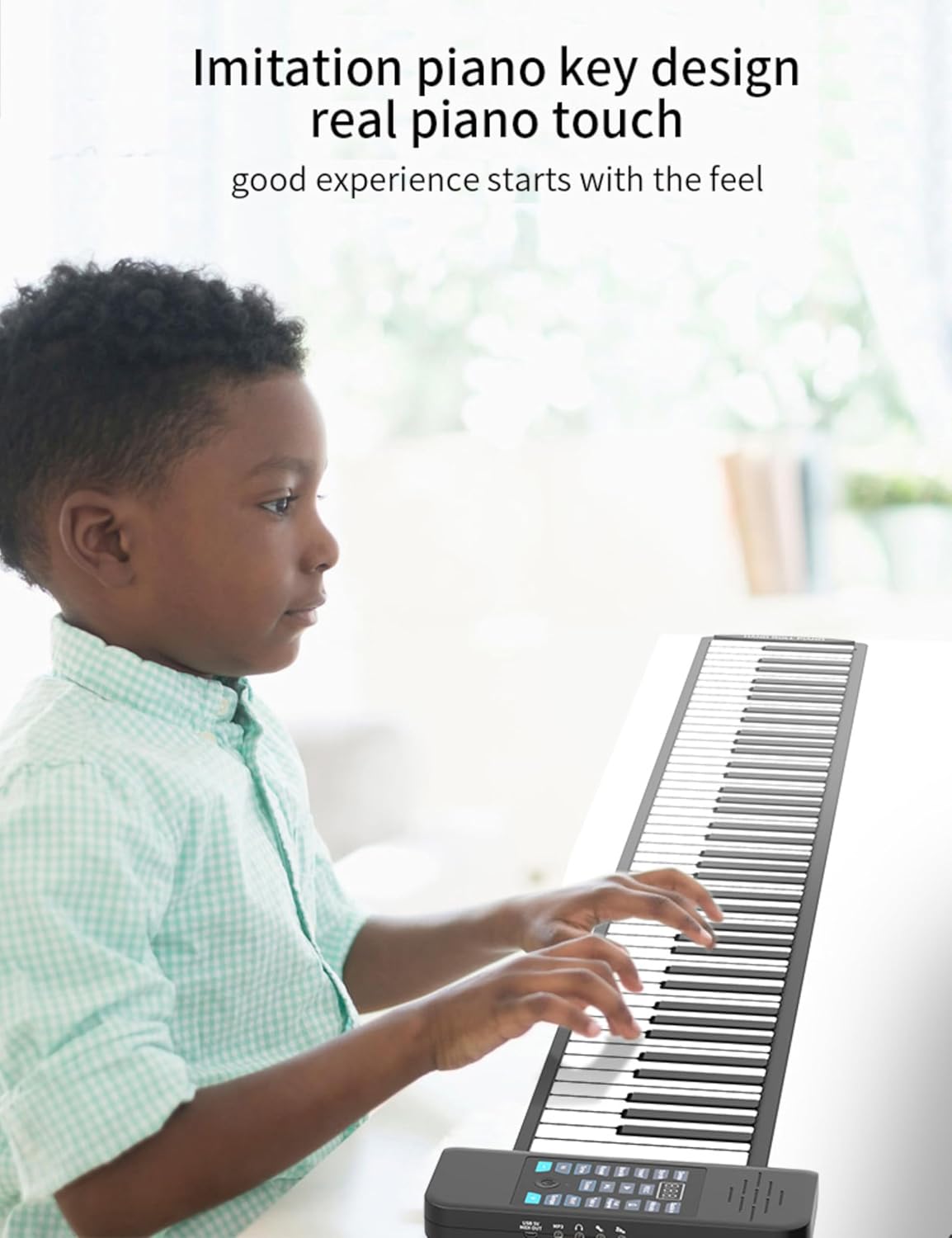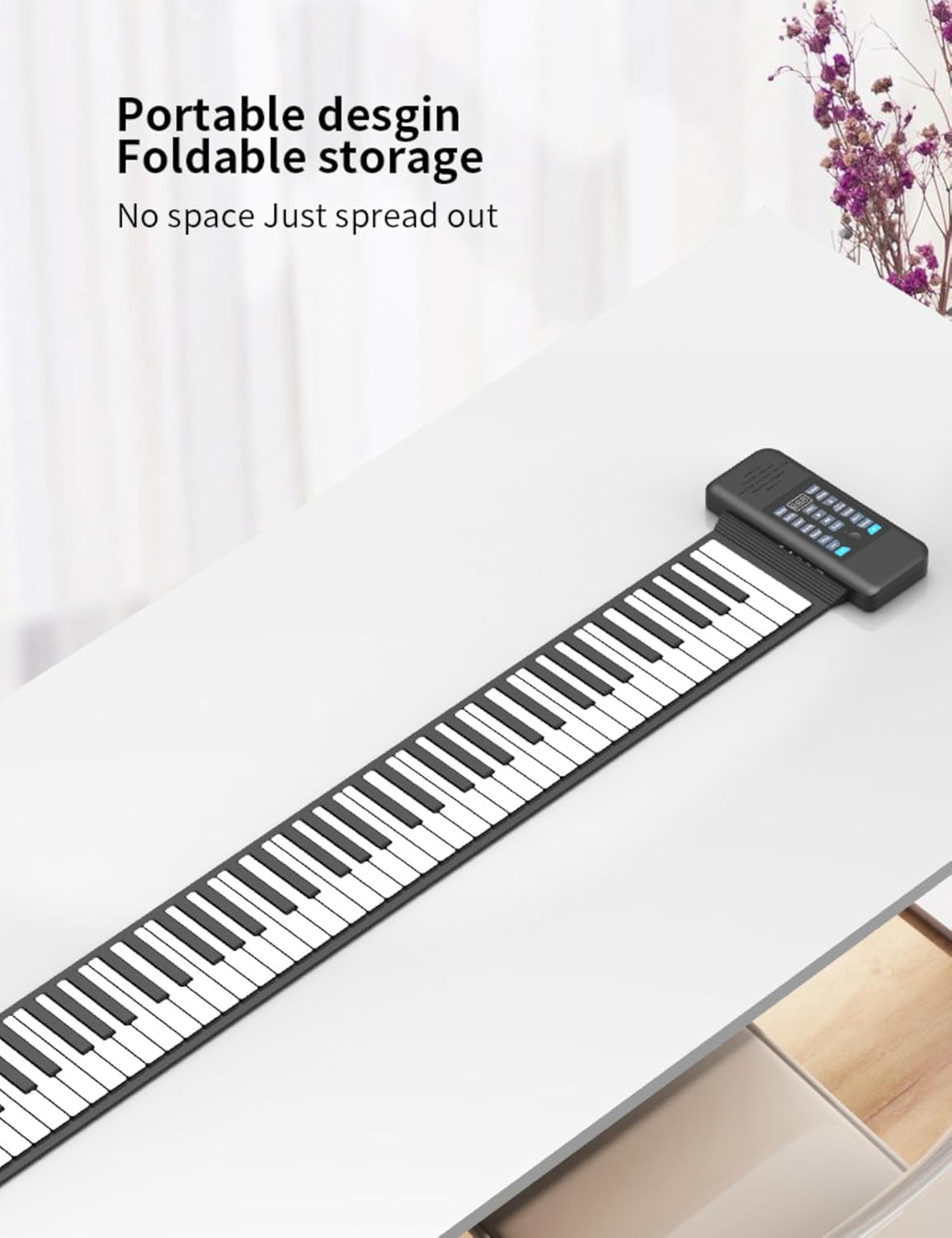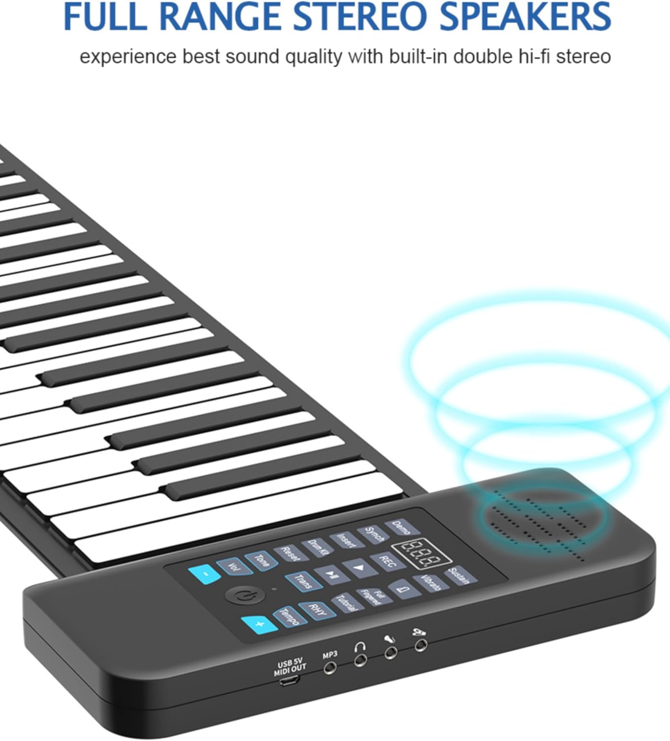 【Uso universale】: pianoforte avvolgibile portatile per tutte le età; con pianoforte standard a 88 tasti (A1-C9); con funzione Bluetooth MIDI per connessione APP. 【Impostazioni multiple】: pianoforte digitale avvolgibile con 128 toni, 128 ritmi, 14 brani demo con connessione Bluetooth. 【Multifunzione】: Piano elettrico portatile con, editing, riproduzione, sostegno, vibrato, lezioni, accordi, ecc. 【Facile da usare】: Piano portatile con display digitale a LED; gioco indipendente con il tuo altoparlante; supporta audio o cuffie esterni; è disponibile un pedale di sostegno esterno. 【Alimentazione】: il piano digitale può essere alimentato da una batteria al litio ricaricabile, un alimentatore esterno da 5 V CC o un alimentatore di ricarica mobile. Il supporto dell'uscita MIDI può essere utilizzato con la connessione a computer o tablet.