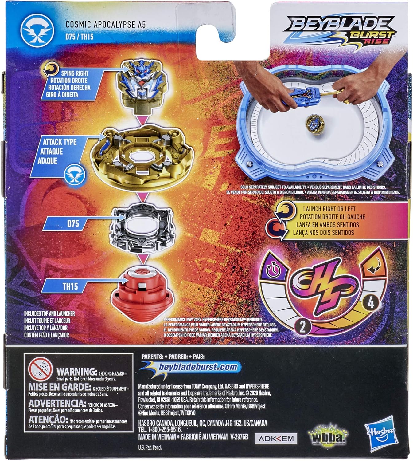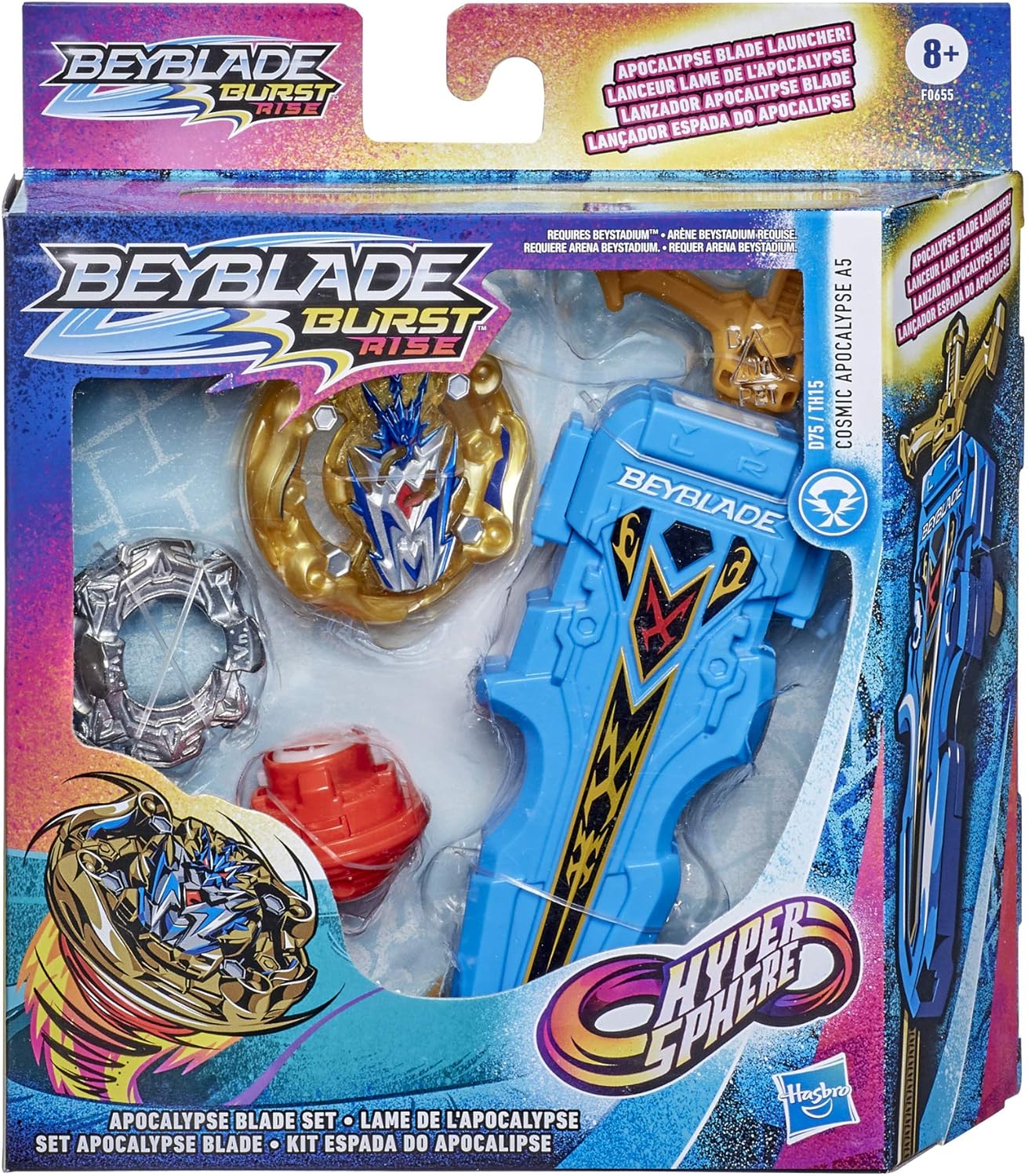 Lancio ad alta velocità: il lanciatore Apocalypse funziona con le truppe a rotazione destra e sinistra. Questo lanciatore a tema spa è progettato per accelerare le truppe Trottola Beyblade Burst: include una trottola Beyblade Burst Rise Hypersphere Cosmic Apocalypse A5 D75 TH1 di tipo attacco a rotazione destra Presa e attraente: le punte di performance Hypersphere sono progettate per arrampicarsi sulla parete verticale e combattere sul bordo. Arène Beystadium Beyblade Burst Hypersphere richiesta (venduta separatamente, nel limite delle scorte) Numeri combinati: si può scansionare il codice sul lanciatore Apocalypse e sullo strato di energia della truppa per poterli sbloccare nell'app Beyblade Burst e scambiare i componenti TUTA PERSONALIZZABILE CON PASTIGLIA GT: la trottola viene venduta con una pastiglia GT a rotazione destra. Intercambiabile con altre trottole compatibili con le pastiglie GT a rotazione destra (vendute separatamente, nel limite delle scorte)