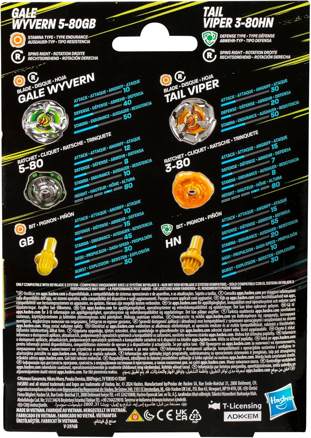 FARE LE SUE PROVE IN COMBATTO: Beyblade X offre tutto il brivido della competizione con intense battaglie di trottola che spingono i Blader a superarsi. Basta assemblare le trotte, metterle sui lanciatori, quindi... 3-2-1 Ipervelocità! (Beystadium Beyblade X Arena e lanciatore richiesto, venduto separatamente) PASSARE ALLA VELOCITÀ SUPERIORE: Beyblade X presenta il nuovissimo sistema di propulsione X Quando i denti del pignone e della ferrovia di propulsione X si incontrano, le trottole sono alimentate ad alta velocità per causare K.O. esplosivi mozzafiato e impatti spettacolari (compatibili solo con il sistema Beyblade X) 3 PEZZI FACILI DA MONTARE: I dischi, i cricchetti e i pignoni intercambiabili delle trottola Beyblade X si assemblano e si sassemblano facilmente. In un piccolo giro e due clic, siamo pronti a combattere Padroneggiare la potenza: include 2 trottole Beyblade X progettate da Takara Tomy con autentiche parti in metallo fuso: Gale Wyvern 5-80GB a rotazione diritta di tipo endurance e Tail Viper 3-80HN a rotazione diritta di tipo difesa con disco di tipo resistenza. STRATEGIE DI COMBATO: Le quattro punte del disco profilate di Gale Wyvern riducono la resistenza all'aria per mantenere la trottola rotante. Tail Viper ha lame che puntano verso il basso per rallentare un avversario che cerca un K.O. dall'ultimo sopravvissuto