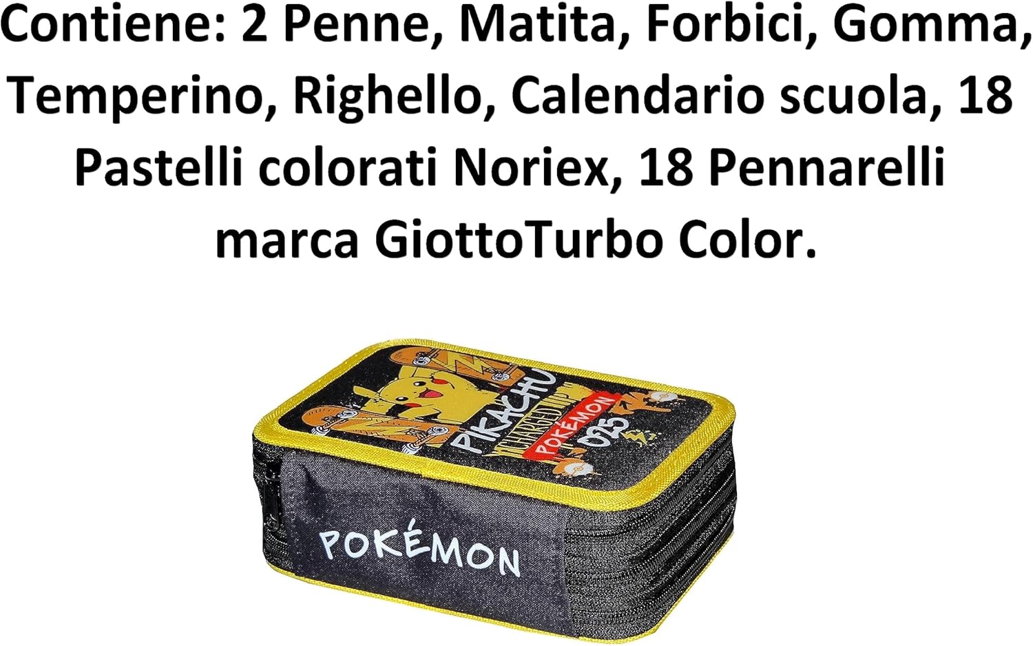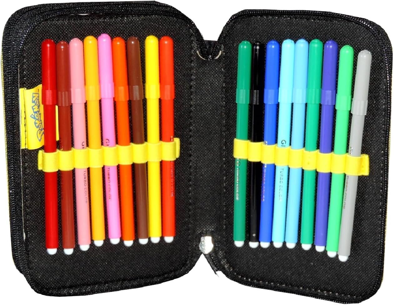 Astuccio 3 Scomparti a Zip Cerniere Astuccio Scuola Elementare Bambino Realizzato in Poliestere dai colori Giallo e Nero CONTIENE: 2 Penne, Matita, Forbici, Gomma, Temperino, Righello, Calendario scuola, 18 Pastelli colorati Norex, 18 Pennarelli Giotto NOTA BENE: Solo i Pennarelli sono marchio GIOTTO MISURE: 20cm x 13,5 cm x 6,5cm