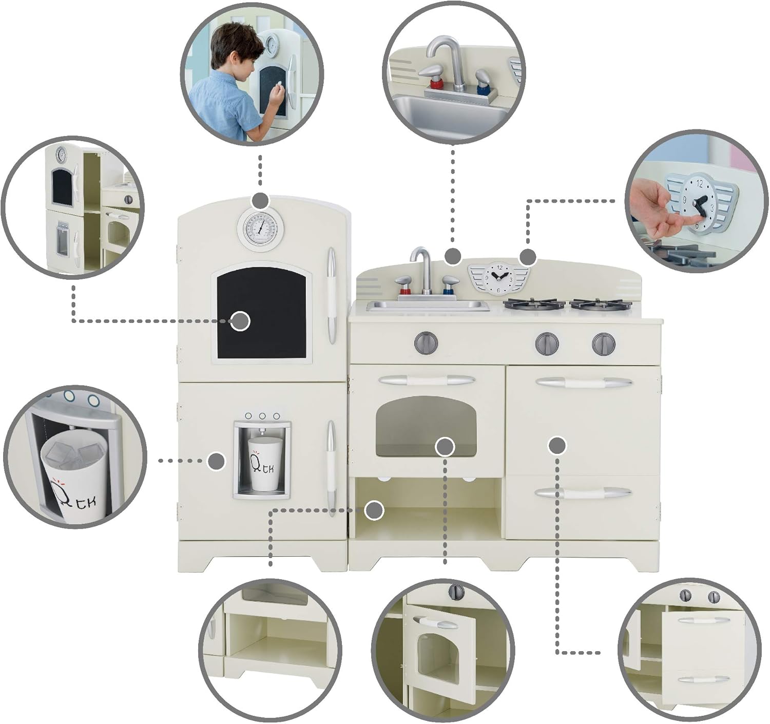 Sapientemente realizzato in MDF ecologico (conforme CARB Phase 2) metallo e plastica. Il frigorifero ha due porte termometro e lavagna per gessetti che permette di scrivere la lista della spesa. La cucina dispone di orologio giocattolo tre sportelli del forno due fornelli un lavello asportabile e tre manopole che girano e scattano. Grande per far giocare piů bambini contemporaneamente. Consigliato dai 3 anni in su