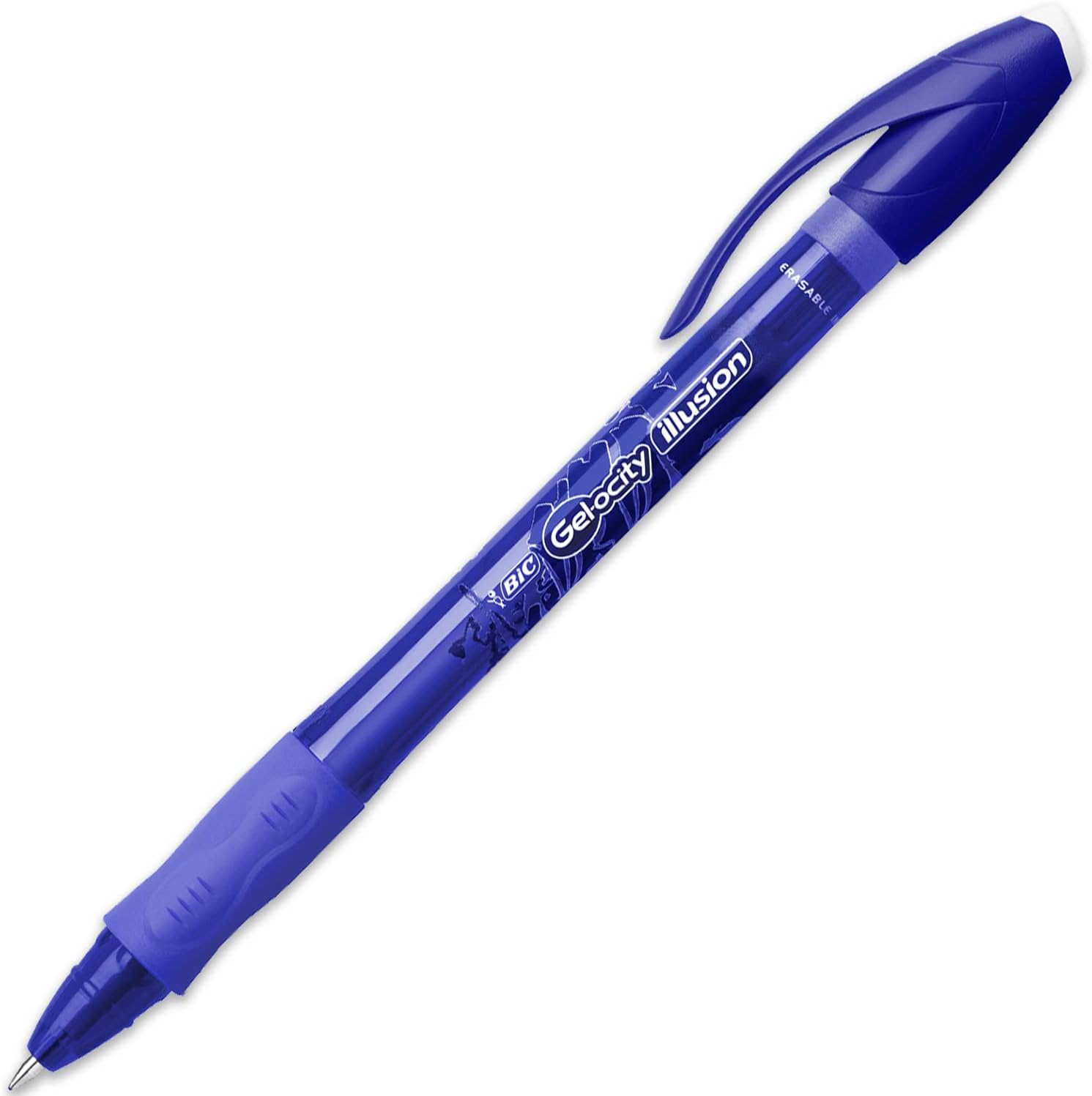 BIC Penne Gel-ocity Illusion. Le penne cancellabili blu contengono inchiostro gel sensibile al calore e vengono cancellate utilizzando la gomma situata all'estremità del tappo. Le penne blu contengono una comoda impugnatura e una pratica clip da tasca. La penna a sfera retrattile Bic 4 Colors Shine è perfetta per prendere appunti, disegnare o per un diario colorato proiettile. Contiene inchiostro nero, blu, rosso e verde. Questo set contiene tre penne.