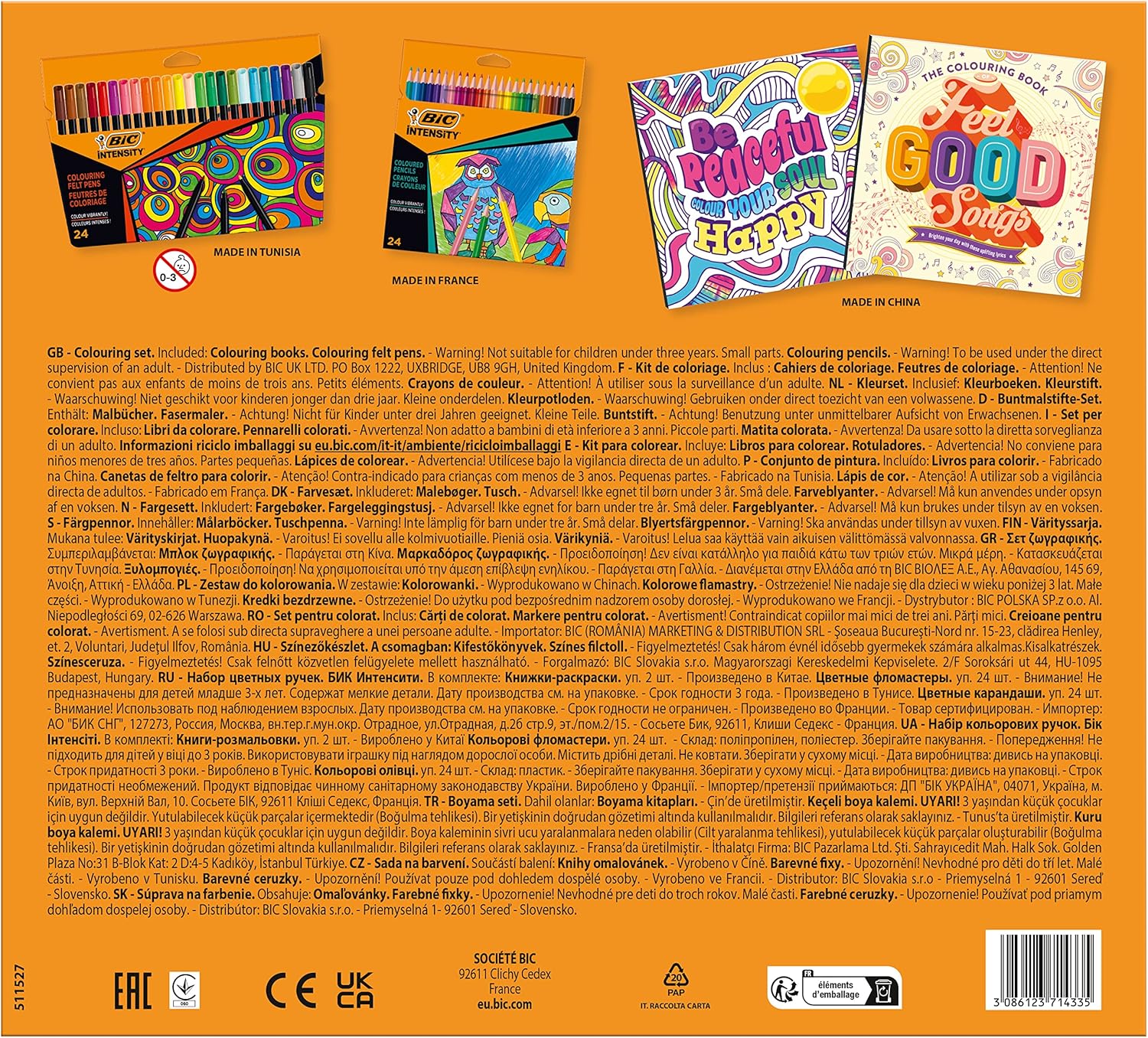 Dai colore alle tue giornate e alla tua creatività con questo set di cancelleria BIC Intensity Sviluppa la tua creatività con questo kit che comprende pennarelli colorati, matite colorate e libri da colorare Il set include 24 pennarelli colorati BIC Intensity per disegnare con tratti da 0.9mm e 24 matite colorate con mine da 3.2mm resistenti alla pressione Completano il set due colouring book per rilassare la mente: Colour You Soul Happy & Feel-Good Songs Qualità BIC