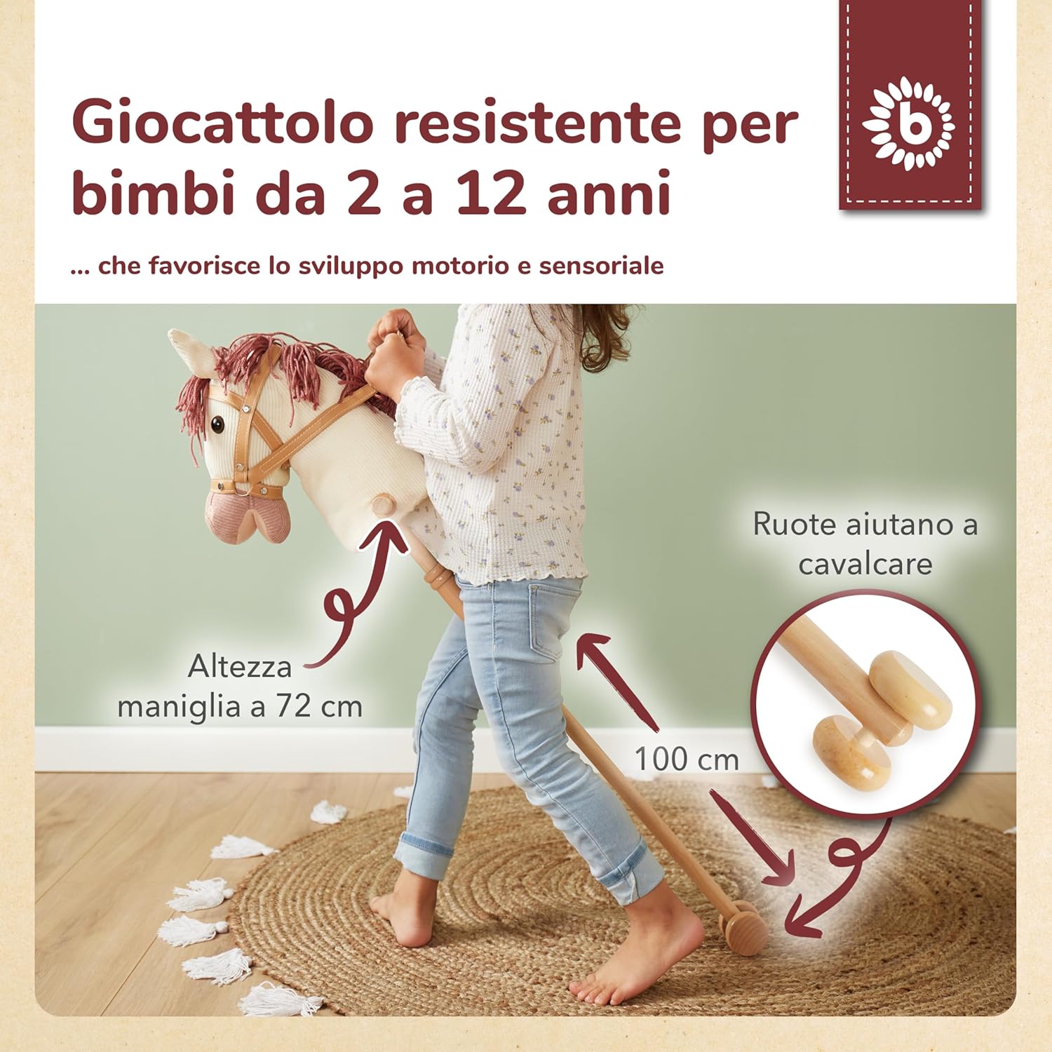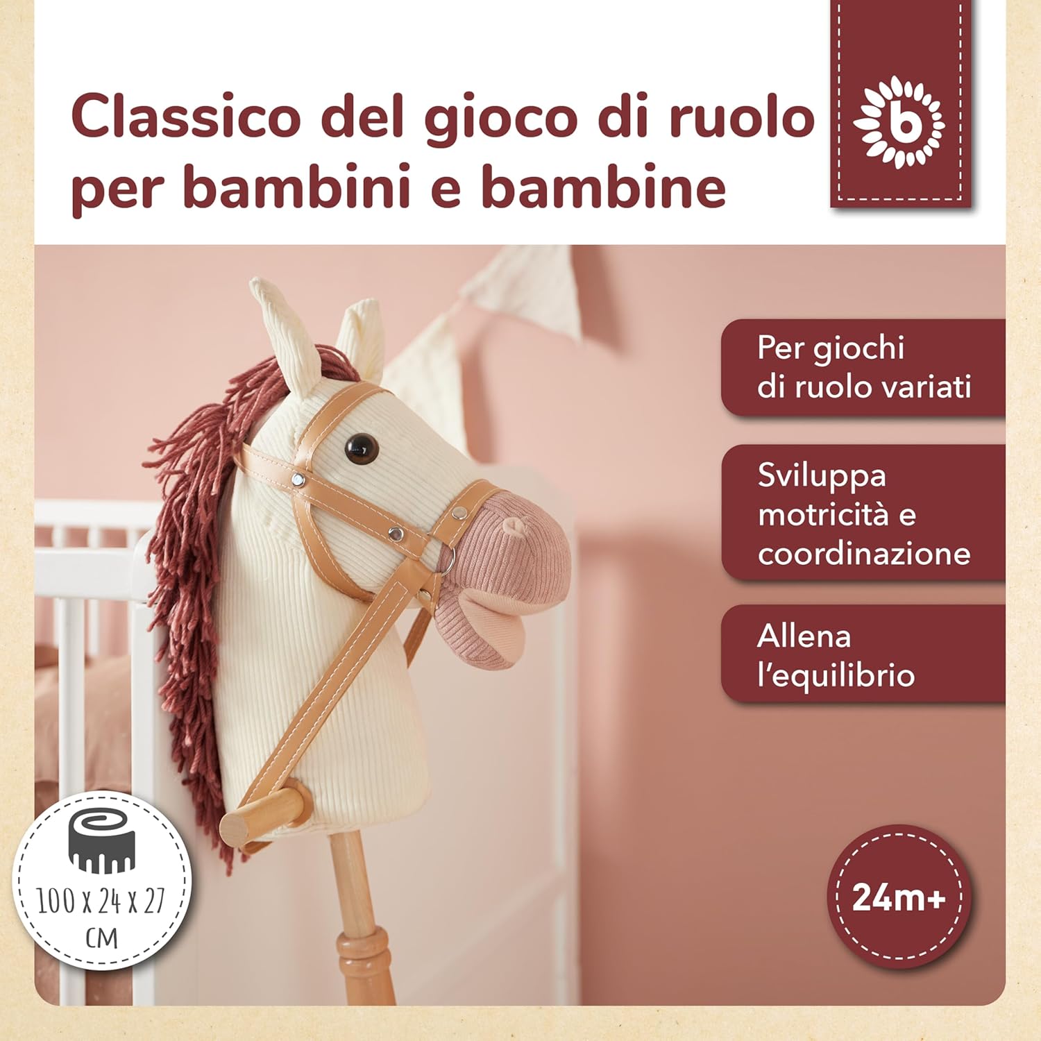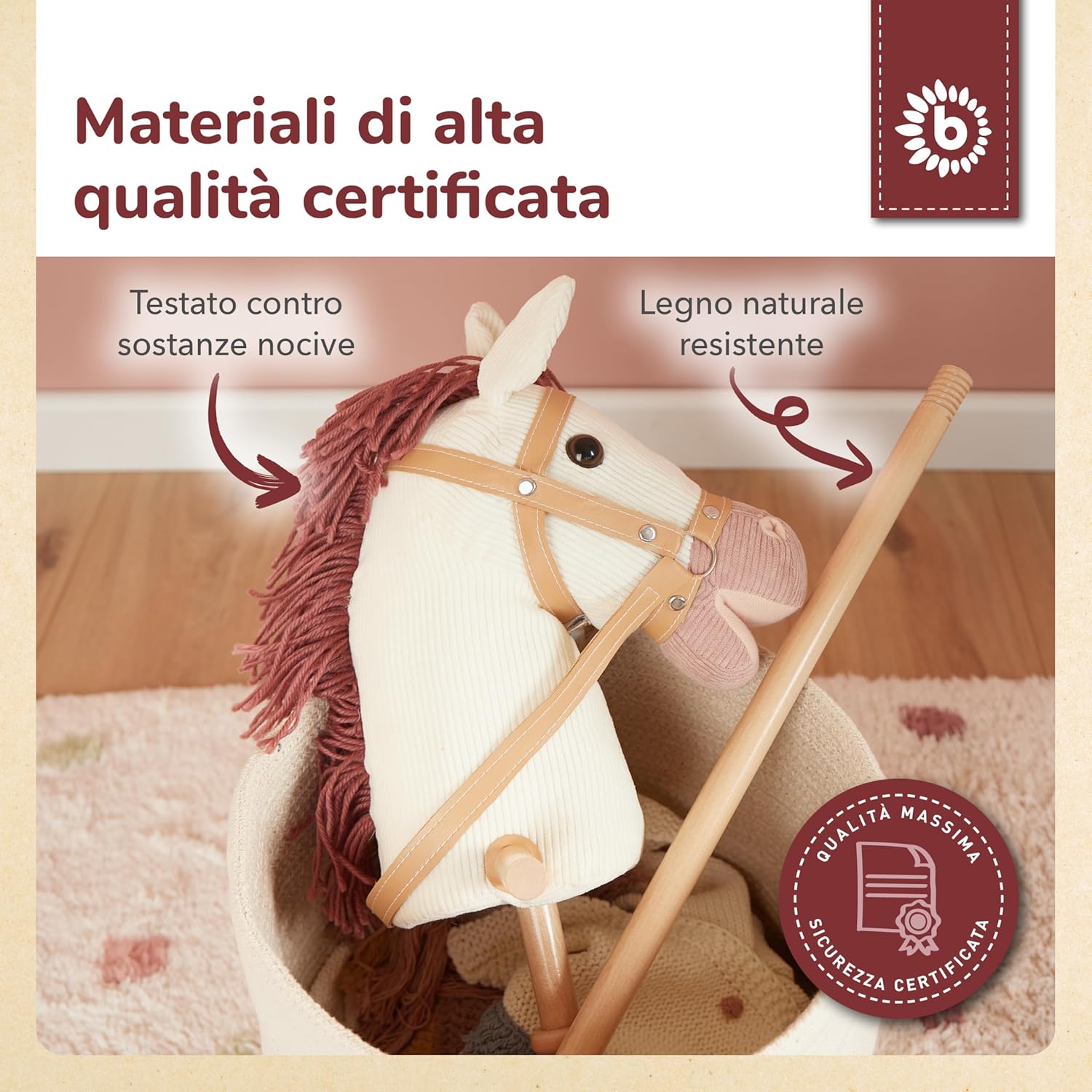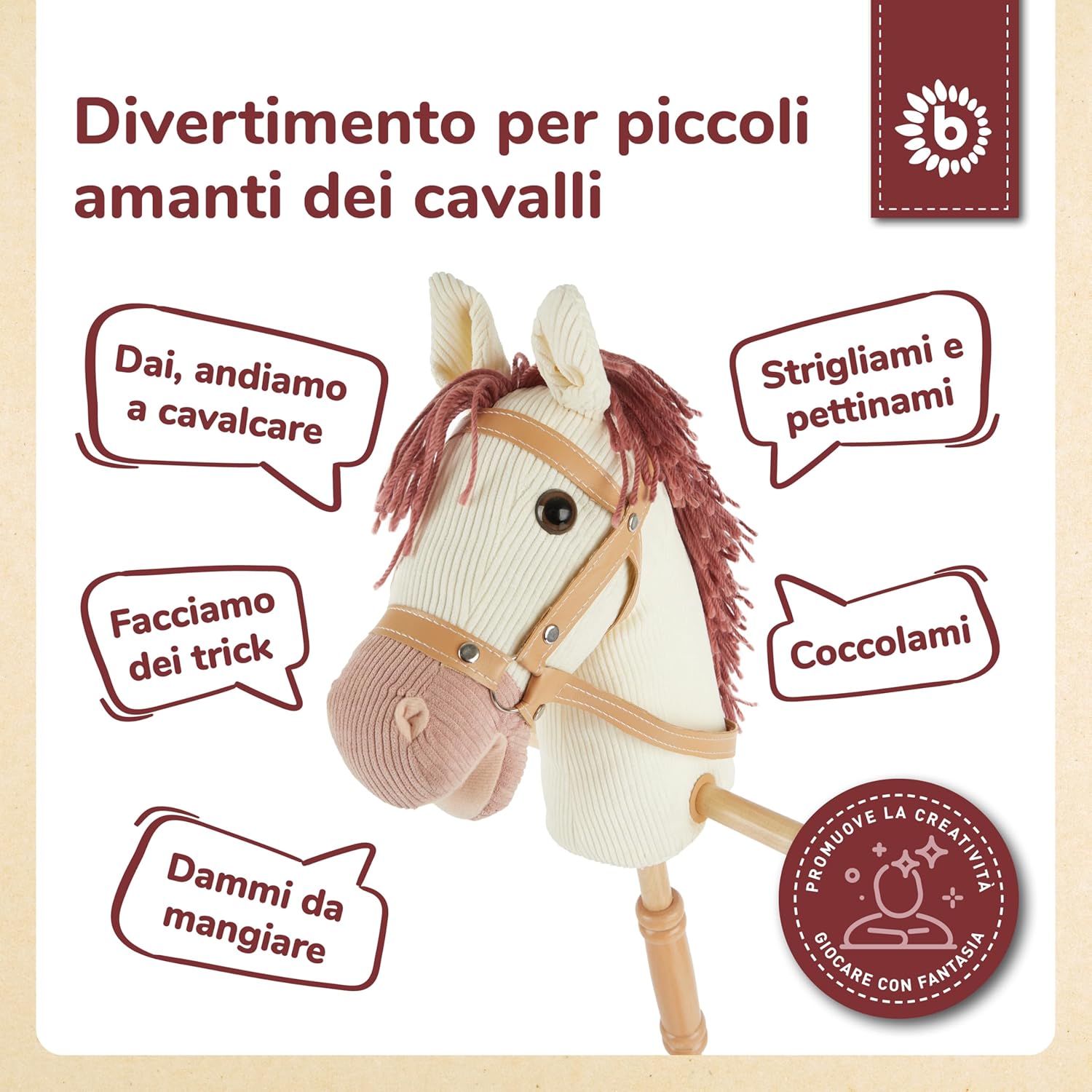 Valido dal punto di vista pedagogico: che si tratti di avventure a cavallo come Bibi e Tina nella fattoria di Martin, Cow-boy&Ind-ianer o un nobile cavaliere su un alto cavallo. Alto fattore di divertimento: il simpatico cavallo in velluto a coste invita a fare una lunga cavalcata o a galoppare nella scuderia del salotto. Divertimento a cavallo per bambini e bambine Ottima idea regalo: che si tratti di un compleanno o di una ricorrenza intermedia, il cavallo di legno è perfetto come regalo. Ecco come rendere felici bambini e genitori Realizza i tuoi sogni: Con questo grande cavallo da tavolo farete battere il cuore di ogni piccolo amante dei cavalli. Contenuto della fornitura: Dimensioni: circa 102,5 x 24 x 27 cm. Robusta asta in legno e ruote in legno scorrevoli, maniglie incluse.