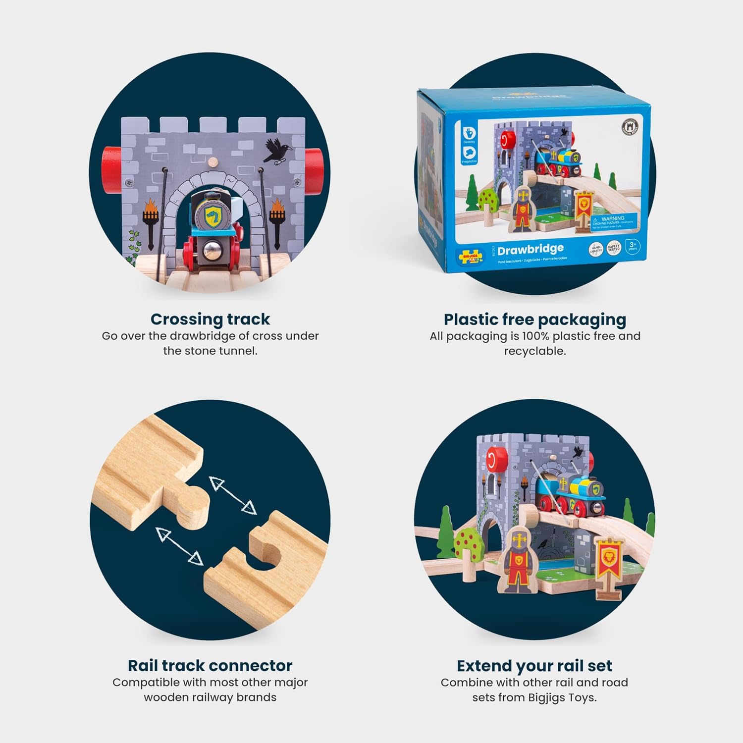 Ponte levatoio in legno con manopole girevoli rosse per sollevare il ponte e bloccare l’accesso dei nemici! La maggior parte dei marchi di trenini in legno è compatibile con Bigjigs Rail. Costituisce un perfetto complemento per qualsiasi set per trenino in legno. Età 3+ anni. Fabbricato con materiali di elevata qualità e ricavati responsabilmente.