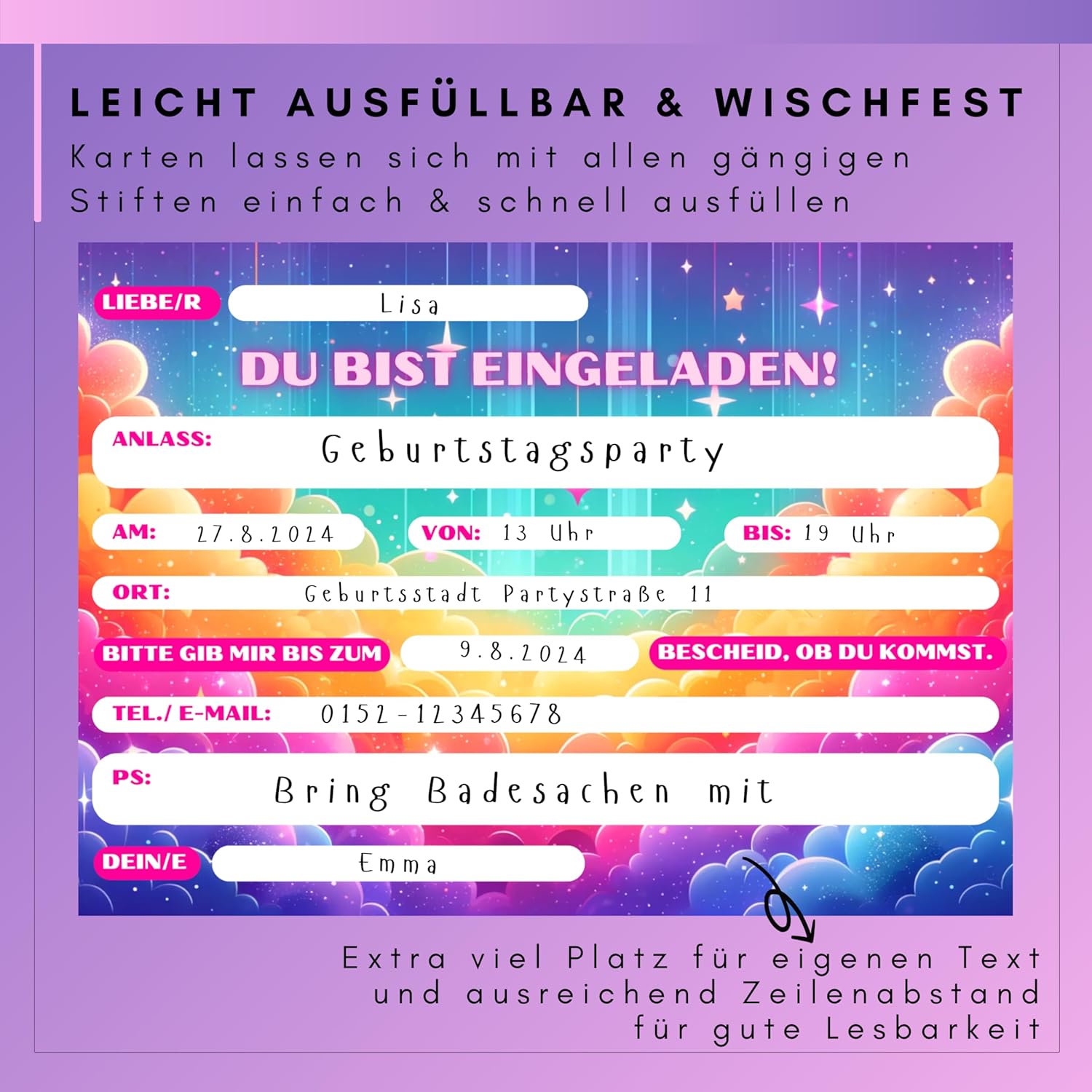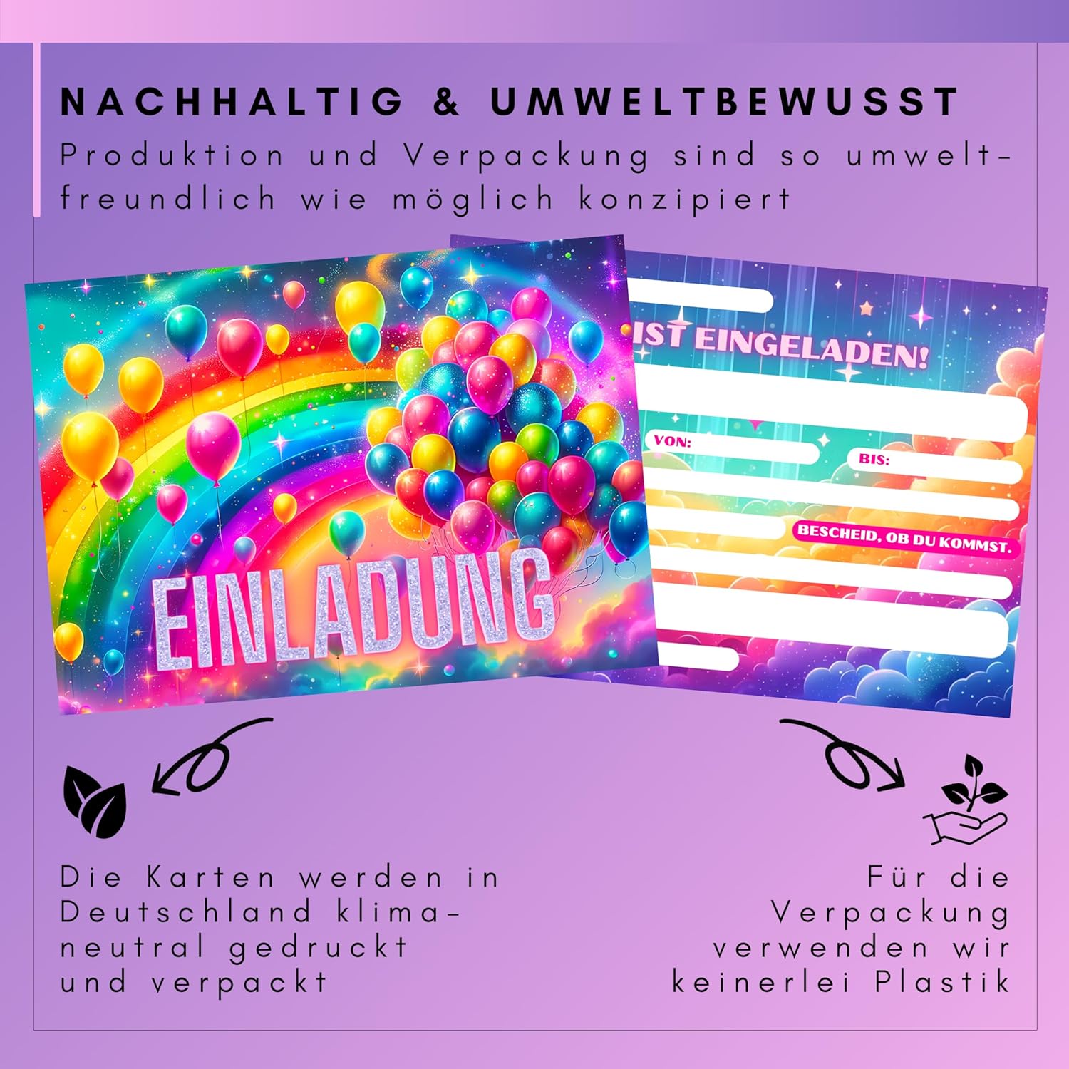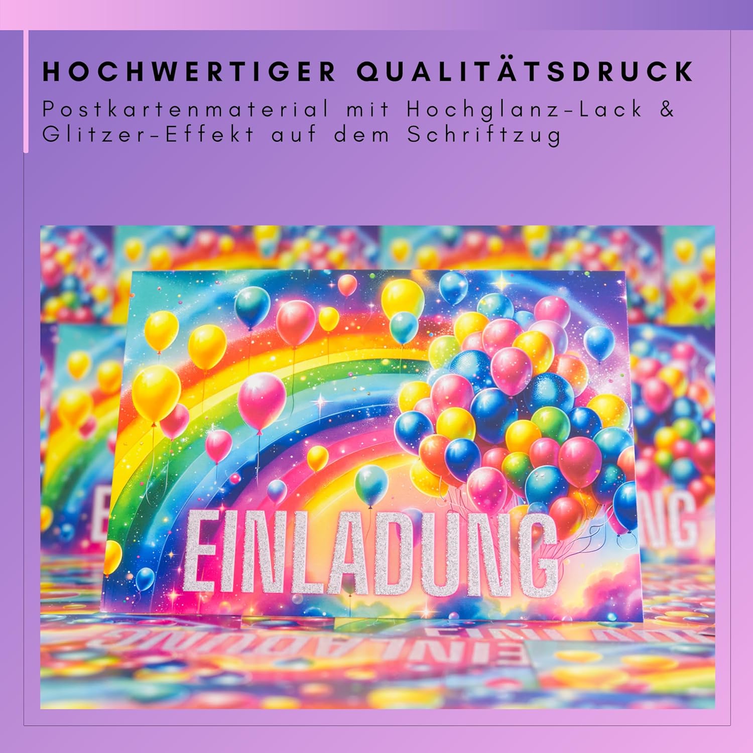 🌈 INCANTEVOLE ARCOBALENO I Trasforma l'invito per il compleanno di un bambino in un'avventura: i nostri esclusivi biglietti d'invito arcobaleno sono un must per ogni festa di compleanno: un vero colpo d'occhio che promette gioia. 🌈 CON VERI GLITTER I Ogni biglietto d'invito è ricoperto da una vernice glitterata che copre parti del biglietto d'invito. Questo crea lo speciale effetto scintillante. 🌈 ALTA QUALITÀ E RISPETTOSO DELL'AMBIENTE I I nostri biglietti d'invito per compleanno sono stampati su materiale per cartoline di alta qualità e particolarmente resistente. Inoltre, non utilizziamo plastica per l'imballaggio. 🌈 PIÙ FACILE DA COMPILARE E A PROVA DI PULIZIA I I nostri biglietti d'invito sono un gioco da ragazzi da compilare utilizzando i campi forniti. Inoltre, grazie al materiale a prova di sbavature, ogni informazione importante è perfettamente conservata, anche con il riempitivo! 🌈 ECCO COSA RICEVERAI I 12 inviti arcobaleno in formato cartolina DIN A6 (10,5 cm x 14,8 cm), stampati su entrambi i lati e consegnati in modo sicuro in una busta robusta. La parte anteriore è stampata con glitter e vernice lucida e la parte posteriore è scrivibile.