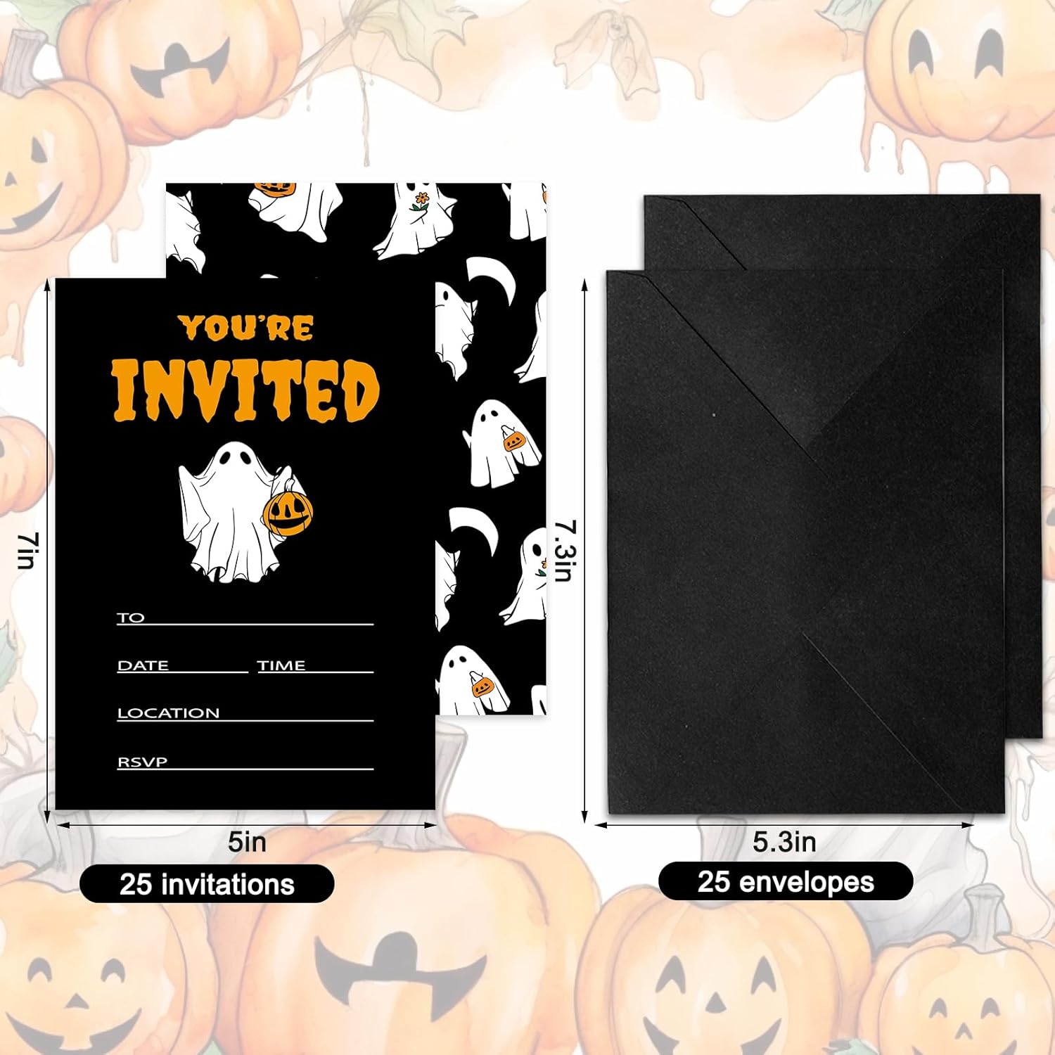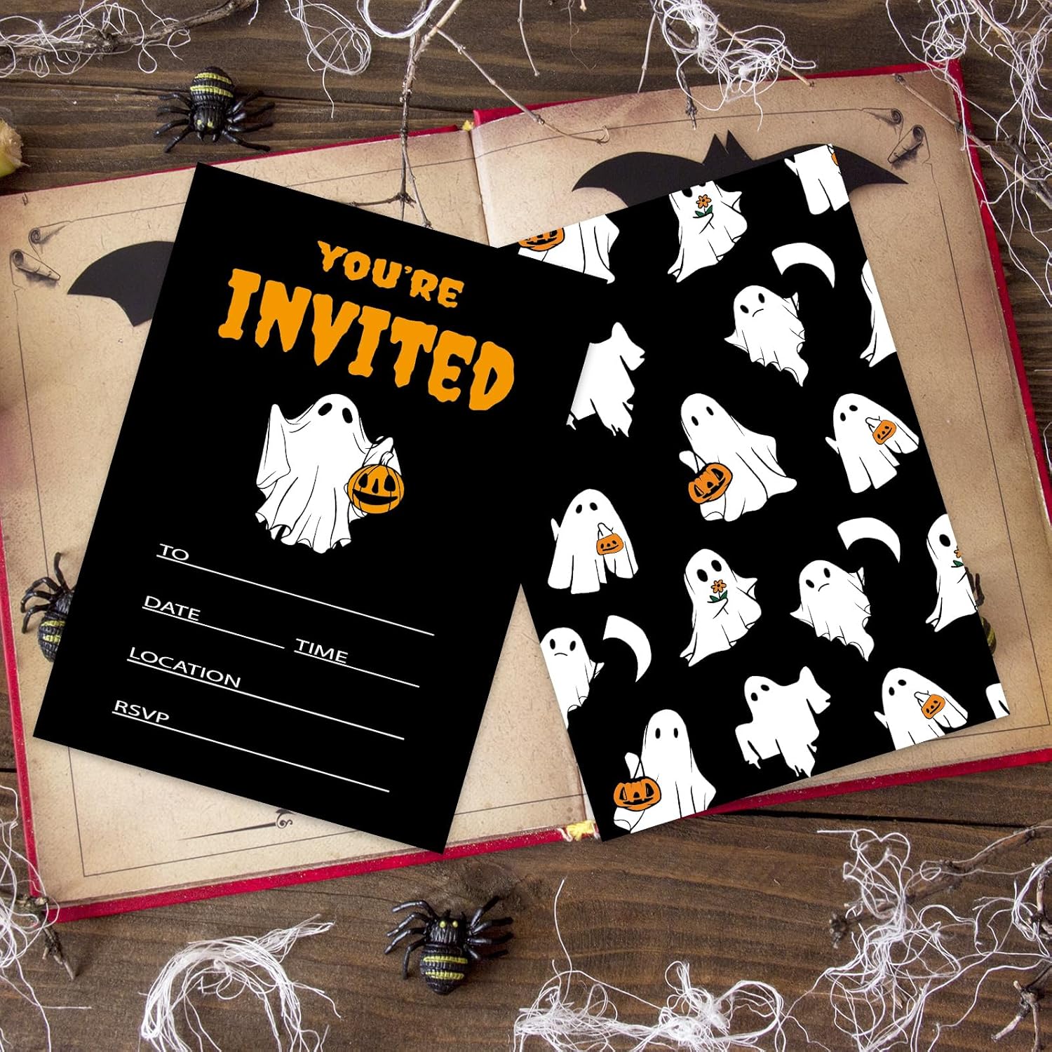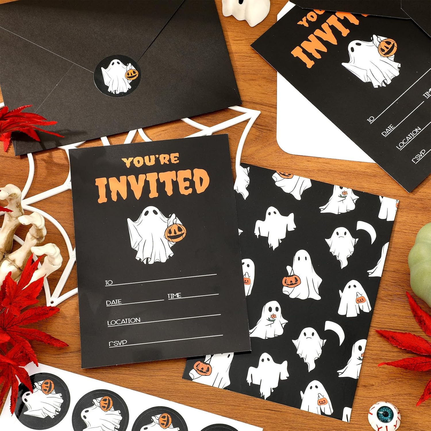 Riceverai: 25 biglietti d'invito con 25 buste e 25 adesivi con sigillo abbinati sono inclusi nella confezione, un set completo che rende la pianificazione della festa facile e divertente DESIGN SPETTRALE - Questi inviti presentano un giocoso tema nero e arancione con stampe di fantasmi e zucche a copertura totale, perfetti per le feste di Halloween. Buona qualità: realizzato in carta di alta qualità, con indicazioni chiare sulle informazioni e un'interlinea sufficientemente ampia, molto scorrevole e scorrevole da scrivere. E puoi usare gli adesivi per sigillare la busta. Dimensioni adeguate: i biglietti d'invito sono 5" x 7", con buste di dimensioni adeguate abbastanza grandi da contenere i biglietti, aggiungendo un tocco professionale e a tema ai tuoi inviti di Halloween. Ampia gamma di usi: perfetti per feste di Halloween, eventi dolcetto o scherzetto ed eventi in case stregate, ideali da regalare ai tuoi amici, vicini, familiari, insegnanti, leader ai tuoi compagni di classe.