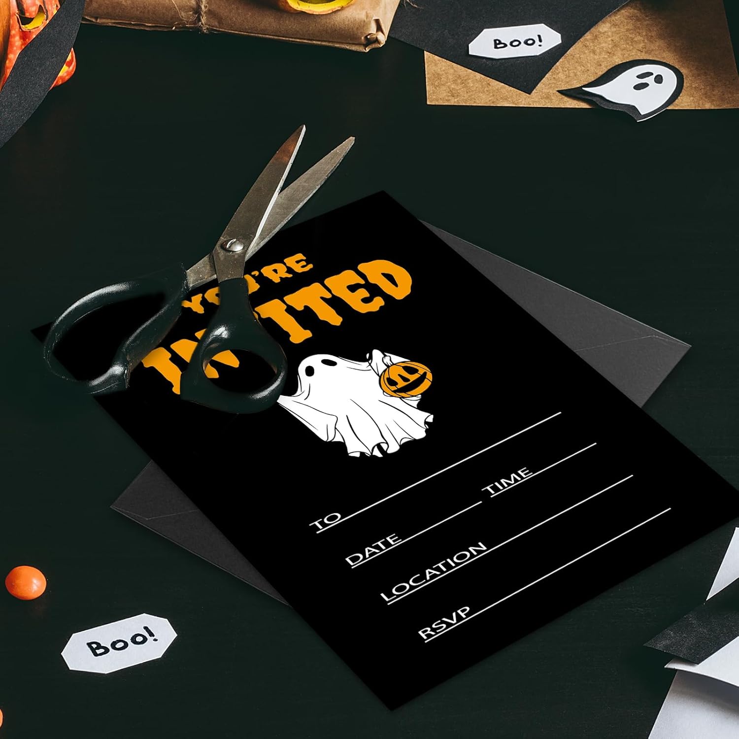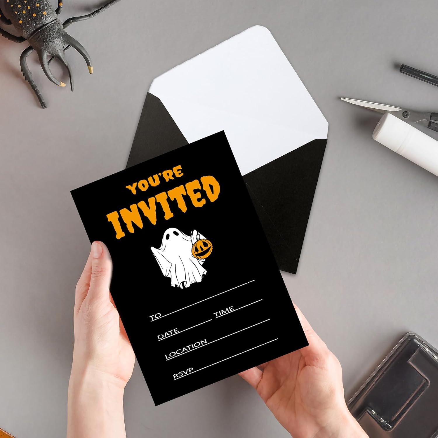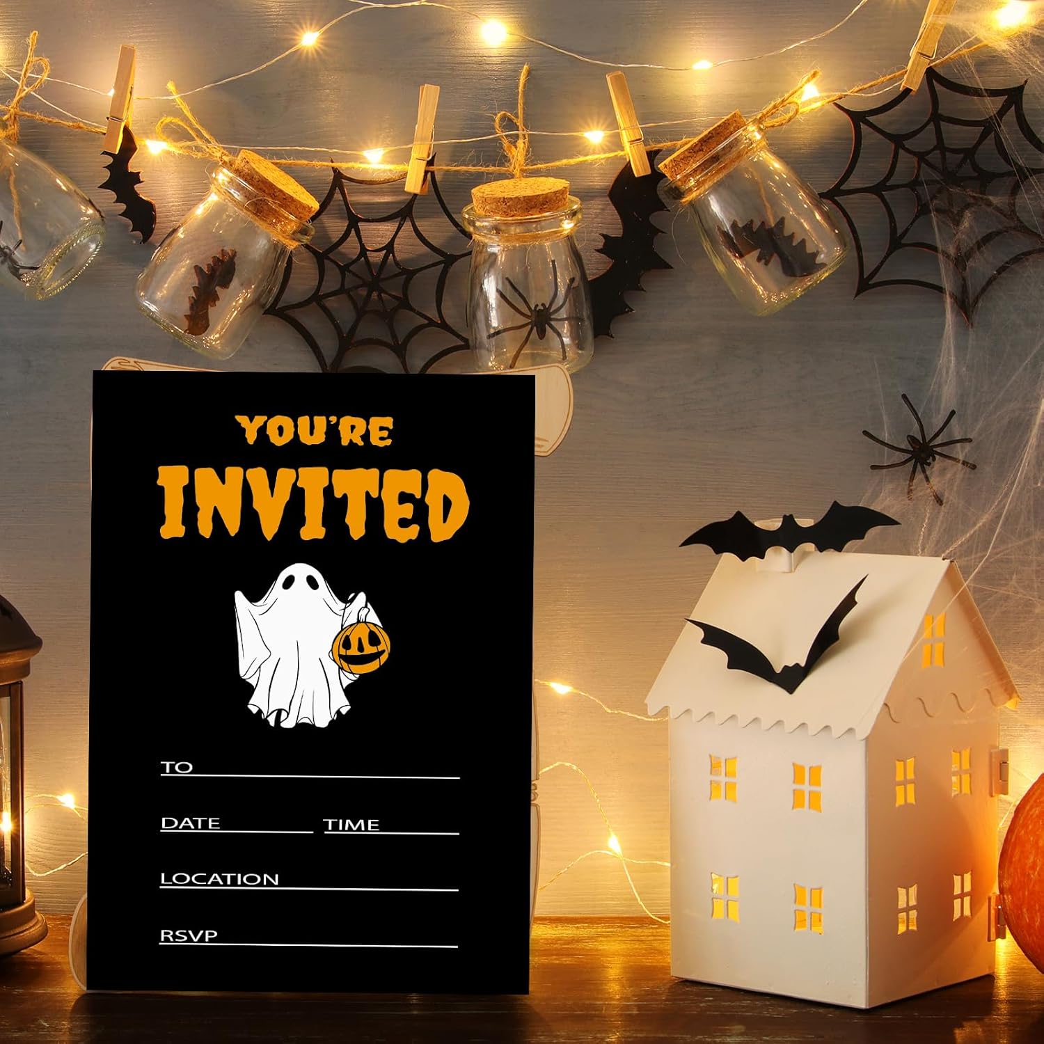 Riceverai: 25 biglietti d'invito con 25 buste e 25 adesivi con sigillo abbinati sono inclusi nella confezione, un set completo che rende la pianificazione della festa facile e divertente DESIGN SPETTRALE - Questi inviti presentano un giocoso tema nero e arancione con stampe di fantasmi e zucche a copertura totale, perfetti per le feste di Halloween. Buona qualità: realizzato in carta di alta qualità, con indicazioni chiare sulle informazioni e un'interlinea sufficientemente ampia, molto scorrevole e scorrevole da scrivere. E puoi usare gli adesivi per sigillare la busta. Dimensioni adeguate: i biglietti d'invito sono 5" x 7", con buste di dimensioni adeguate abbastanza grandi da contenere i biglietti, aggiungendo un tocco professionale e a tema ai tuoi inviti di Halloween. Ampia gamma di usi: perfetti per feste di Halloween, eventi dolcetto o scherzetto ed eventi in case stregate, ideali da regalare ai tuoi amici, vicini, familiari, insegnanti, leader ai tuoi compagni di classe.