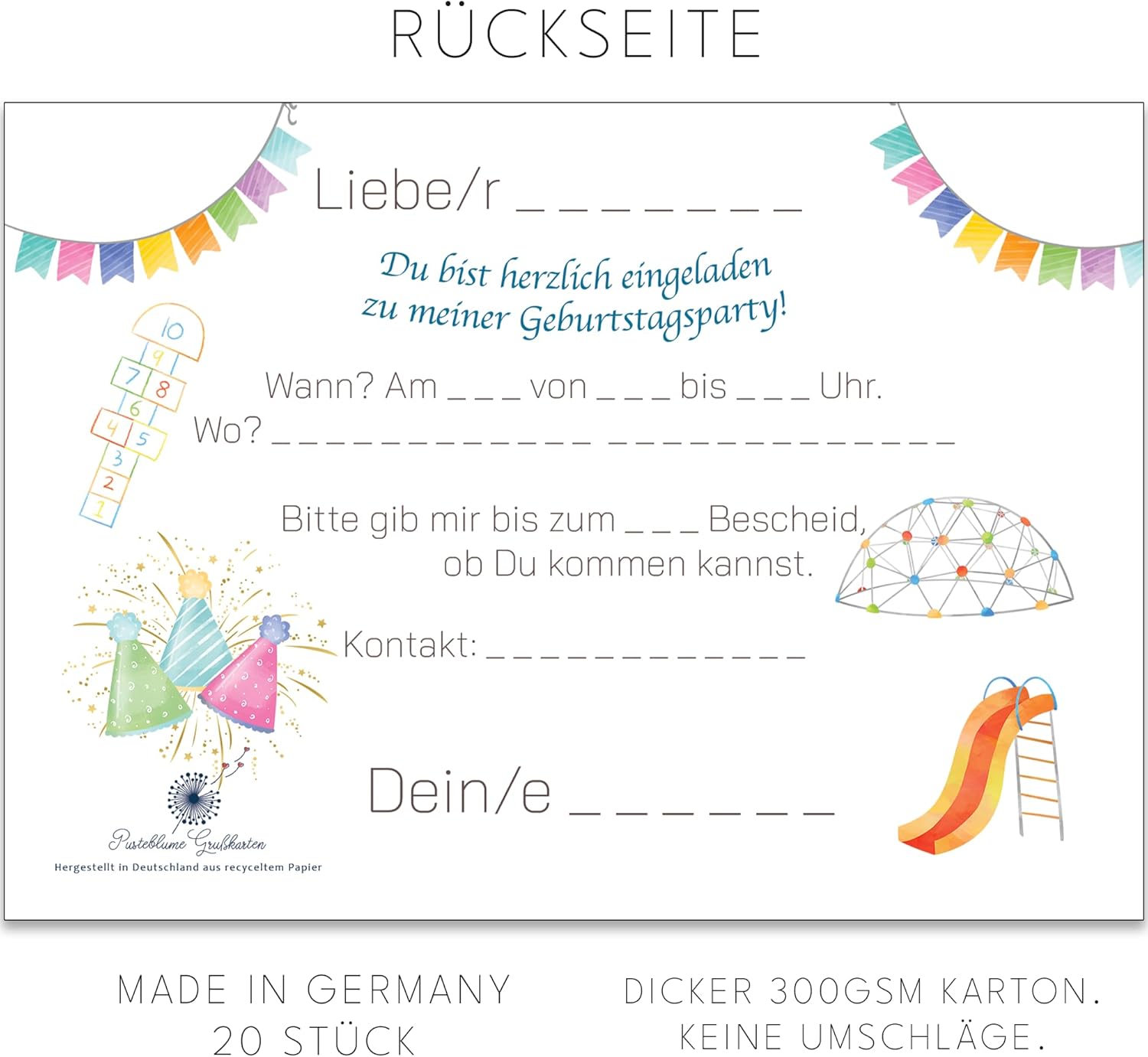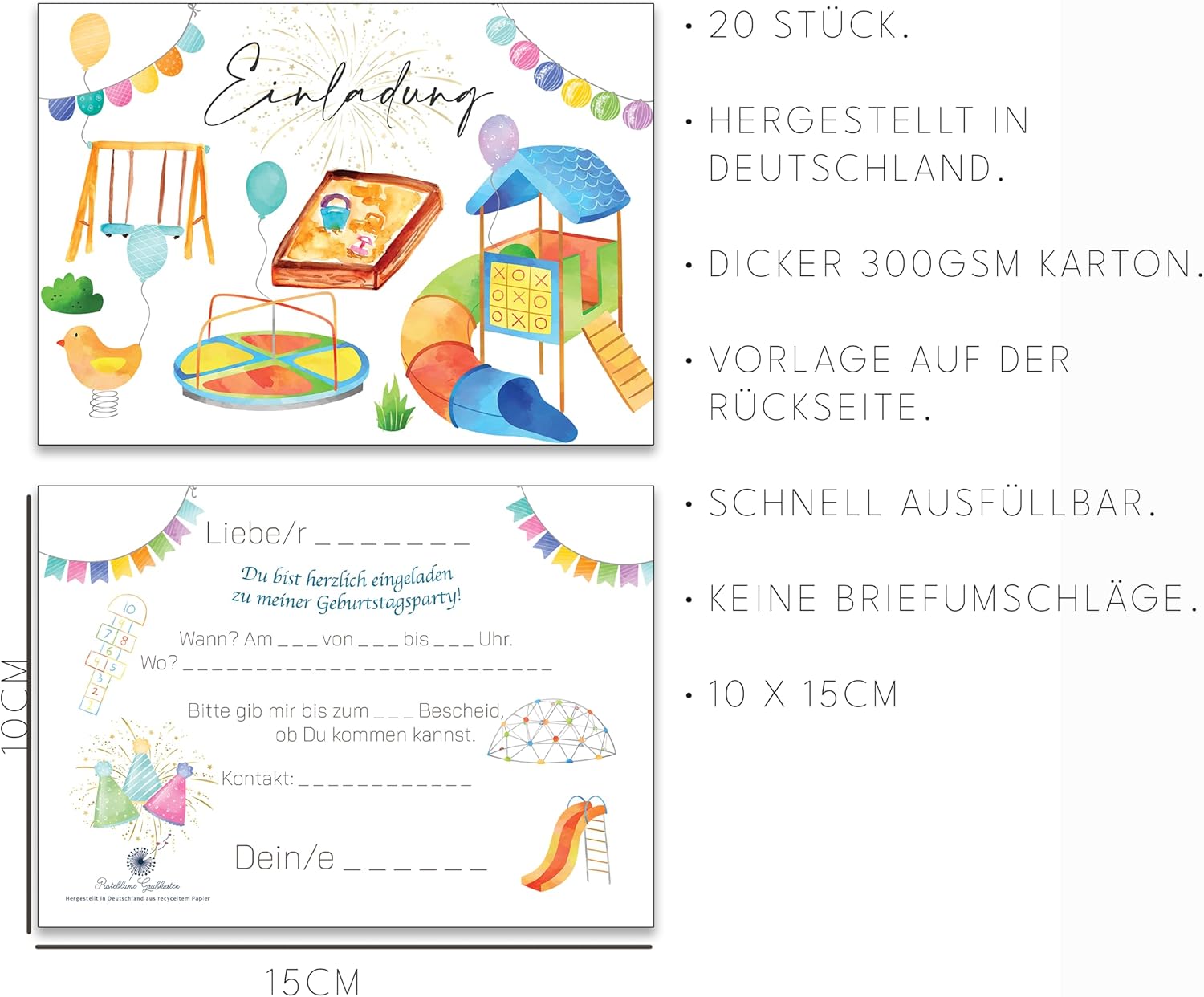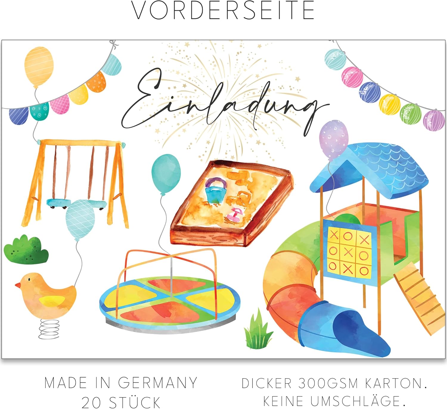 Sollevare in alto sullo scivolo, nella sabbiera o dondolare insieme: con questi biglietti d'invito realizzati con amore la festa del parco giochi sarà indimenticabile! Il set contiene 20 carte in formato A6 con un colorato motivo parco giochi sulla parte anteriore, ideale per i bambini attivi che amano festeggiare all'aperto. I biglietti sono realizzati in cartone riciclato e combinano sostenibilità con un design allegro. Sul retro c'è abbastanza spazio per tutte le informazioni importanti sulla festa: chi invita quando e dove si gioca, e se forse si devono portare scarpe di ricambio o cappello da sole. Basta compilare, distribuire – e l'anticipazione può iniziare! Formato A6: maneggevole, ordinato e perfetto da distribuire a scuola o all'asilo. Realizzato in cartone riciclato, ecologico e resistente. Progettato con amore da una piccola azienda a conduzione familiare in Germania, qualità con cuore.