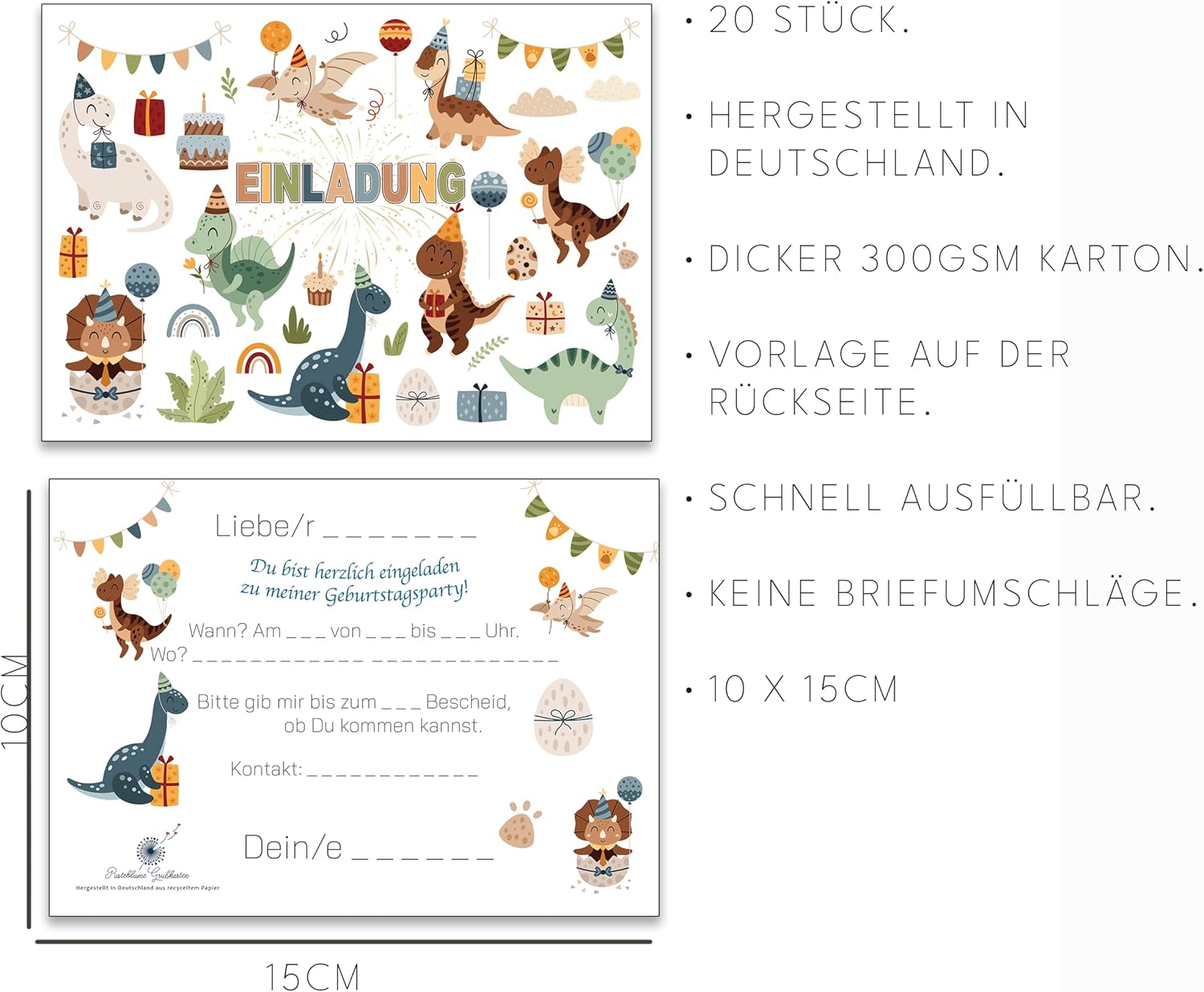 Colorato, allegro, fantastico: con questi biglietti d'invito arcobaleno il compleanno dei bambini diventa una piccola festa già quando si invita! Questo set contiene 20 biglietti A6 con un arcobaleno decorato con cura sulla parte anteriore, simbolo di gioia, amicizia e tanto divertimento. I biglietti sono realizzati in cartone riciclato, robusto, ecologico e progettato con amore. Sul retro c'è abbastanza spazio per tutte le informazioni importanti sulla festa: chi invita quando sorge la pausa e dove si nasconde il prossimo uovo di dinosauro? Basta compilare, distribuire e iniziare il viaggio nel tempo! Formato A6: maneggevole, ordinato e perfetto da distribuire a scuola o all'asilo. Realizzato in cartone riciclato, ecologico e resistente. Progettato con amore da una piccola azienda a conduzione familiare in Germania, qualità con cuore.