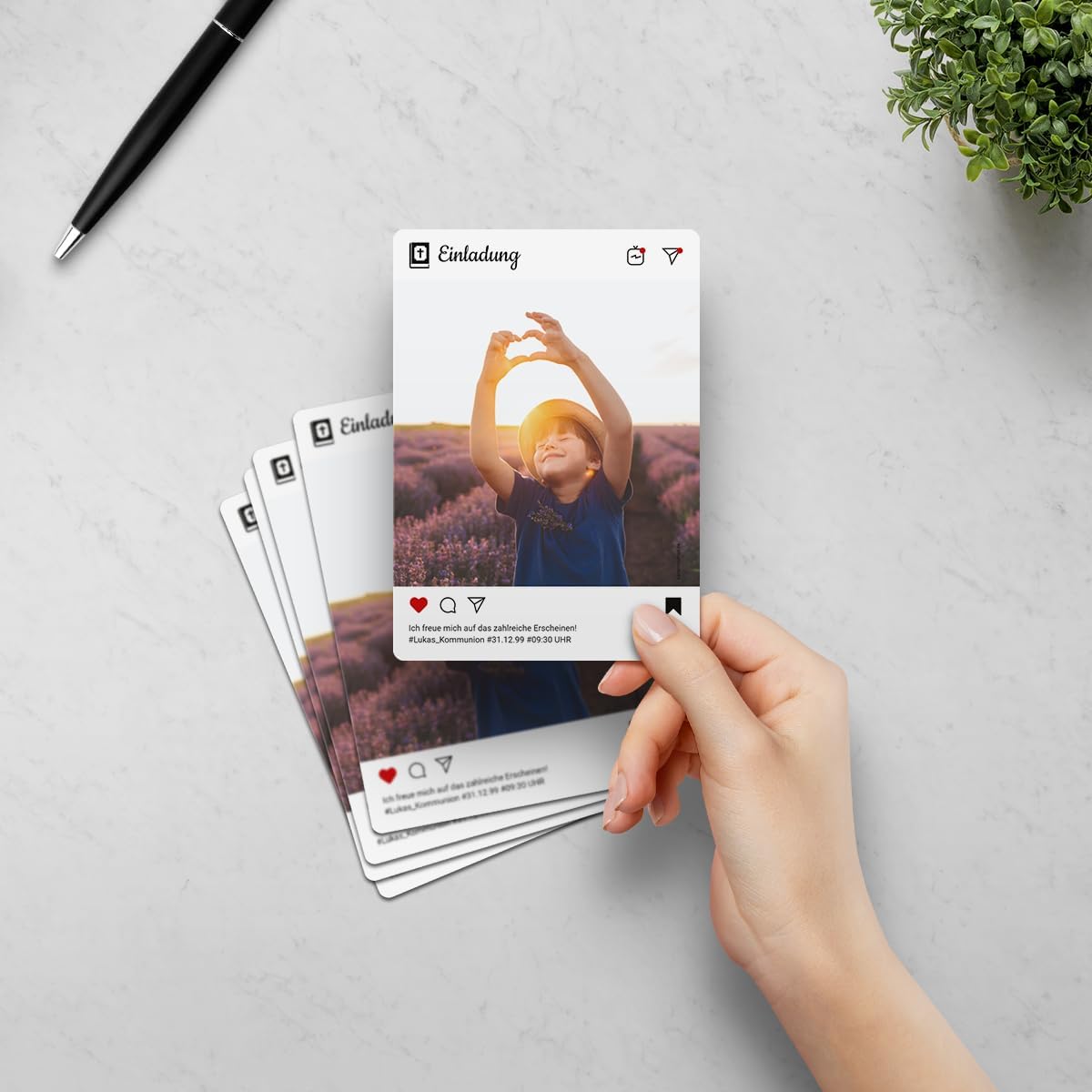 Formato: DIN A6 verticale (105 x 148 mm), Materiale: Carta 300 g/mq Stampa: Digitale, Dettagli: Stampato individualmente, Angoli arrotondati, Con la tua foto Inclusa la stampa dei tuoi testi e della tua foto Made in Germany e spedizione nazionale veloce Altri fantastici biglietti d'invito, extra per feste e buste nel nostro negozio!