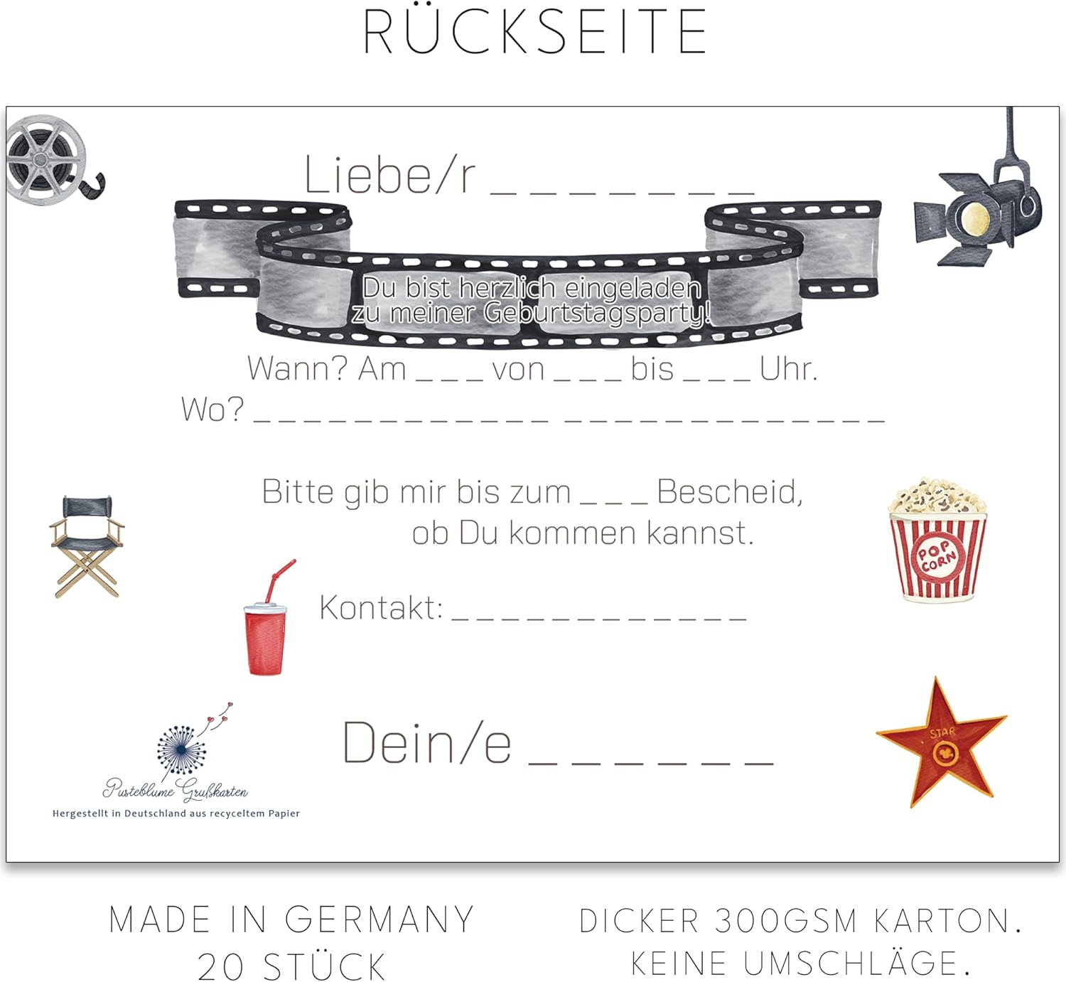 Film per la festa di compleanno più cool! Questo set contiene 20 biglietti d'invito in formato A6 con un allegro motivo cinema sul davanti, perfetti per i piccoli appassionati di film che vogliono festeggiare il loro grande giorno con popcorn, risate e avventure emozionanti. Che si tratti di un vero cinema o di un'atmosfera home theater, queste carte portano un tocco di Hollywood nella cameretta dei bambini! I biglietti sono realizzati in cartone riciclato e sono quindi non solo eleganti, ma anche ecologici. Sul retro c'è abbastanza spazio per tutte le informazioni importanti: quando viene eseguito il film, dove si svolge la festa e chi è invitato? Basta compilare, distribuire e si dice: "Si prega di prendere spazio, il film inizia!" Formato A6: maneggevole, ordinato e perfetto da distribuire a scuola o all'asilo. Realizzato in cartone riciclato, ecologico e resistente. Progettato con amore da una piccola azienda a conduzione familiare in Germania, qualità con cuore.