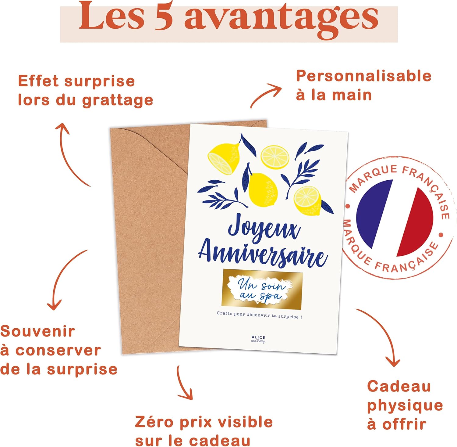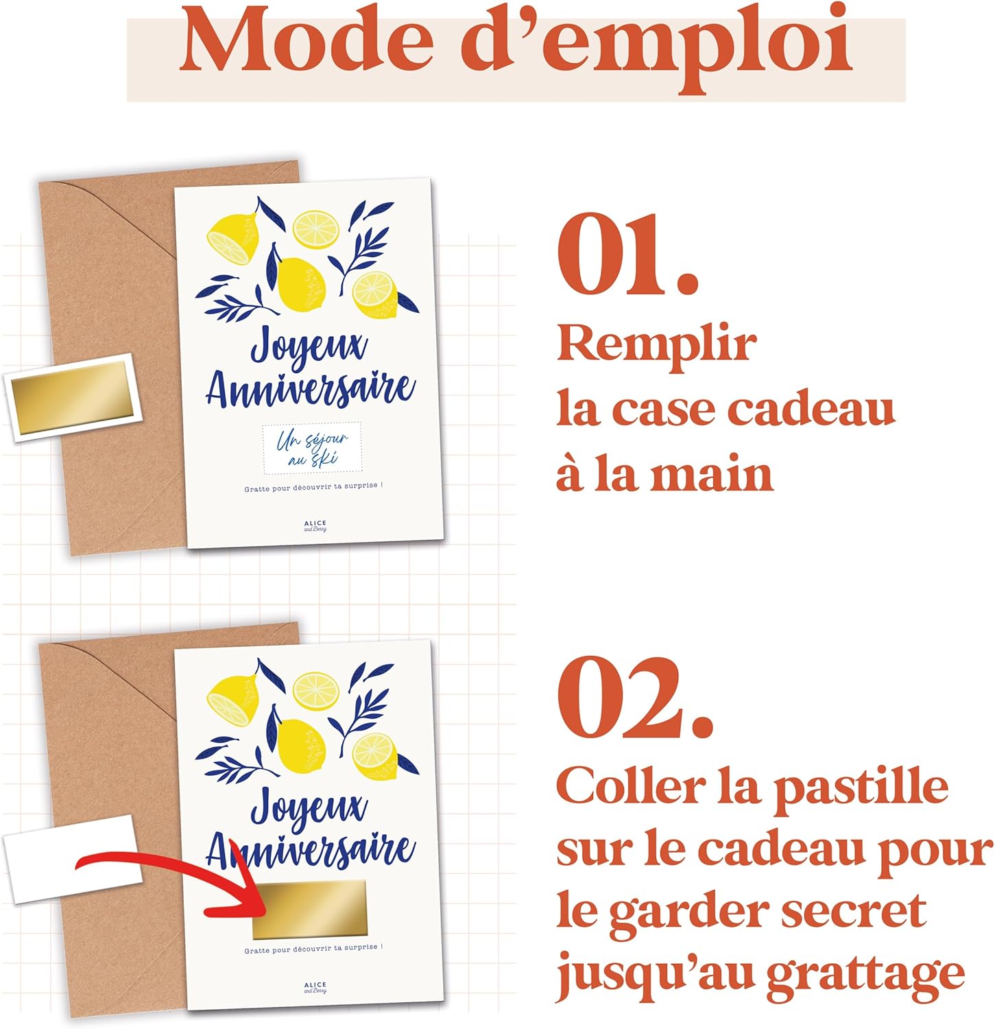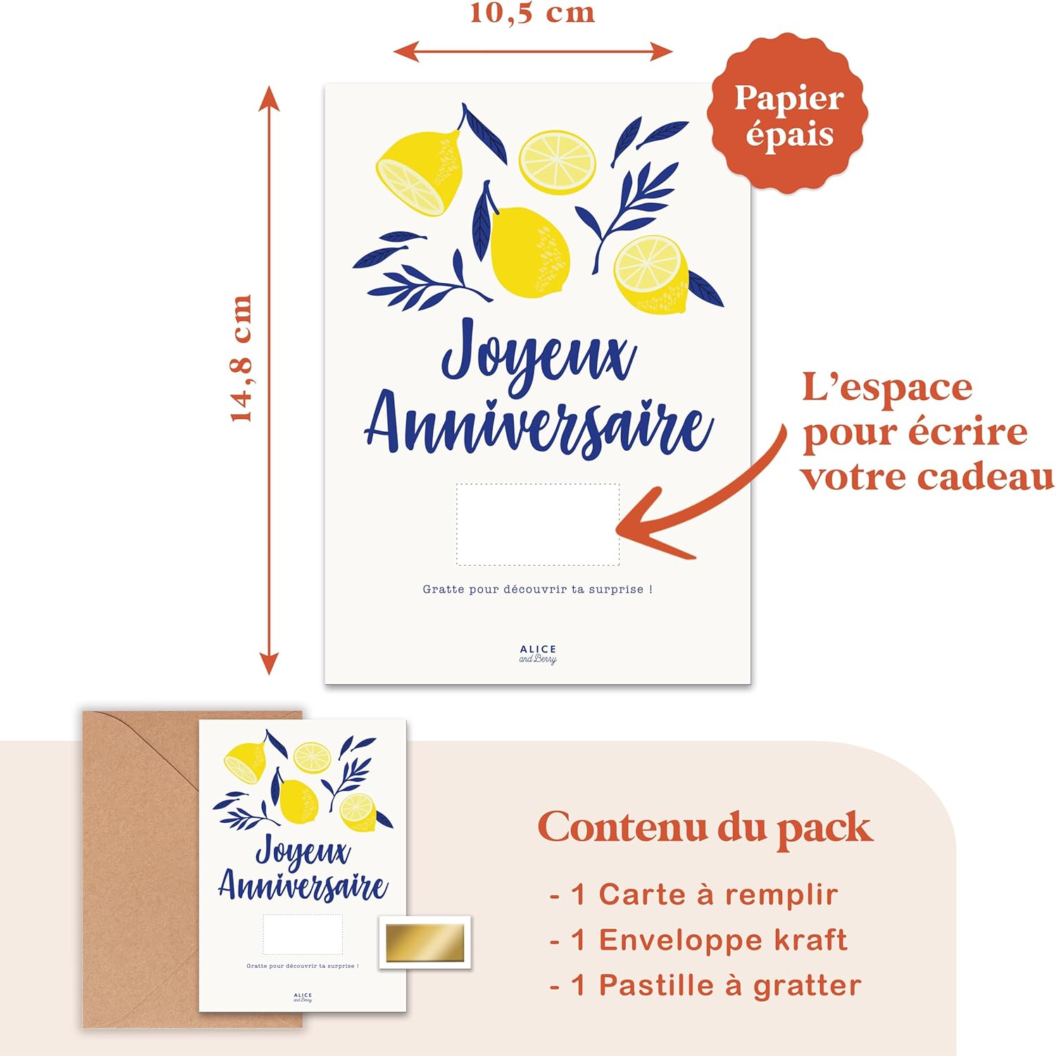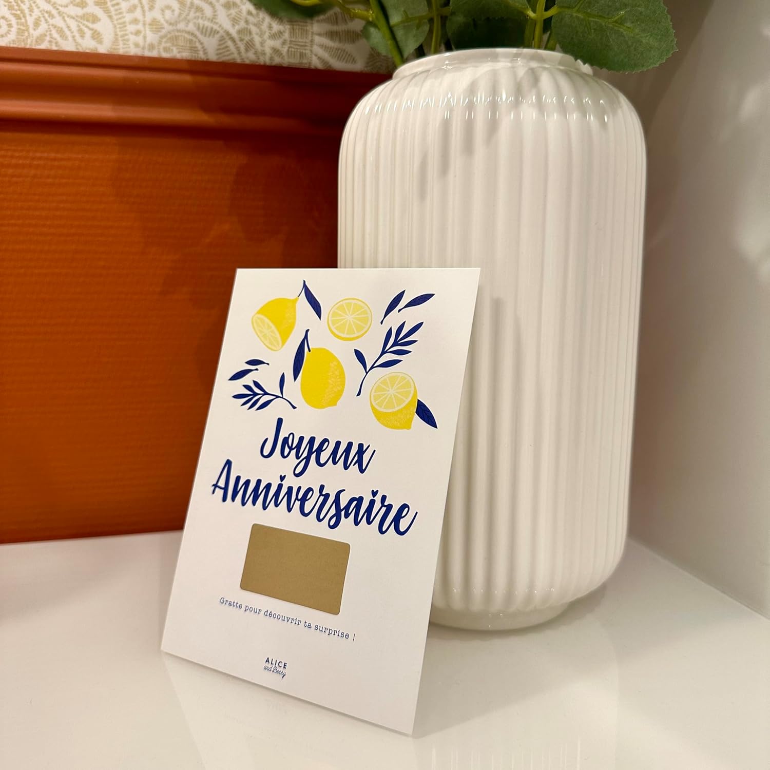 [🔍 Gratta per svelare il regalo]: crea una sorpresa indimenticabile! Grattando rivela il regalo che hai scritto con cura, per un momento di suspense. [🎁 Perfetto per esperienze regalo]: massaggio, fuga, paracadutismo, tatuaggio... Trasforma i tuoi regali immateriali in un'esperienza emozionante con un biglietto elegante. [✍️ Personalizzazione facile]: scrivi semplicemente il regalo a sorpresa, coprilo con il blocco per appunti e regalalo! Personalizzazione semplice per un effetto “wow”. [🍋 Design fresco ed estivo]: il biglietto presenta un design adorabile con limoni luminosi, che apportano un tocco luminoso e festoso al tuo regalo di compleanno. [💌 Carta di qualità premium]: realizzata in carta spessa e opaca da 350 g, questa carta in formato A6 garantisce eleganza e durata, accompagnata da una busta kraft abbinata.