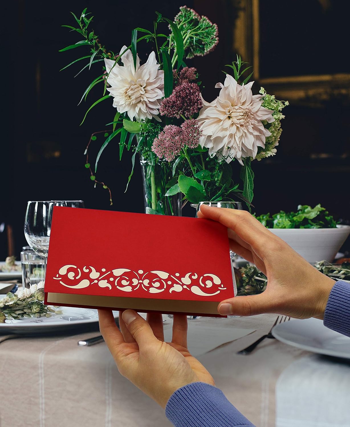 UN REGALO ELEGANTE – il biglietto di auguri perfetto per presentare buoni, regali in contanti e inviti con auguri affettuosi in modo elegante; la carta fornisce un ambiente festoso per la festa di compleanno, l'invito a cena o una cena romantica a lume di candela BUSTA INCLUSA - puoi regalare subito la carta; una busta bianca coordinata e una copertura protettiva in cellophane sono già incluse con il biglietto OPERE D'ARTE AFFASCINANTI – quando il biglietto di auguri in filigrana viene aperto, si apre una tavola festiva con champagne per festeggiare e abbastanza spazio per i tuoi desideri MEMORIA DURATURA – questo bellissimo biglietto piegato affascinerà e rimarrà nella memoria del destinatario; è adatto anche per una cena al ristorante, una festa, un cocktail party, una cena celebrativa, un buono ristorante, un ricevimento festivo e come biglietto d'invito a un banchetto o evento. OTTIMO REGALO DI GRUPPO - ottimo come regalo condiviso e buono regalo; con il marchio FeinKnick offriamo anche altri biglietti pop-up dal design gradevole per tutti gli eventi più belli: dai un'occhiata!