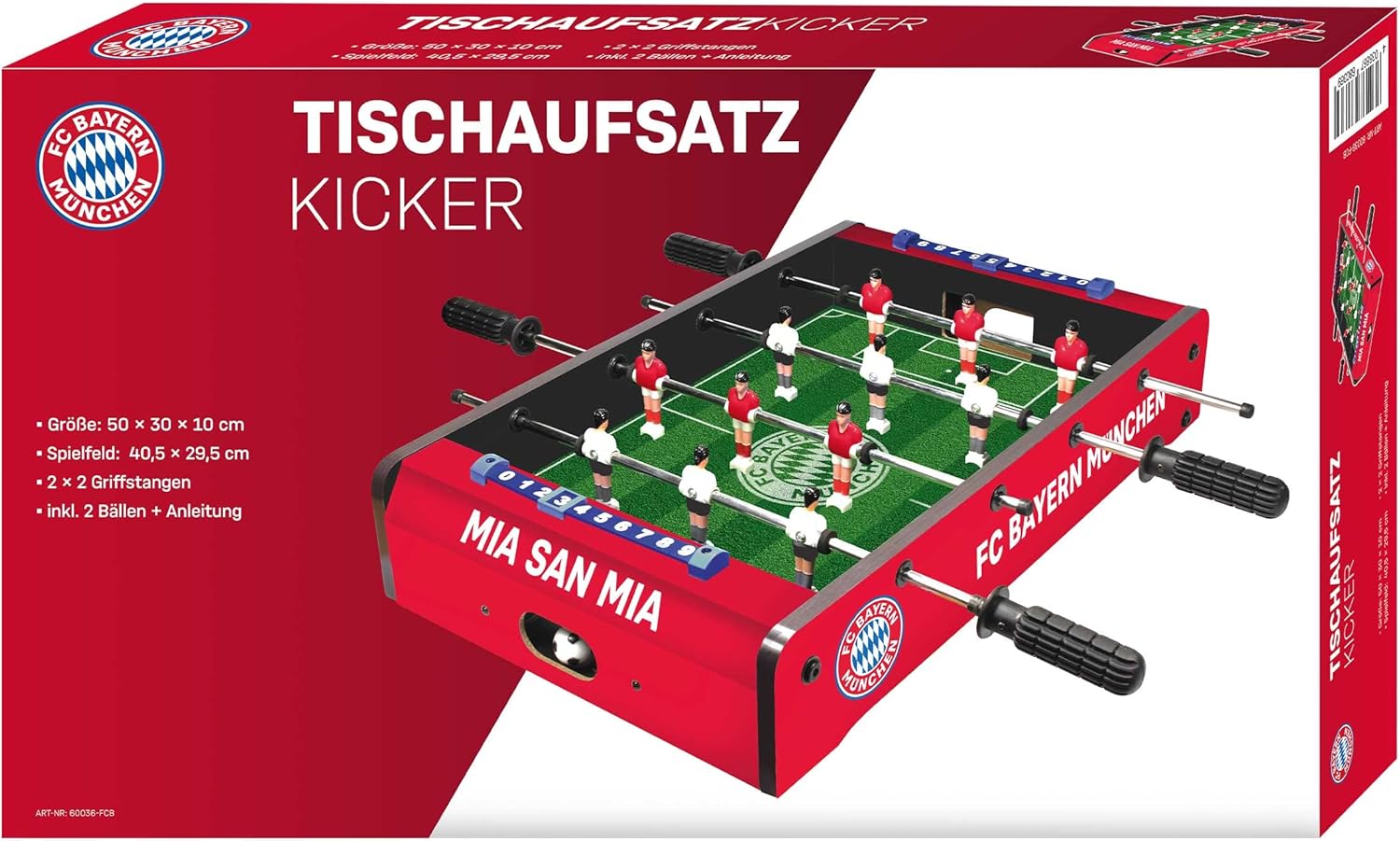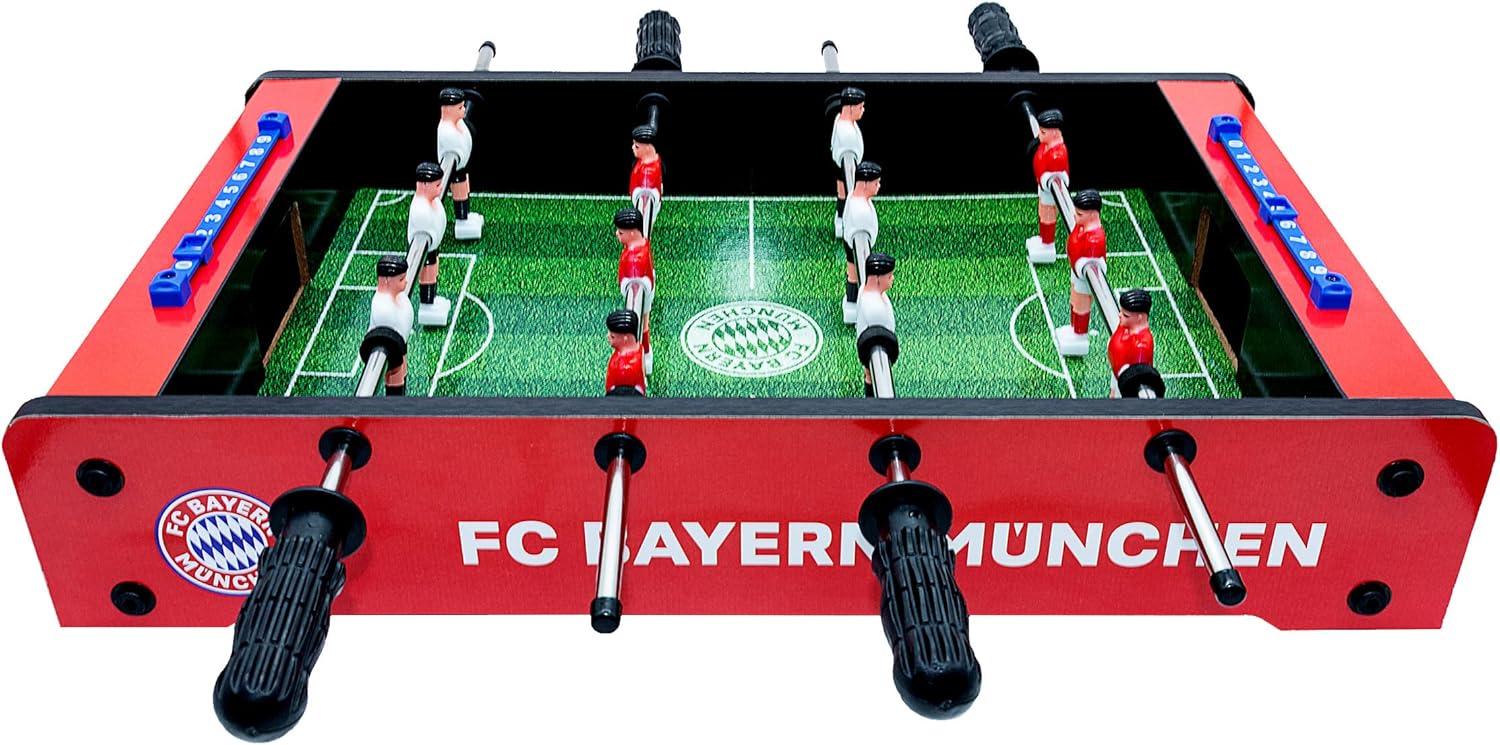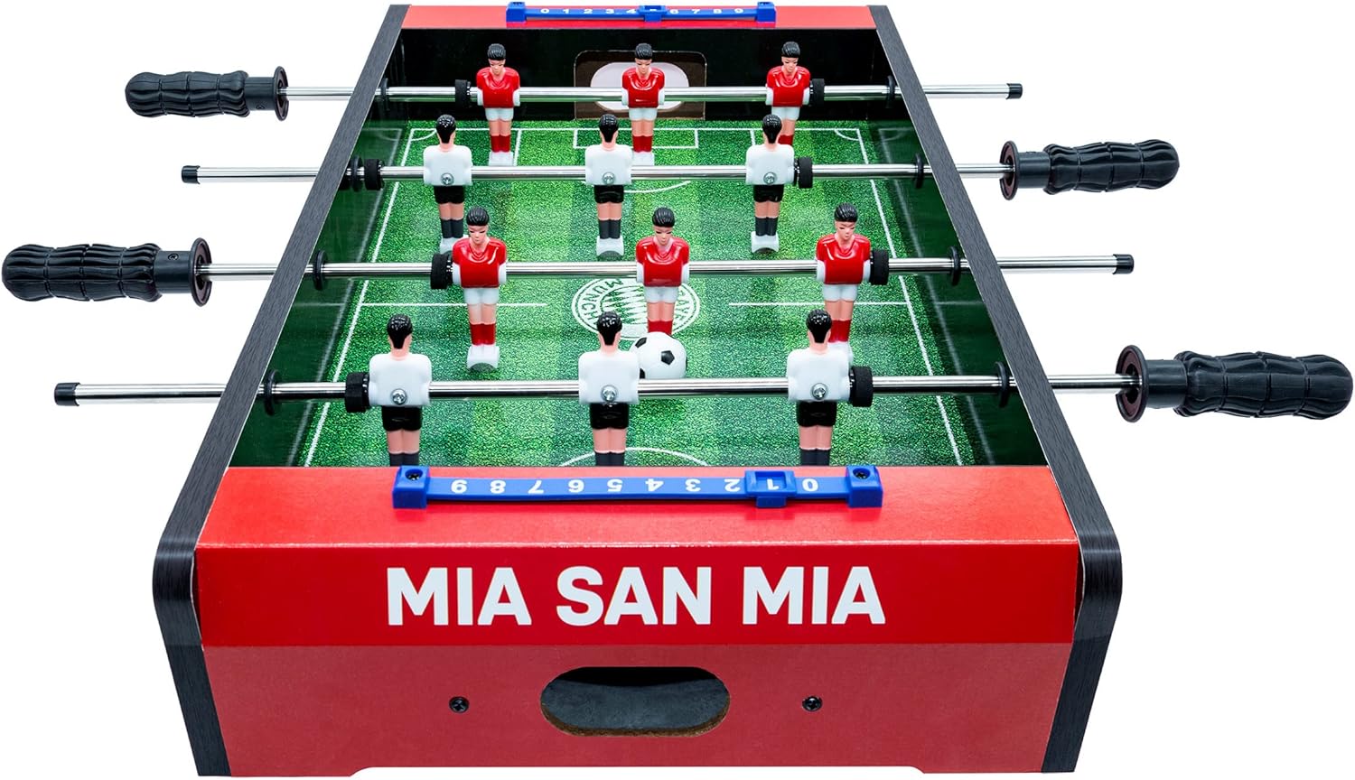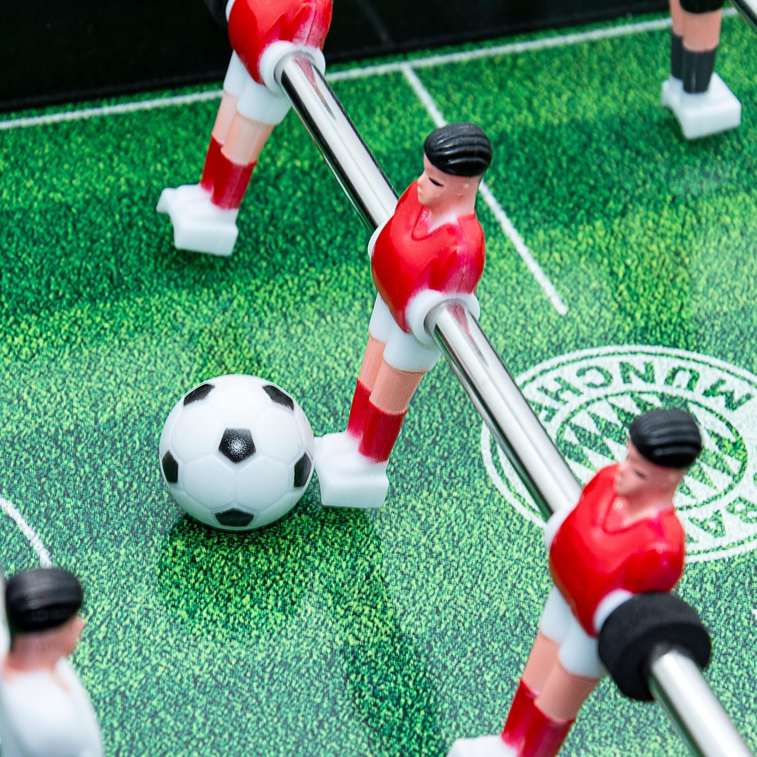 Design autentico del club: l'originale tavolo da biliardino dell'FC Bayern Monaco porta l'esperienza dello stadio a casa tua ed è perfetto per i fan fedeli e per i futuri campioni. Dimensioni pratiche: il biliardino misura 50 x 31 x 10 cm in modo compatto. Il campo di gioco misura 40,5 x 29,5 cm, ideale per spazi ridotti e montaggi e smontaggi rapidi. Massimo divertimento: robuste aste in metallo e due palline dal diametro di 2,5 cm garantiscono un gioco preciso e il massimo divertimento, adatto a grandi e piccini. Caratteristiche di sicurezza: consigliato per bambini dagli 8 anni in su. Non adatto a bambini di età inferiore a 3 anni in quanto contiene piccole parti che potrebbero essere ingerite. Design portatile: con un peso di soli 2,2 kg, il biliardino è facile da trasportare e si adatta a qualsiasi tavolo, sia a casa che all'aperto.