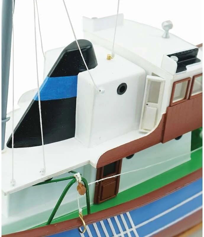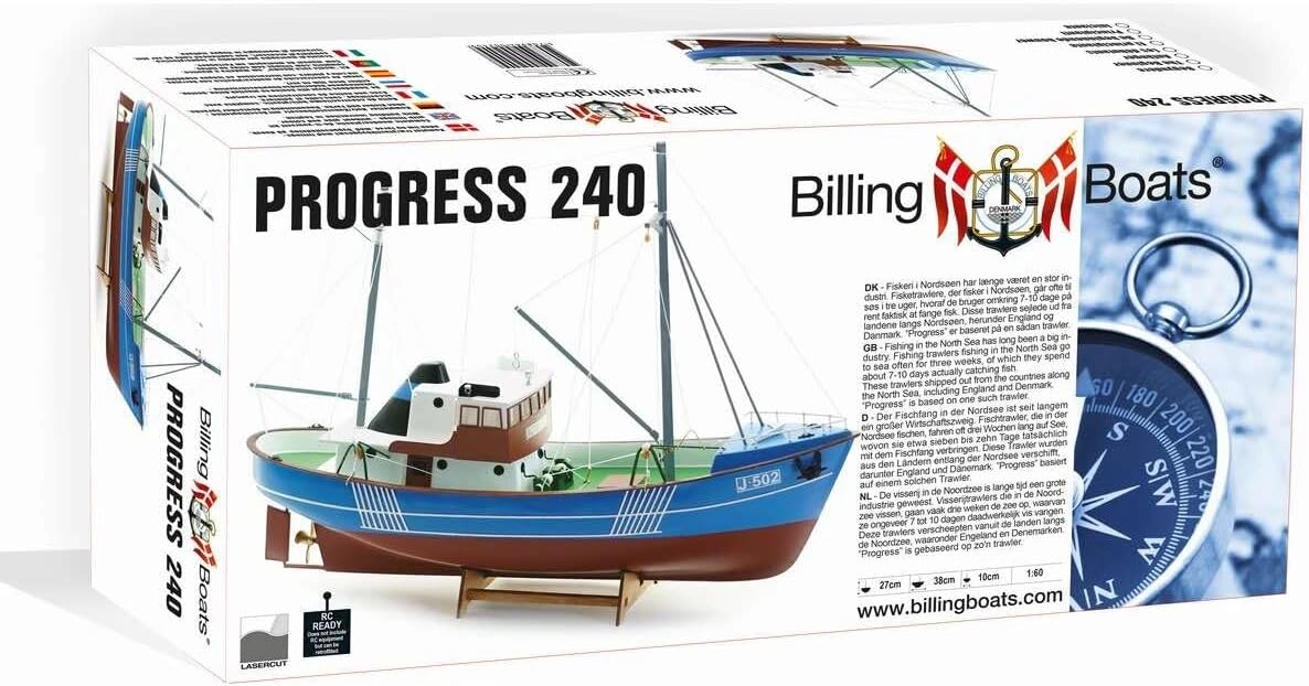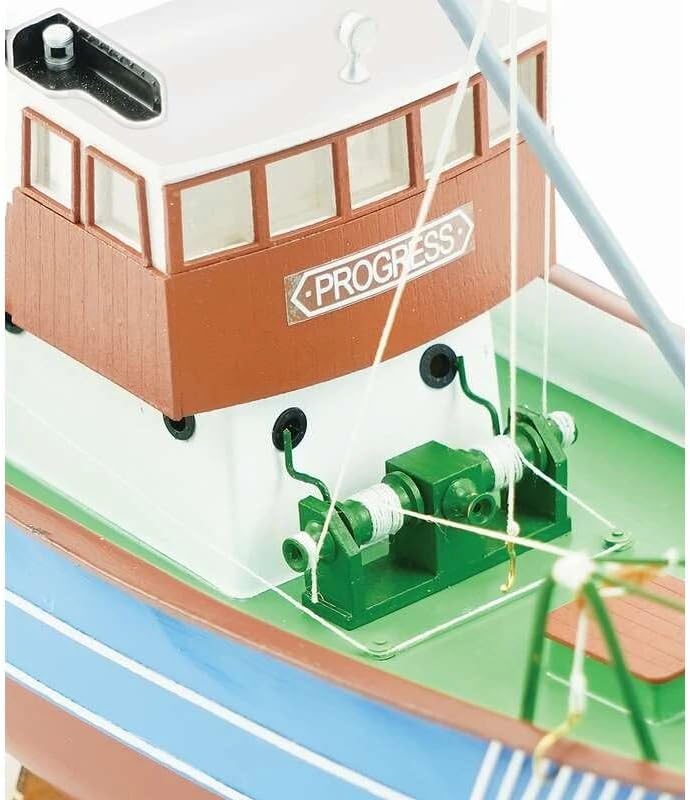 Scala 1:60 Lunghezza: 38 cm Larghezza: 10 cm Altezza: 27 cm La pesca nel Mare del Nord è stata per lungo tempo una grande industria. I rimorchiatori di fondo che pescano nel Mare del Nord spesso escono in mare per tre settimane, di cui trascorrono effettivamente dai 7 ai 10 giorni a catturare il pesce. Queste navi partivano dai paesi lungo il Mare del Nord, tra cui Inghilterra e Danimarca. "Progress" è basato su uno di questi rimorchiatori. Scafo in plastica pretagliato Predisposizione per telecomando (*NON* contiene gli elementi necessari per la motorizzazione) Manuale di istruzioni con foto dettagliate a colori