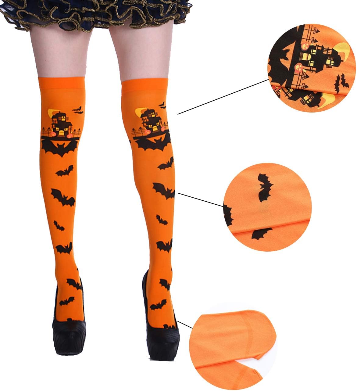 Materiali morbidi: queste calze di Halloween sono realizzate al 95% in poliestere e al 5% in fibre di spandex che sono elastiche, si sentono morbide e comode, godrai di un'esperienza diversa da indossare con le calze sopra il ginocchio, possono servirti per molto tempo. Motivi: diversi stili di calze di Halloween, come pipistrelli, ragni, casa stregata, luci di zucca e così via, sono stampati sulle calze, creando un'atmosfera di terrore. Questo cattura ogni intricato dettaglio di tutti i tuoi temi di Halloween preferiti. Porterebbero sicuramente fantastici agli outfit di tutti i giorni e in giorni speciali come Halloween. Ampie applicazioni: le calze lunghe e solide sono appropriate per molte occasioni come Halloween, cosplay, performance sul palco o altre feste in costume, aiuteranno molto l'atmosfera della festa o del festival. Regalo perfetto e abbinamento perfetto: possono essere la scelta regalo perfetta per i tuoi cari in vacanza, come il Crazy Socks Day, Halloween, ecc. Regali innovativi per tua madre, moglie, figlia, fidanzata, nonna o sorella. È facile per loro abbinare molti costumi non solo con i costumi di Halloween, ma anche con gonne, pantaloncini o altri indumenti quotidiani. Dimensioni della calza: la lunghezza delle calze è di circa 27 pollici (68 cm), forte ed elastica e adatta ai piedi della maggior parte delle persone. Ogni confezione contiene 1 paio di calzini. La lunghezza delle calze è più lunga del ginocchio, che è una buona modifica delle linee delle gambe.