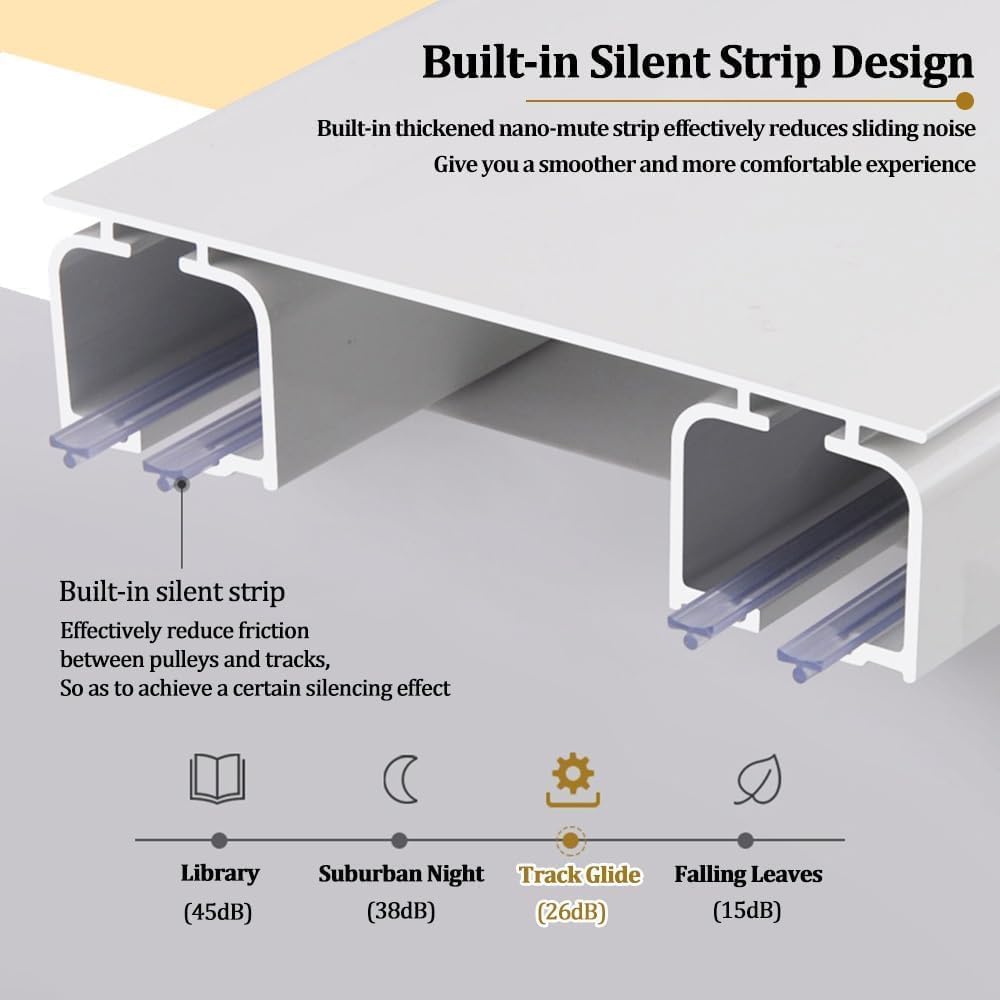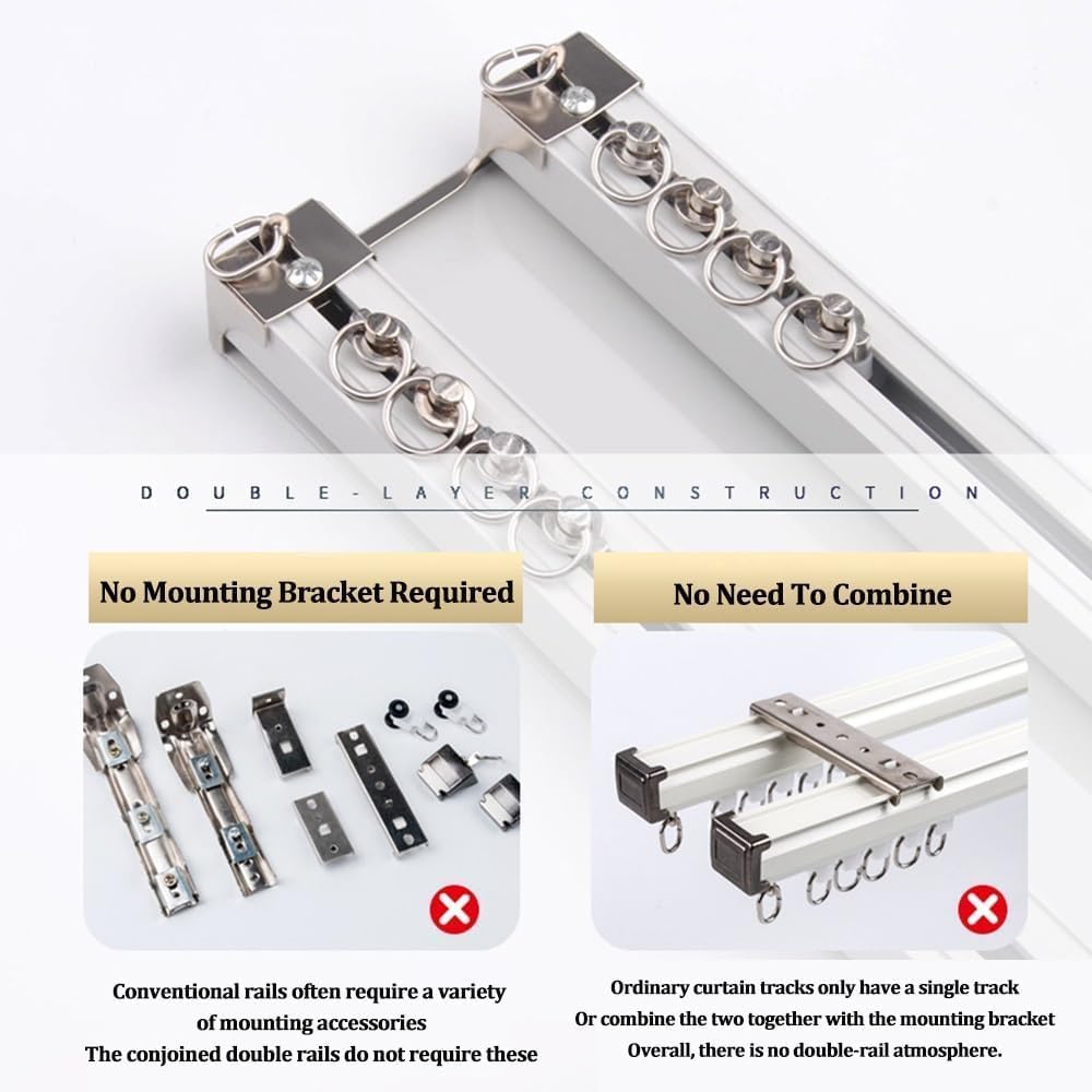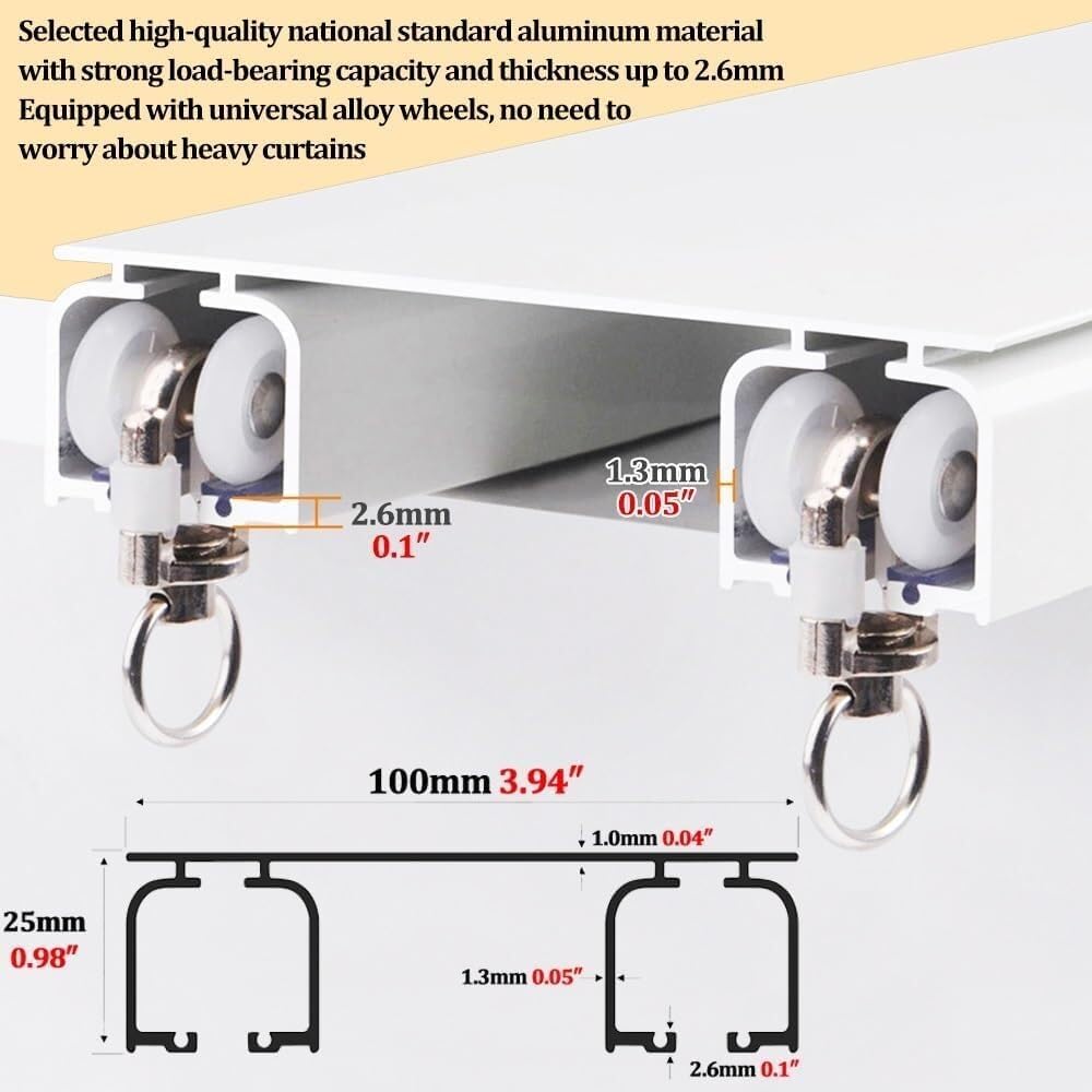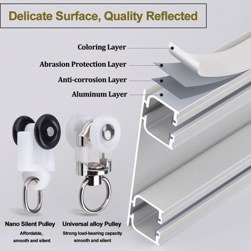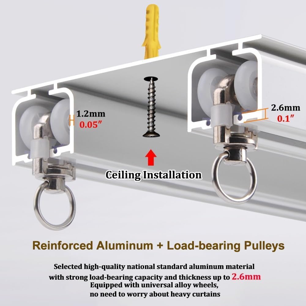 Migliore qualità: l'asta Theain è realizzata in alluminio con uno spessore di carico fino a 2,6 mm, quindi è senza paura. Theain Rail è realizzato in processo multistrato resistente e luminoso di lunga durata. Seleziona due tipi di pulegge per soddisfare le esigenze di ambienti diversi. Design: un design congiunto su rotaia uno strato di ofains e uno strato di filato bellissimo andnerous. Installato senza le staffe di montaggio Installazione a punzonatura diretta Binario più comodo Striscia di gomma silenziosa incorporata che riduce efficacemente il rumore dello scorrimento Ampi accessori: non c'è bisogno di preoccuparsi di accessori mancanti. Il kit di binari contiene tutto il necessario per installare il binario a soffitto. La bulloneria include: cingoli, rulli, tappi terminali, raccordi a vite. Nota: i connettori per binari sono inclusi al metro per un supporto aggiuntivo. Ampia gamma di applicazioni: il kit binario può essere facilmente installato in qualsiasi spazio come soggiorno, doccia, camera da letto, finestra, camper, hotel, ospedale, aula, spogliatoio o ovunque tu voglia. Binario leggero ma robusto, forte capacità di carico, pulegge mute