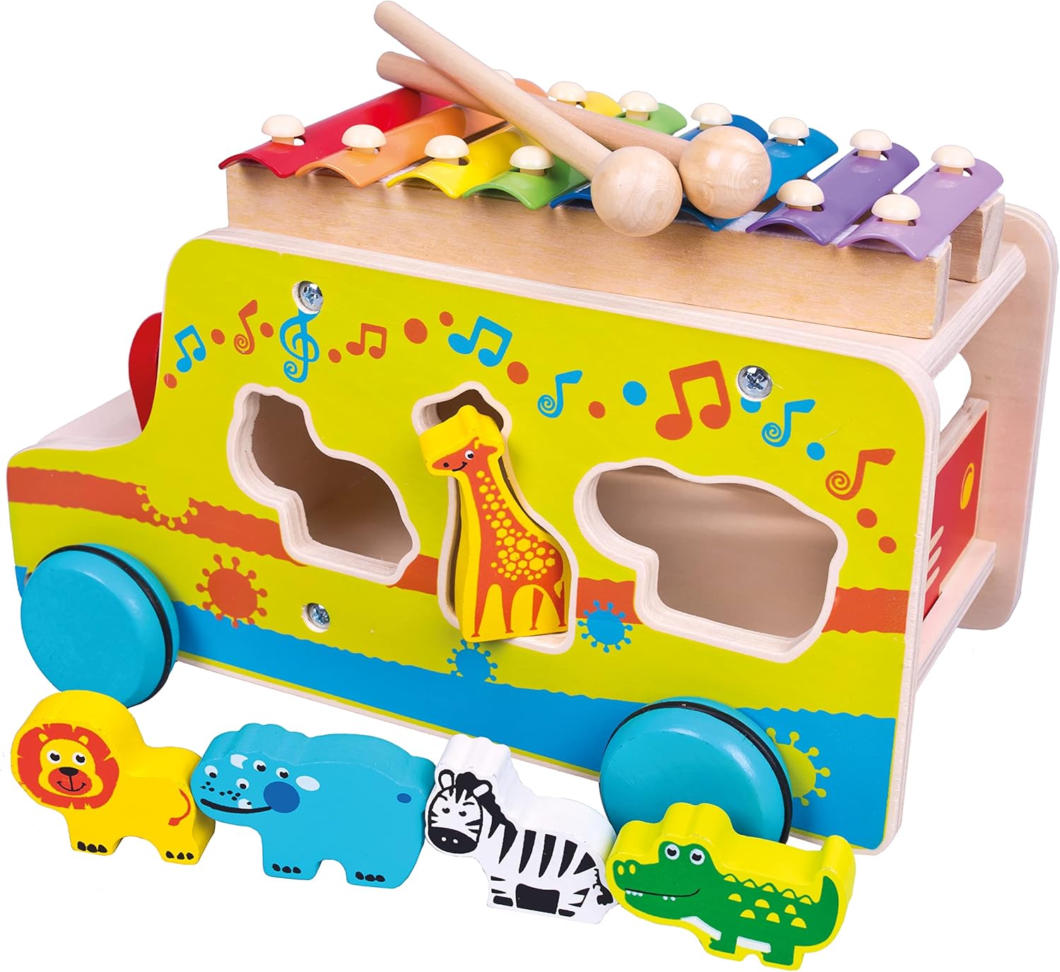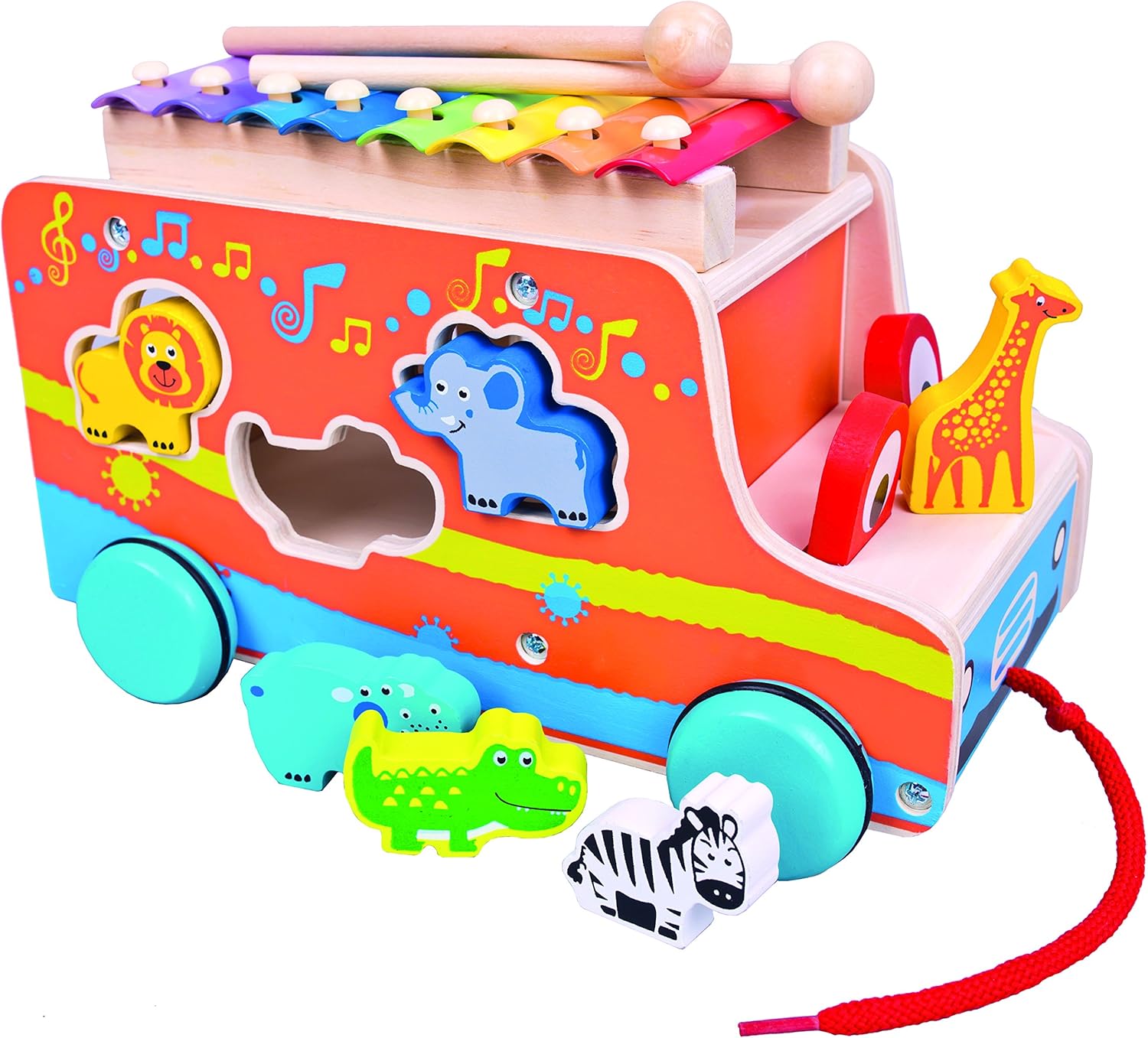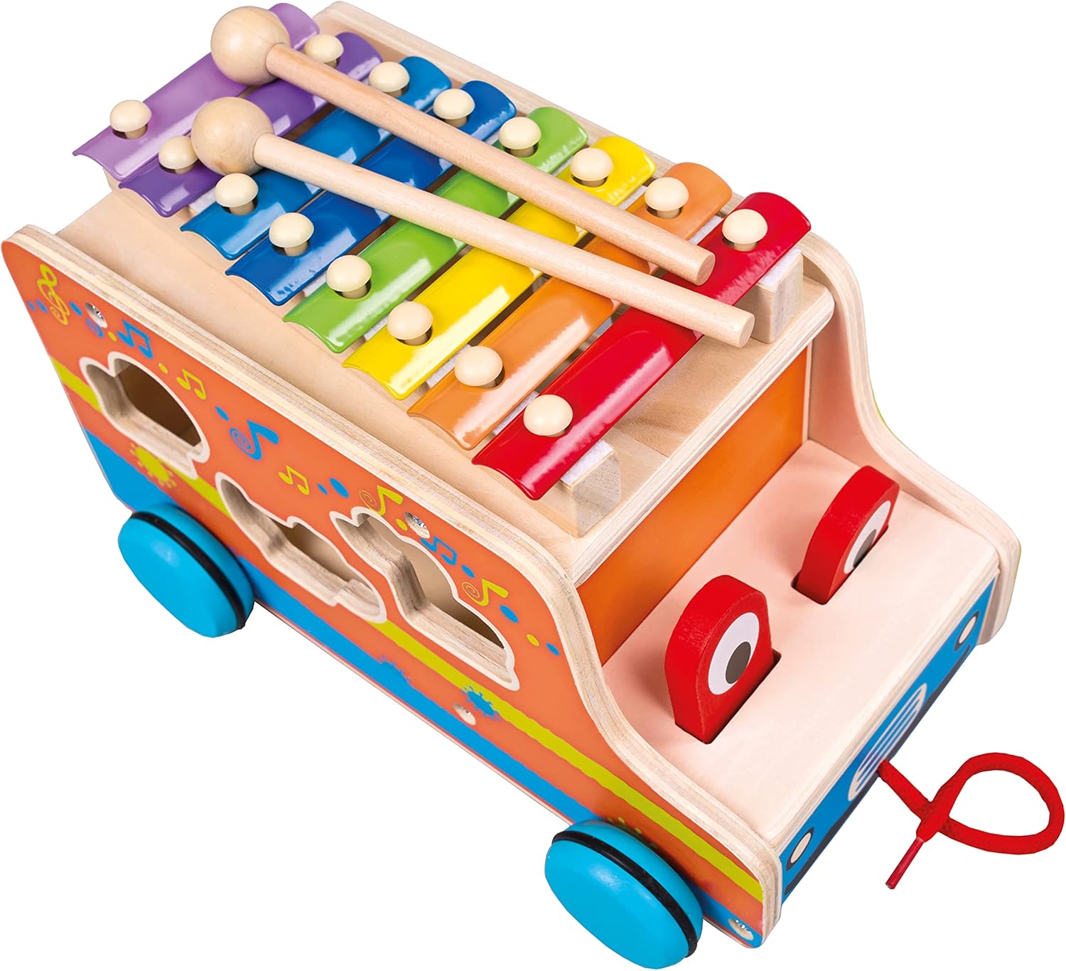 Giocattolo multifunzione per apprendere diverse abilità! 1. un giocattolo trainabile che aiuta i bambini a fare i primi passi e ad esercitare l'equilibrio. 2. i fori nella macchina per dividere i passeggeri/le forme di diversi animali aiutano a sviluppare l'intelletto e il ragionamento logico, nonché ad allenare le capacità motorie. 3. Grazie ad un design sofisticato e al funzionamento del giocattolo, i bambini imparano a riconoscere i principali colori e animali. 4. lo xilofono con 8 toni e due bacchette sul tetto della macchinina dà ai bambini la possibilità di conoscere le basi della musicalità e di sviluppare il loro talento musicale. Dimensioni: 24 × 13.5 × 18.5 cm - età consigliata: 18m +